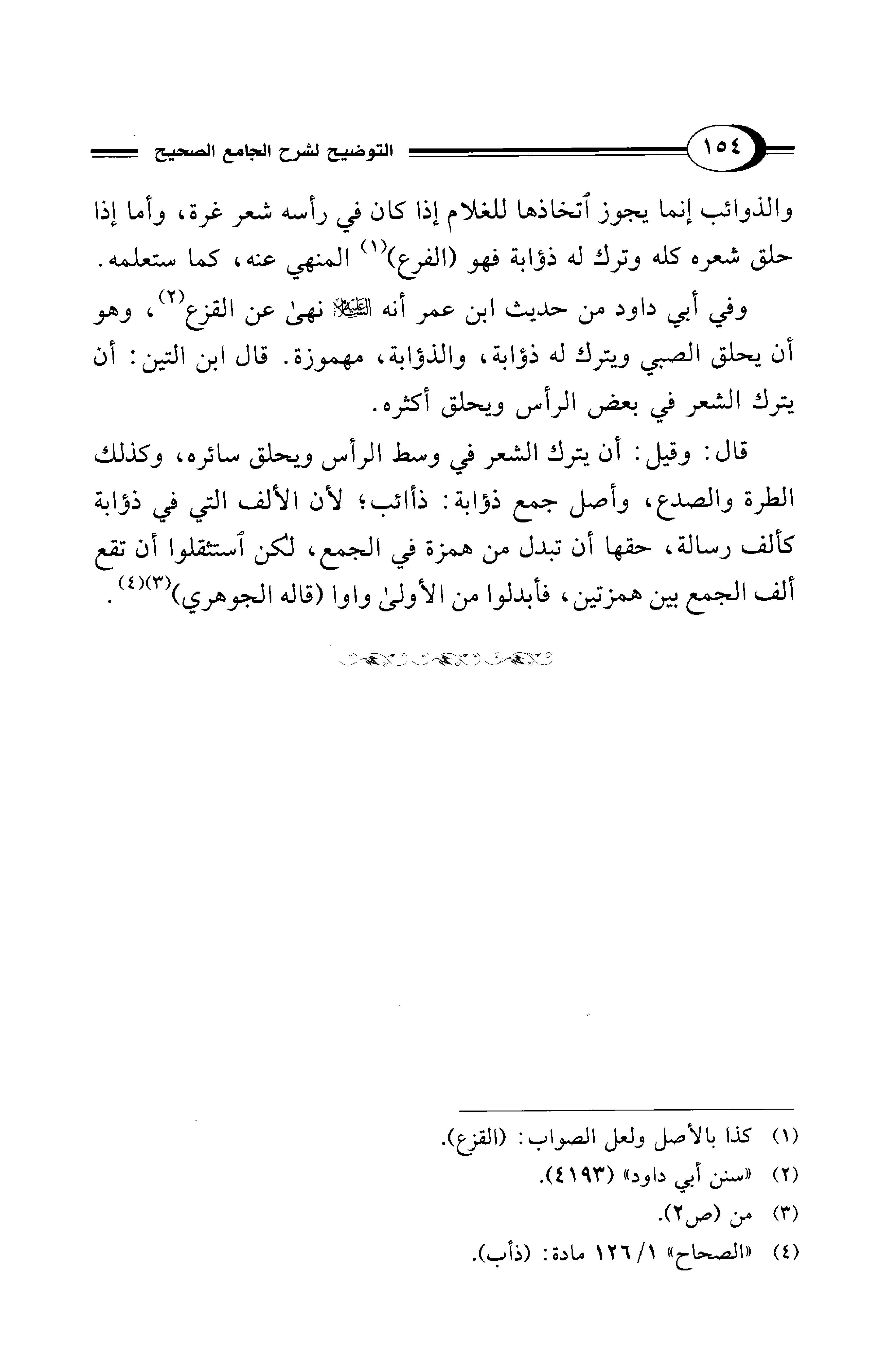قال: وقيل: أن يترك الشعر في وسط الرأس ويحلق سائره، وكذلك الطرة والصدع، وأصل جمع ذؤابة: ذأائب؛ لأن الألف التي في ذؤابة كألف رسالة، حقها أن تبدل من همزة في الجمع، لكن استثقلوا أن تقع ألف الجمع بين همزتين، فأبدلوا من الأولى واوا (قاله الجوهري) (¬3) (¬4).