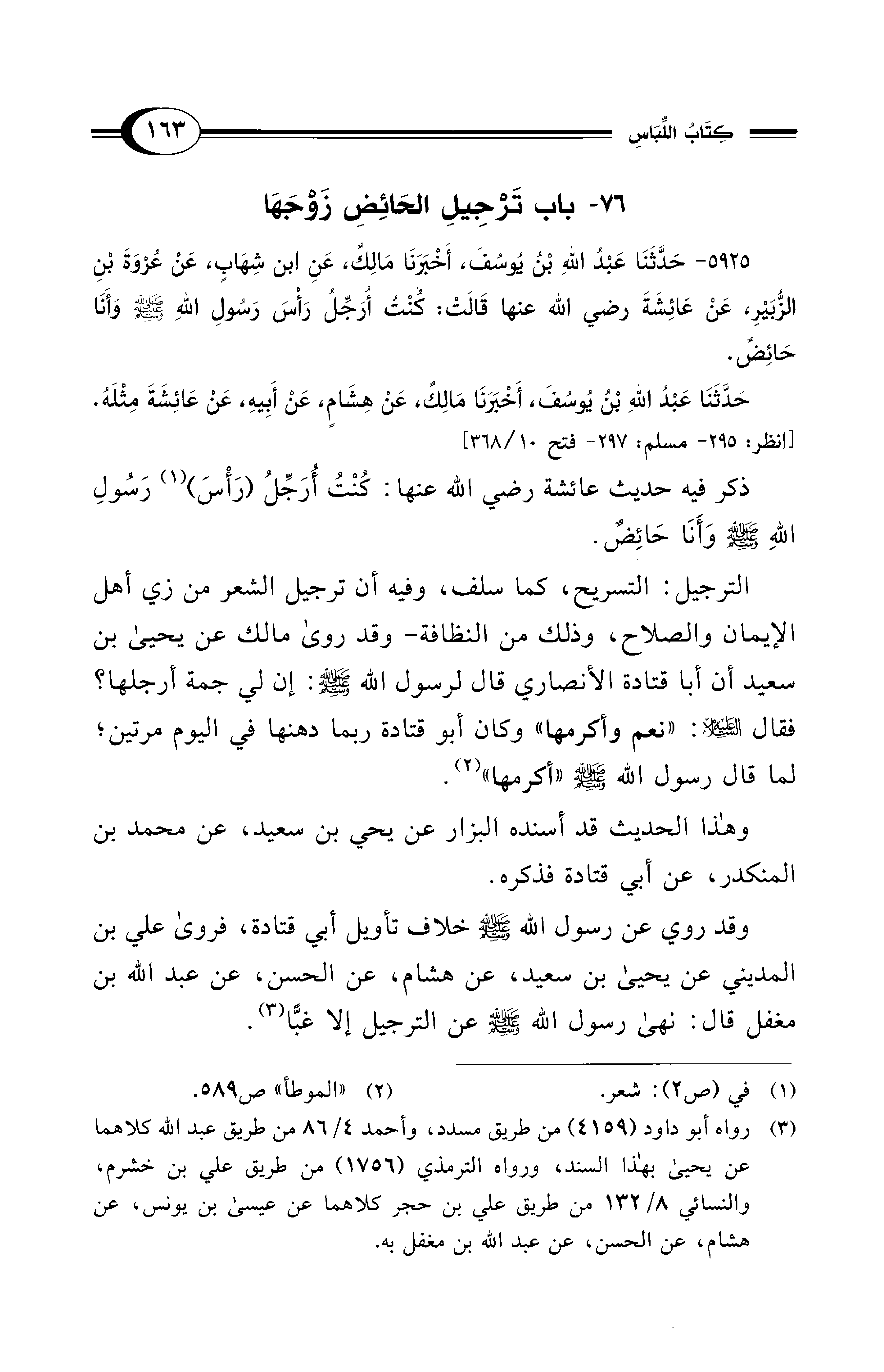 5925 - حَدَّثَنَا عَبْدُ اللهِ بْنُ يُوسُفَ، أَخْبَرَنَا مَالِكٌ، عَنِ ابْنِ شِهَابٍ، عَنْ عُرْوَةَ بْنِ الزُّبَيْرِ، عَنْ عَائِشَةَ - رضي الله عنها - قَالَتْ: كُنْتُ أُرَجِّلُ رَأْسَ رَسُولِ اللهِ - صلى الله عليه وسلم - وَأَنَا حَائِضٌ.