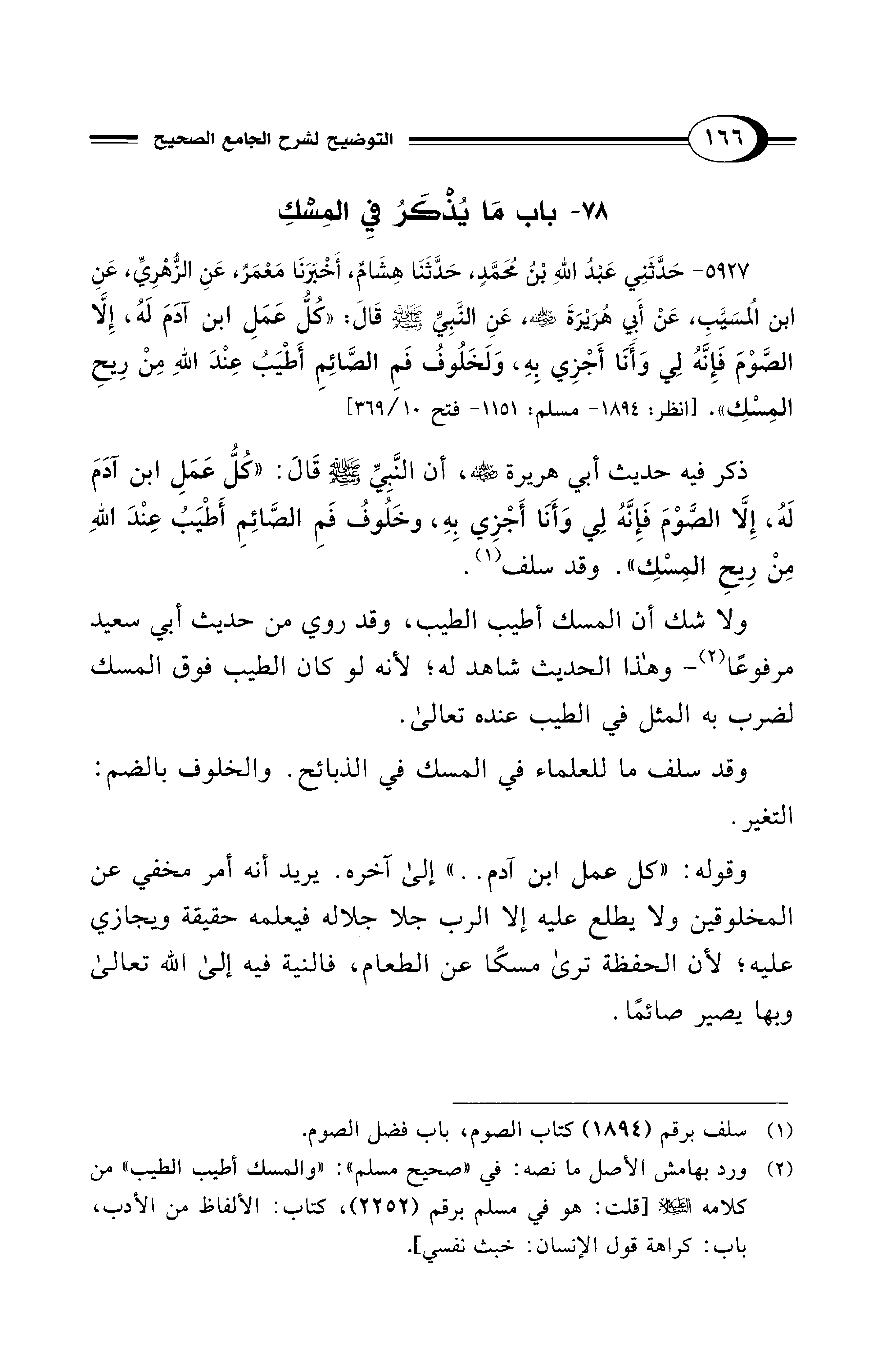 5927 - حَدَّثَنِي عَبْدُ اللهِ بْنُ مُحَمَّدٍ، حَدَّثَنَا هِشَامٌ، أَخْبَرَنَا مَعْمَرٌ، عَنِ الزُّهْرِيِّ، عَنِ ابْنِ الْمُسَيَّبِ، عَنْ أَبِي هُرَيْرَةَ - رضي الله عنه -، عَنِ النَّبِيِّ - صلى الله عليه وسلم - قَالَ: «كُلُّ عَمَلِ ابْنِ آدَمَ لَهُ، إِلاَّ الصَّوْمَ فَإِنَّهُ لِي وَأَنَا أَجْزِي بِهِ، وَلَخَلُوفُ فَمِ الصَّائِمِ أَطْيَبُ عِنْدَ اللهِ مِنْ رِيحِ الْمِسْكِ». [انظر: 1894 - مسلم: 1151 - فتح 10/ 369]