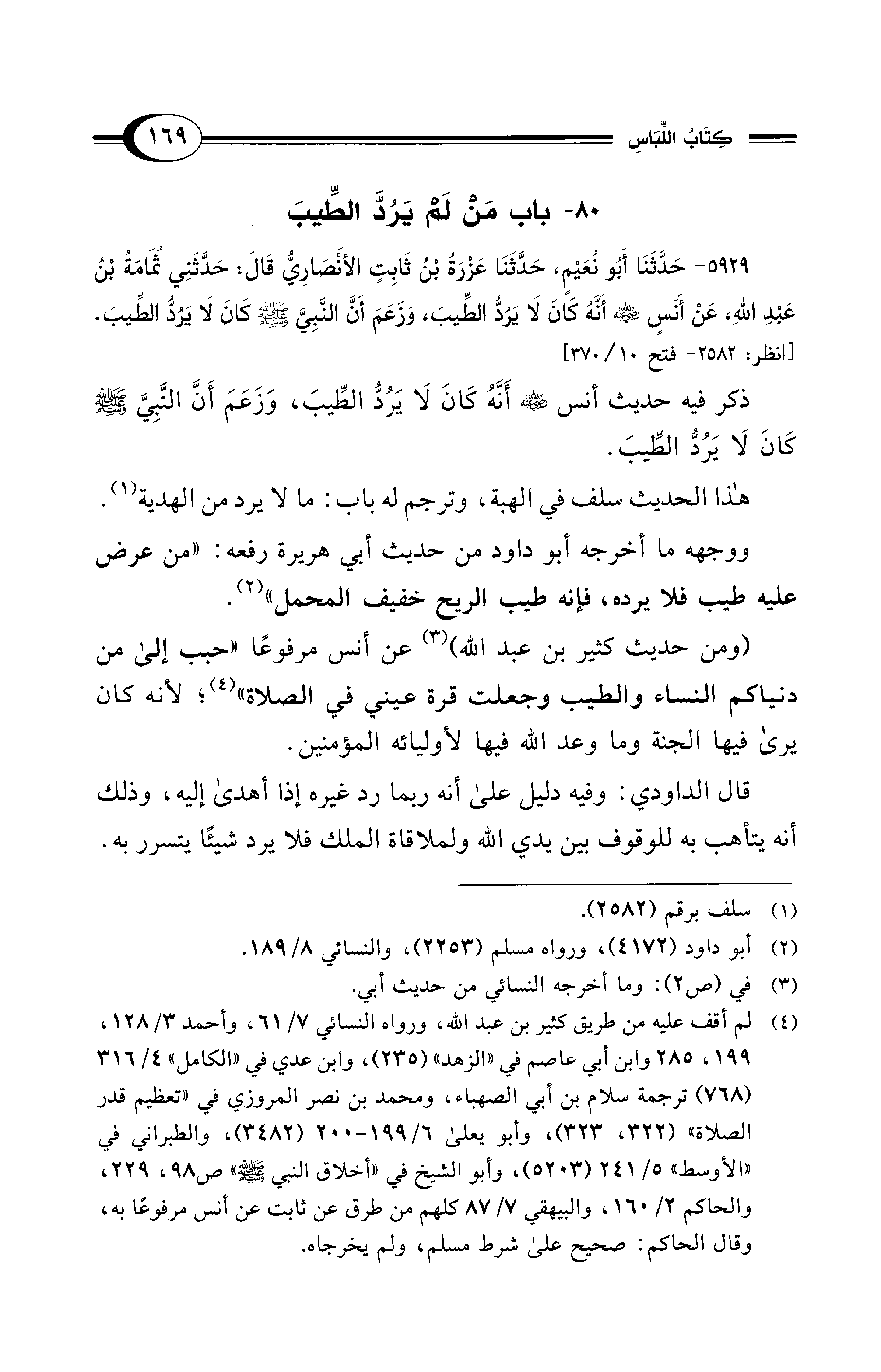 5929 - حَدَّثَنَا أَبُو نُعَيْمٍ، حَدَّثَنَا عَزْرَةُ بْنُ ثَابِتٍ الأَنْصَاريُّ قَالَ: حَدَّثَنِي ثُمَامَةُ بْنُ عَبْدِ اللهِ، عَنْ أَنَسٍ - رضي الله عنه - أَنَّهُ كَانَ لاَ يَرُدُّ الطِّيبَ، وَزَعَمَ أَنَّ النَّبِيَّ - صلى الله عليه وسلم - كَانَ لاَ يَرُدُّ الطِّيبَ. [انظر: 2582 - فتح 10/ 370]