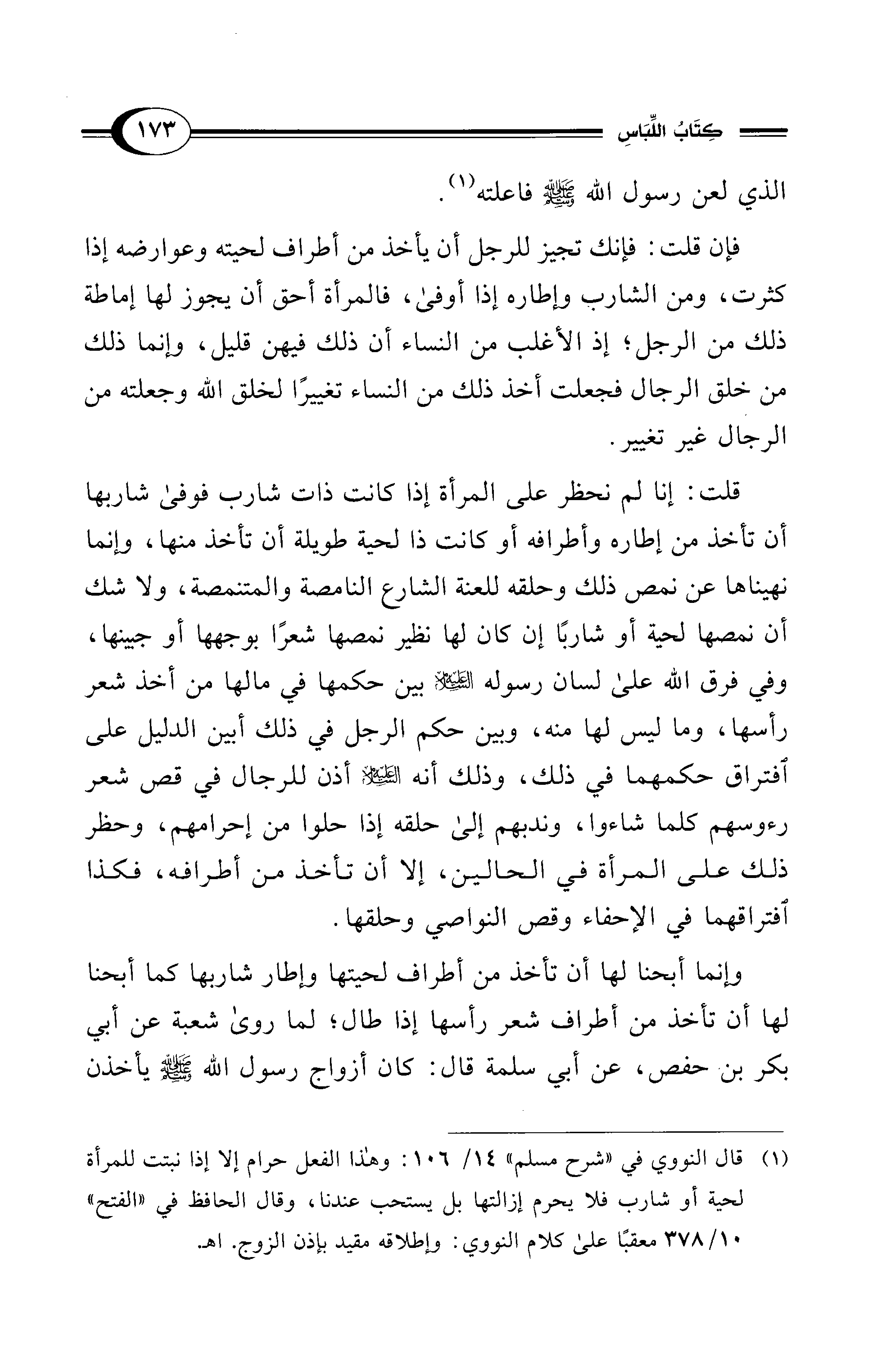 قلت: إنا لم نحظر على المرأة إذا كانت ذات شارب فوفى شاربها أن تأخذ من إطاره وأطرافه أو كانت ذا لحية طويلة أن تأخذ منها، وإنما نهيناها عن نمص ذلك وحلقه للعنة الشارع النامصة والمتنمصة، ولا شك أن نمصها لحية أو شاربًا إن كان لها نظير نمصها شعرًا بوجهها أو جبينها، وفي فرق الله على لسان رسوله - عليه السلام - بين حكمها في مالها من أخذ شعر رأسها، وما ليس لها منه، وبين حكم الرجل في ذلك أبين الدليل على افتراق حكمهما في ذلك، وذلك أنه - عليه السلام - أذن للرجال في قص شعر رءوسهم كلما شاءوا، وندبهم إلى حلقه إذا حلوا من إحرامهم، وحظر ذلك على المرأة في الحالين، إلا أن تأخذ من أطرافه، فكذا افتراقهما في الإحفاء وقص النواصي وحلقها.