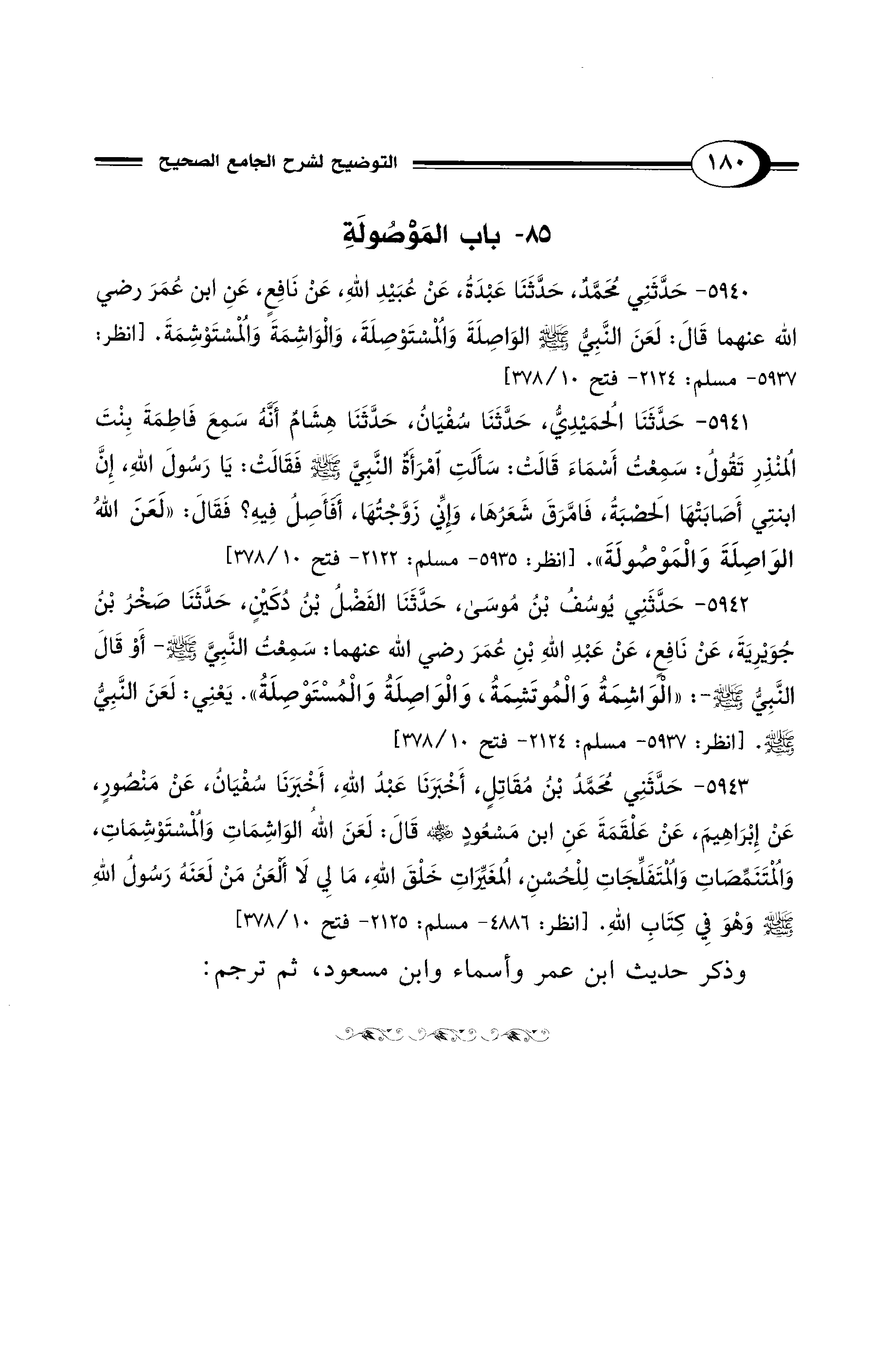 5940 - حَدَّثَنِي مُحَمَّدٌ، حَدَّثَنَا عَبْدَةُ، عَنْ عُبَيْدِ اللهِ، عَنْ نَافِعٍ، عَنِ ابْنِ عُمَرَ - رضي الله عنهما - قَالَ: لَعَنَ النَّبِيُّ - صلى الله عليه وسلم - الْوَاصِلَةَ وَالْمُسْتَوْصِلَةَ، وَالْوَاشِمَةَ وَالْمُسْتَوْشِمَةَ. [انظر: