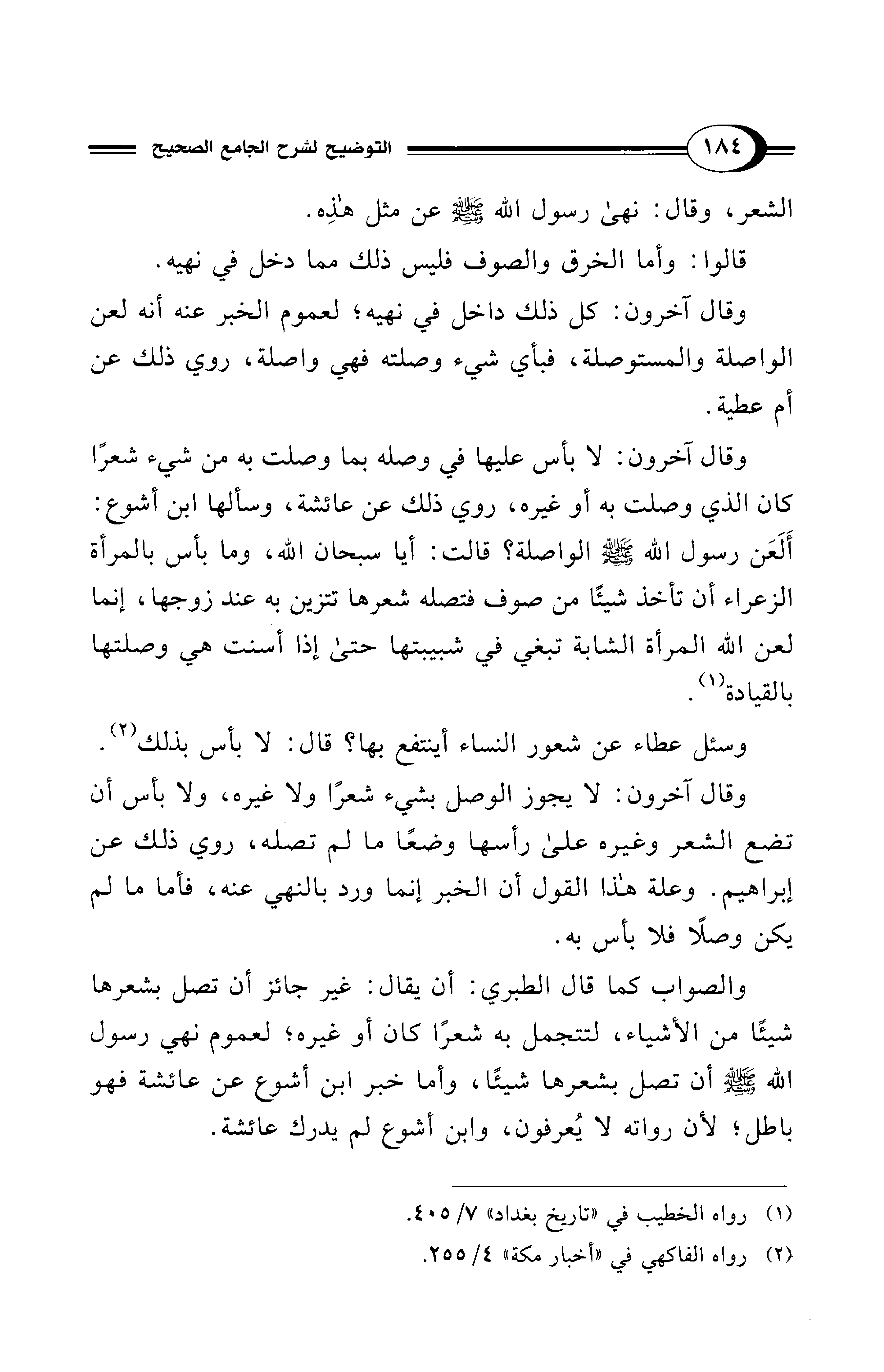 والصواب كما قال الطبري: أن يقال: غير جائز أن تصل بشعرها شيئًا من الأشياء، لتتجمل به شعرًا كان أو غيره؛ لعموم نهي رسول الله - صلى الله عليه وسلم - أن تصل بشعرها شيئًا، وأما خبر ابن أشوع عن عائشة فهو باطل؛ لأن رواته لا يُعرفون، وابن أشوع لم يدرك عائشة.