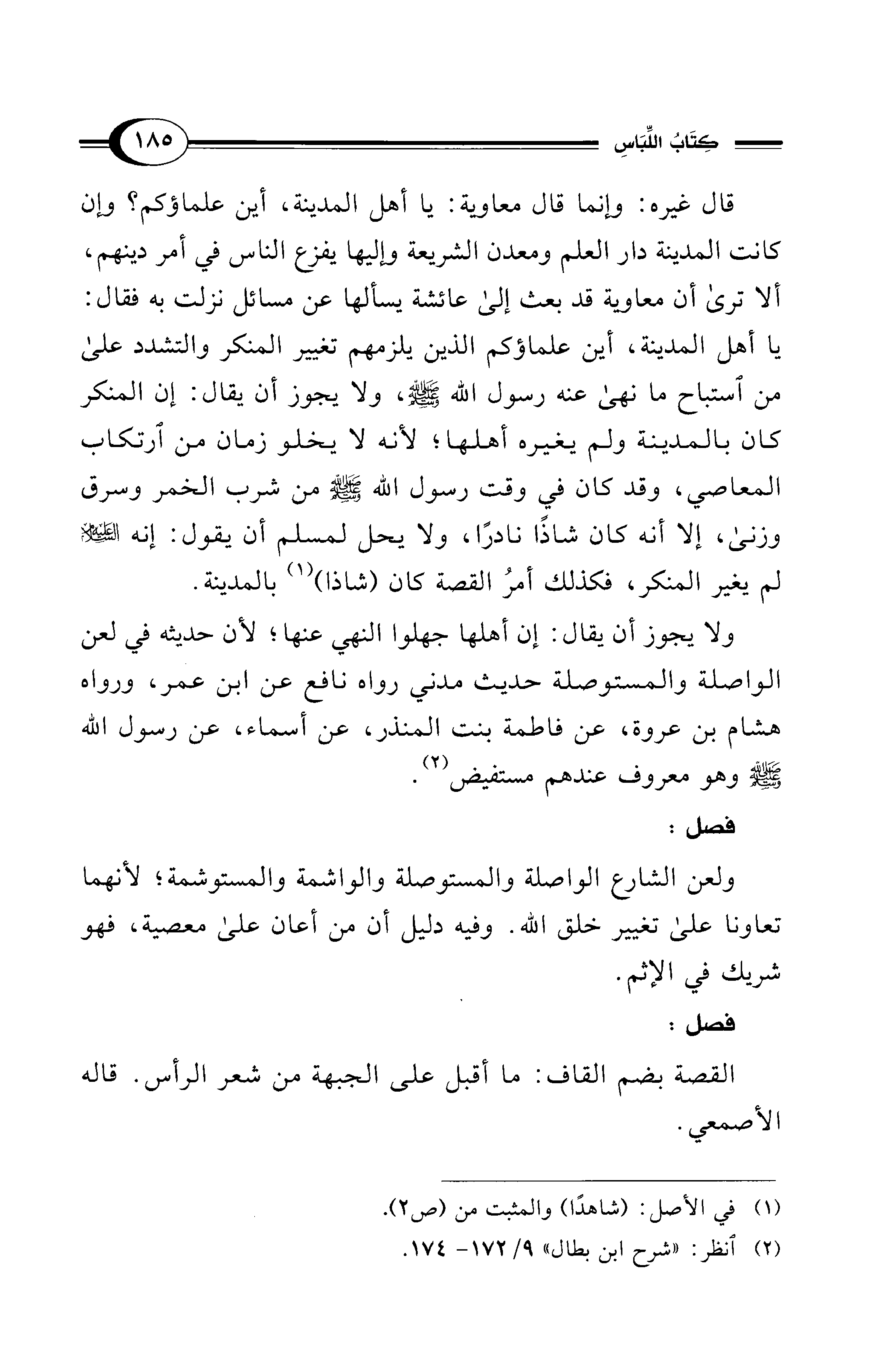 ولا يجوز أن يقال: إن أهلها جهلوا النهي عنها؛ لأن حديثه في لعن الواصلة والمستوصلة حديث مدني رواه نافع عن ابن عمر، ورواه هشام بن عروة، عن فاطمة بنت المنذر، عن أسماء، عن رسول الله - صلى الله عليه وسلم -وهو معروف عندهم مستفيض (¬2).