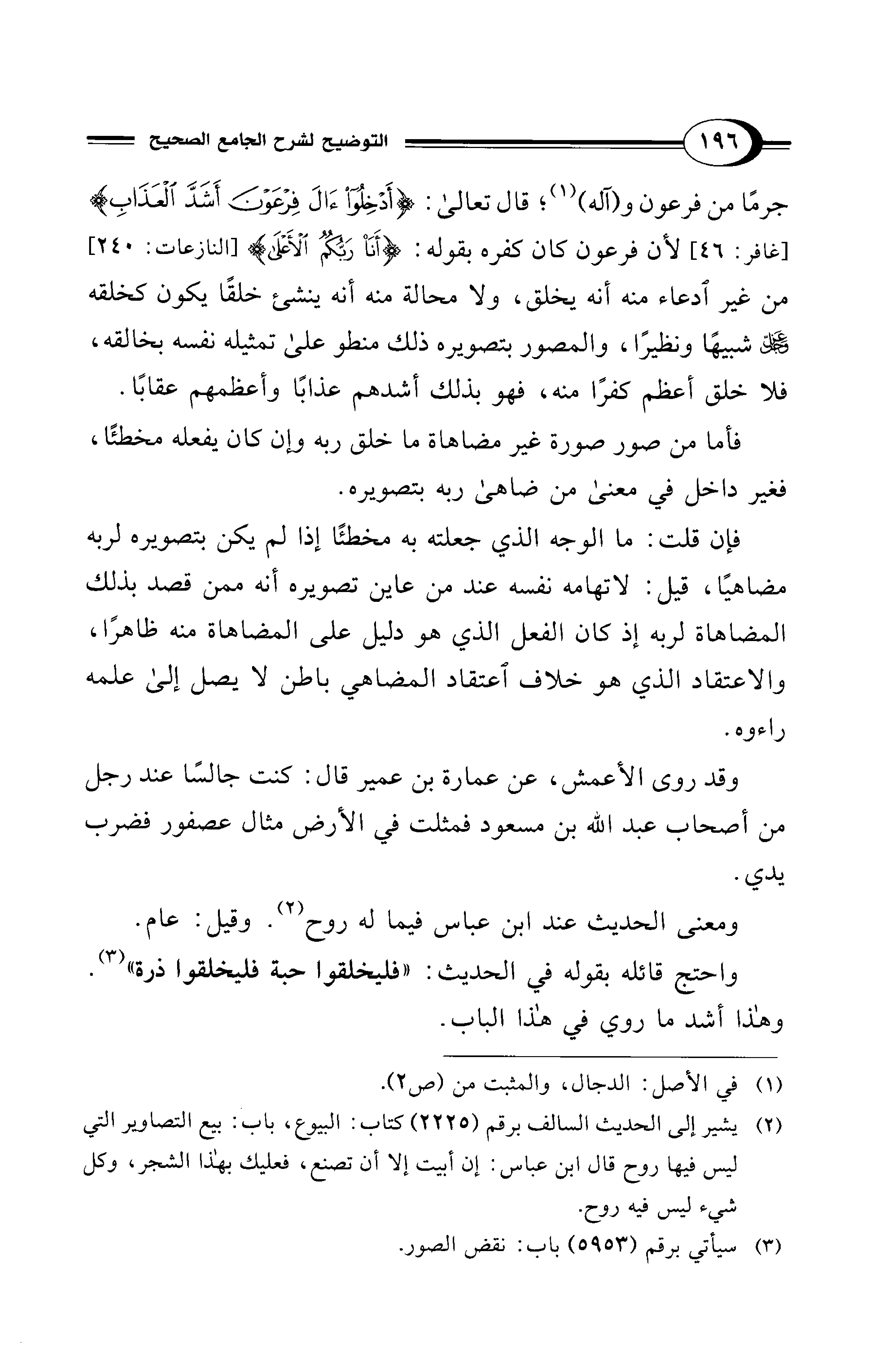 جرمًا من فرعون و (آله) (¬1)؛ قال تعالى: {أَدْخِلُوا آلَ فِرْعَوْنَ أَشَدَّ الْعَذَابِ} [غافر: 46] لأن فرعون كان كفره بقوله: {أَنَا رَبُّكُمُ الْأَعْلَى} [النازعات: 240] من غير ادعاء منه أنه يخلق، ولا محالة منه أنه ينشئ خلقًا يكون كخلقه -عَزَّ وَجَلَّ- شبيهًا ونظيرًا، والمصور بتصويره ذلك منطو على تمثيله نفسه بخالقه، فلا خلق أعظم كفرًا منه، فهو بذلك أشدهم عذابًا وأعظمهم عقابًا.