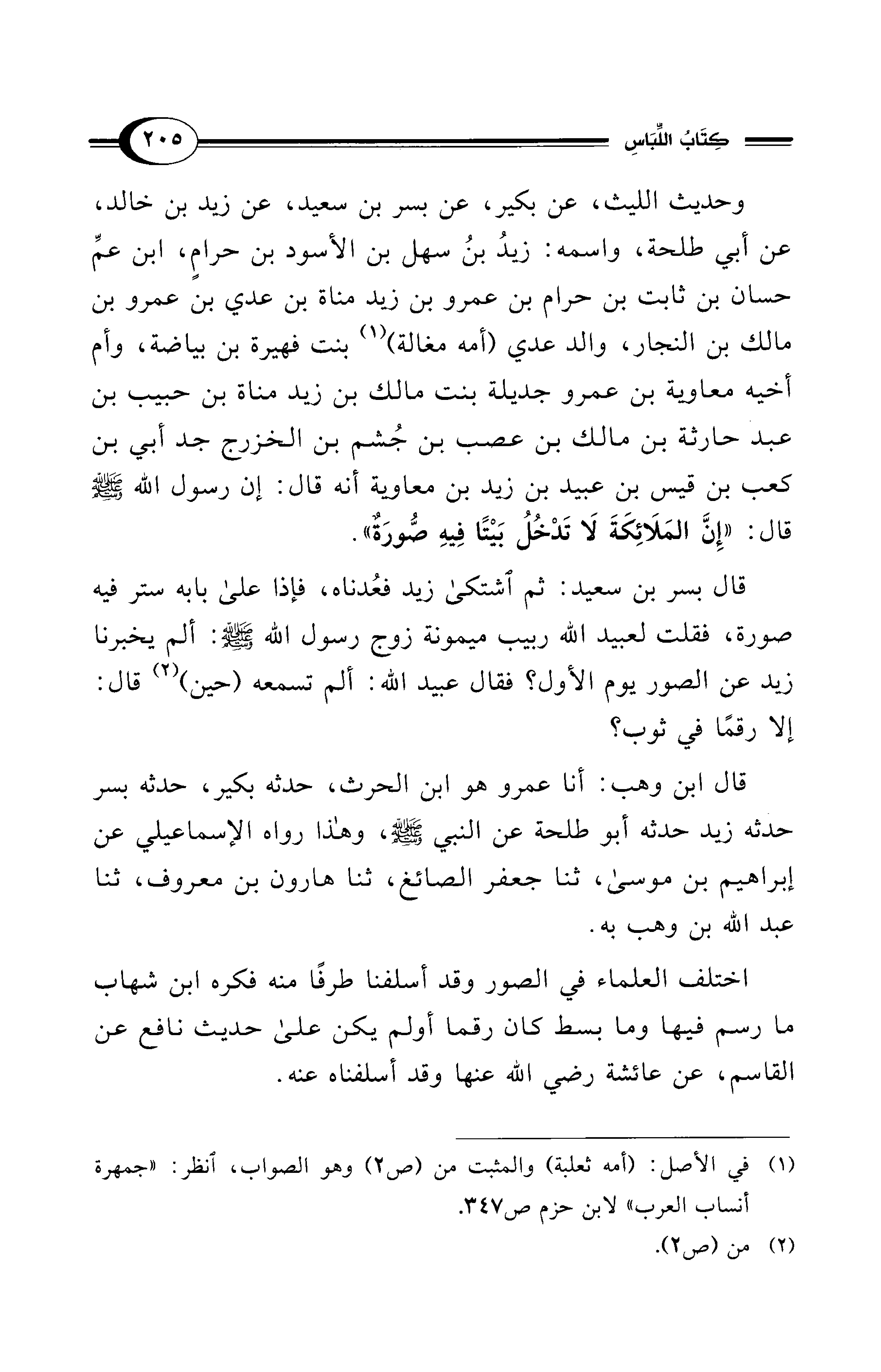 قال بسر بن سعيد: ثم اشتكى زيد فعُدناه، فإذا على بابه ستر فيه صورة، فقلت لعبيد الله ربيب ميمونة زوج رسول الله - صلى الله عليه وسلم: ألم يخبرنا زيد عن الصور يوم الأول؟ فقال عبيد الله: ألم تسمعه (حين) (¬2) قال: إلا رقمًا في ثوب؟