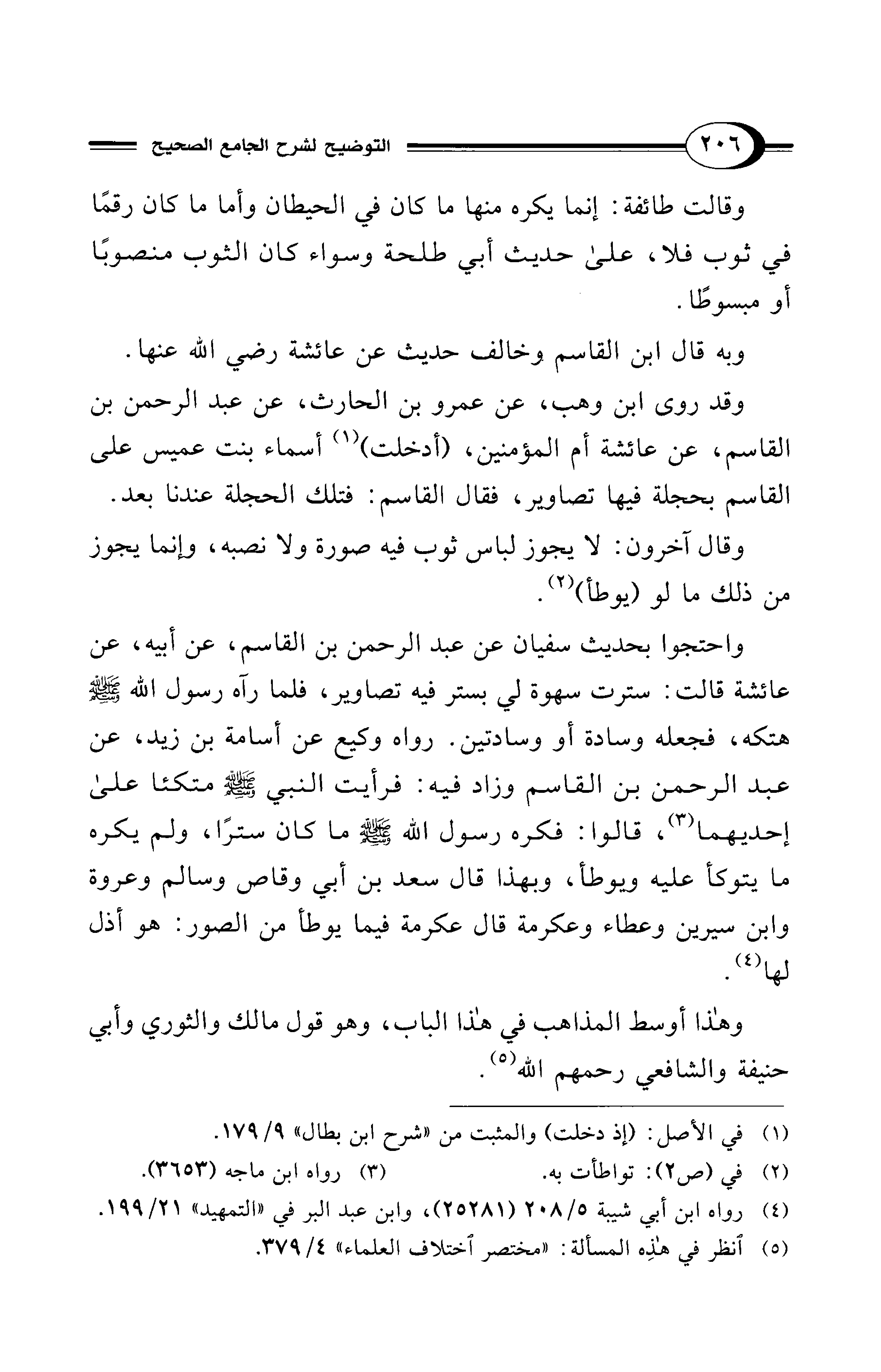 واحتجوا بحديث سفيان عن عبد الرحمن بن القاسم، عن أبيه، عن عائشة قالت: سترت سهوة لي بستر فيه تصاوير، فلما رآه رسول الله - صلى الله عليه وسلم - هتكه، فجعله وسادة أو وسادتين. رواه وكيع عن أسامة بن زيد، عن عبد الرحمن بن القاسم وزاد فيه: فرأيت النبي - صلى الله عليه وسلم - متكئا على إحديهما (¬3)، قالوا: فكره رسول الله - صلى الله عليه وسلم - ما كان سترًا، ولم يكره ما يتوكأ عليه ويوطأ، وبهذا قال سعد بن أبي وقاص وسالم وعروة وابن سيرين وعطاء وعكرمة قال عكرمة فيما يوطأ من الصور: هو أذل لها (¬4).