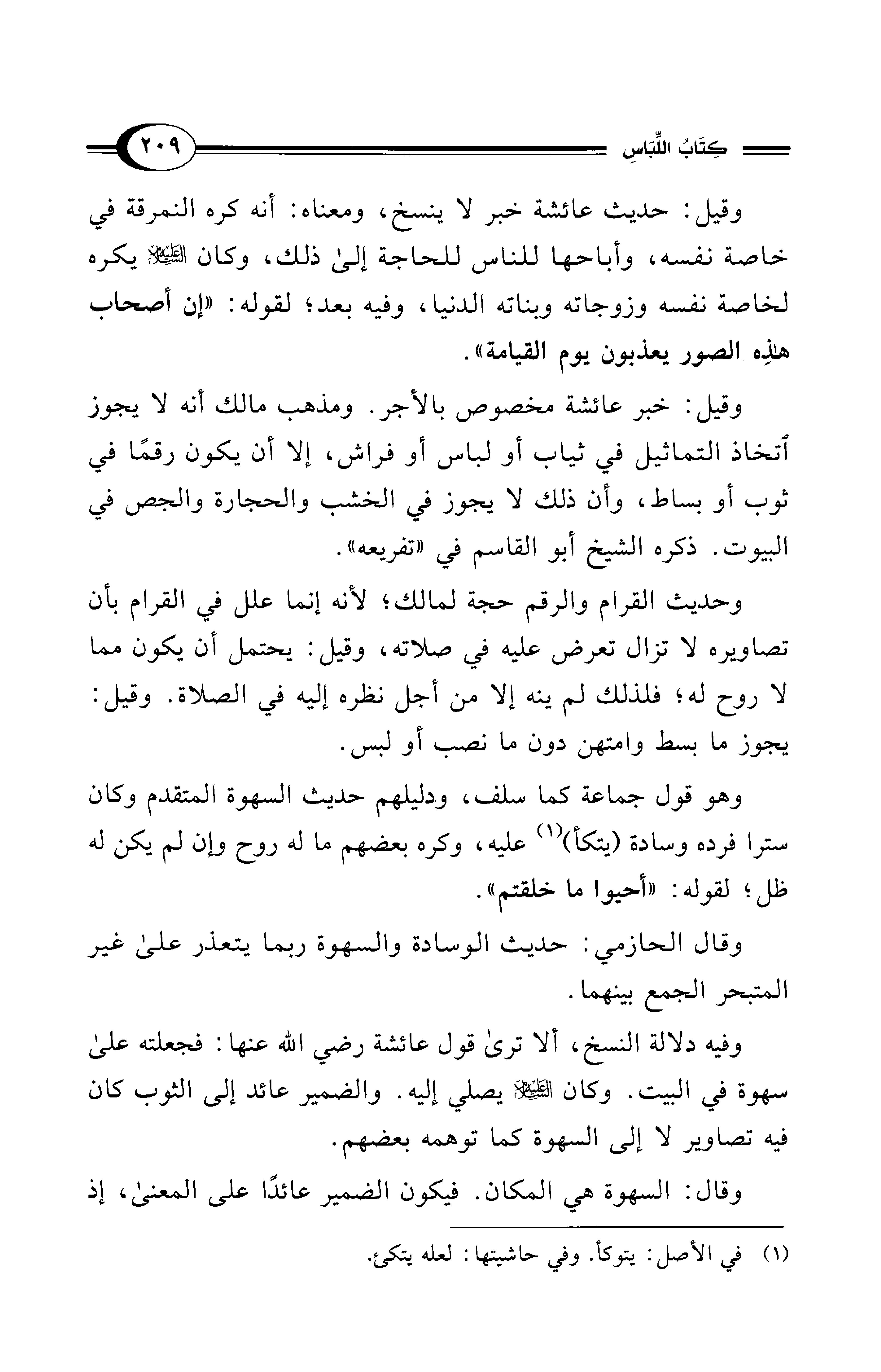 وحديث القرام والرقم حجة لمالك؛ لأنه إنما علل في القرام بأن تصاويره لا تزال تعرض عليه في صلاته، وقيل: يحتمل أن يكون مما لا روح له؛ فلذلك لم ينه إلا من أجل نظره إليه في الصلاة. وقيل: يجوز ما بسط وامتهن دون ما نصب أو لبس.
