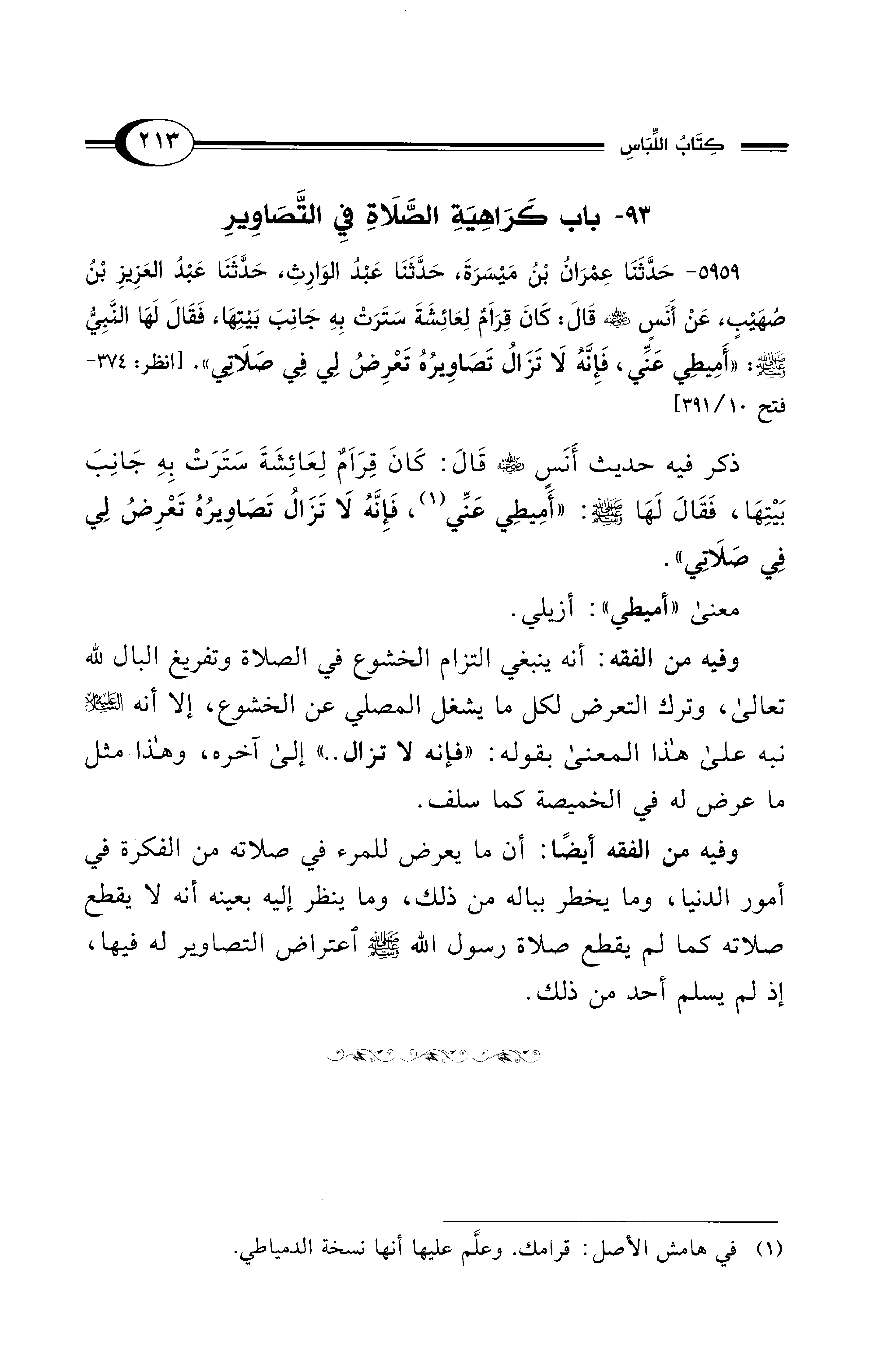5959 - حَدَّثَنَا عِمْرَانُ بْنُ مَيْسَرَةَ، حَدَّثَنَا عَبْدُ الْوَارِثِ، حَدَّثَنَا عَبْدُ الْعَزِيزِ بْنُ صُهَيْبٍ، عَنْ أَنَسٍ - رضي الله عنه - قَالَ: كَانَ قِرَاَمٌ لِعَائِشَةَ سَتَرَتْ بِهِ جَانِبَ بَيْتِهَا، فَقَالَ لَهَا النَّبِيُّ - صلى الله عليه وسلم -: «أَمِيطِى عَنِّي، فَإِنَّهُ لاَ تَزَالُ تَصَاوِيرُهُ تَعْرِضُ لِي فِي صَلاَتِي». [انظر: 374 - فتح 10/ 391]