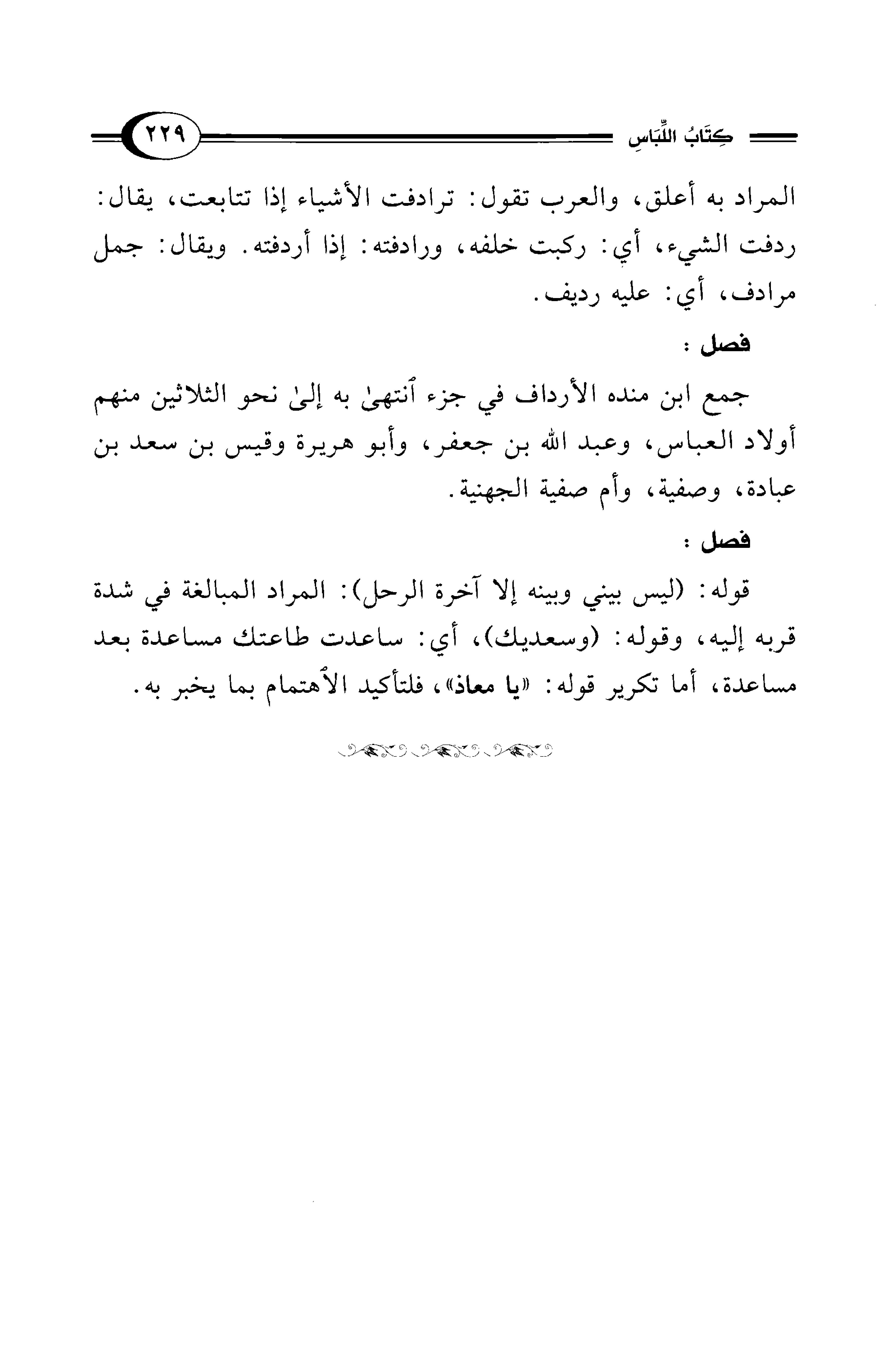 المراد به أعلق، والعرب تقول: ترادفت الأشياء إذا تتابعت، يقال: ردفت الشيء، أي: ركبت خلفه، ورادفته: إذا أردفته. ويقال: جمل مرادف، أي: عليه رديف.