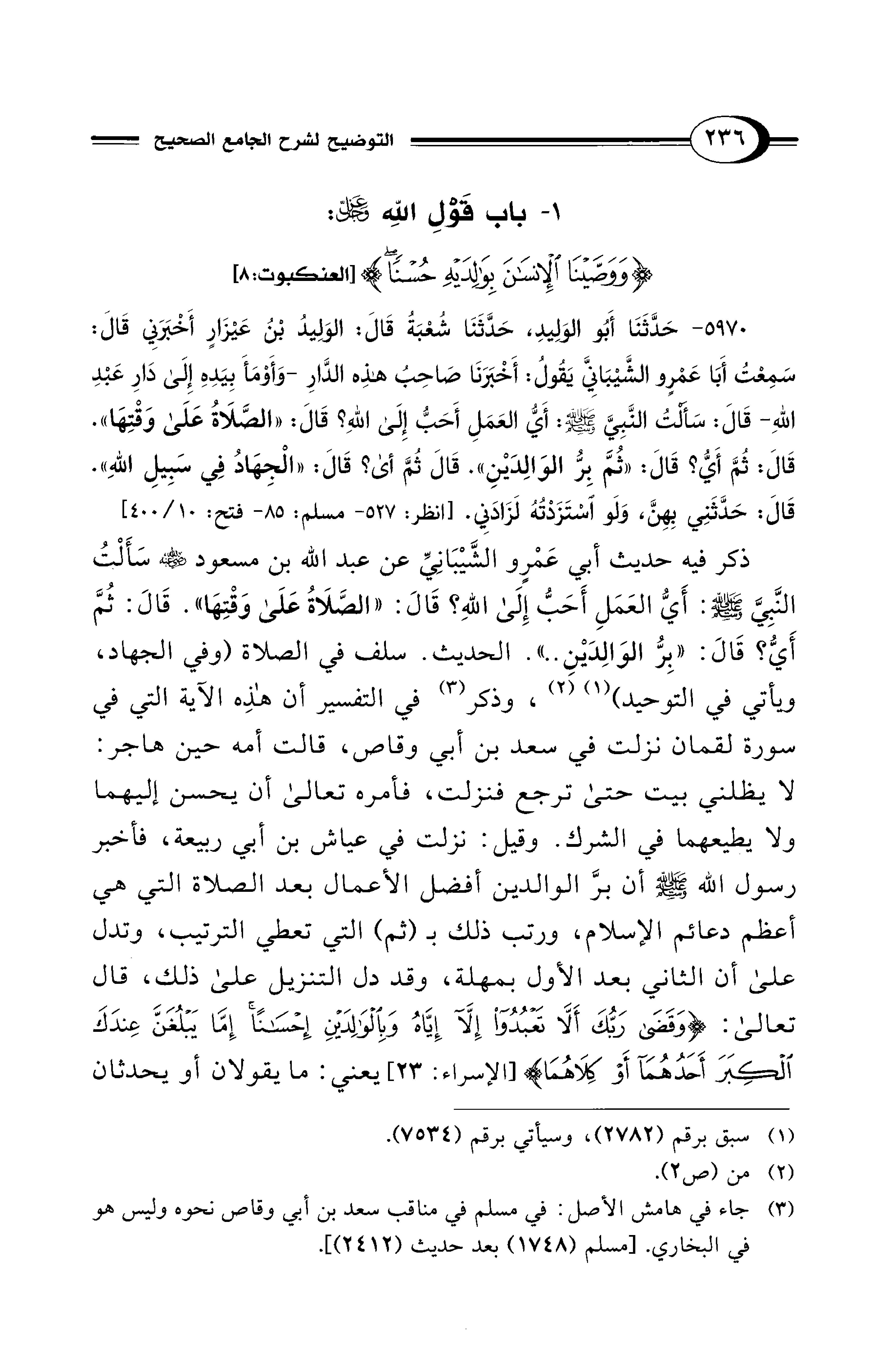 ذكر فيه حديث أبي عَمْرٍو الشَّيْبَانِيِّ عن عبد الله بن مسعود - رضي الله عنه - سَأَلْتُ النَّبِيَّ - صلى الله عليه وسلم -: أَيُّ العَمَلِ أَحَبُّ إِلَى اللهِ؟ قَالَ: "الصَّلَاةُ على وَقْتِهَا". قَالَ: ثُمَّ أَيُّ؟ قَالَ: "بِرُّ الوَالِدَيْنِ .. ". الحديث. سلف في الصلاة (وفي الجهاد، ويأتي في التوحيد) (¬1) (¬2)، وذكر (¬3) في التفسير أن هذِه الآية التي في سورة لقمان نزلت في سعد بن أبي وقاص، قالت أمه حين هاجر: لا يظلني بيت حتى ترجع فنزلت، فأمره تعالى أن يحسن إليهما ولا يطيعهما في الشرك. وقيل: نزلت في عياش بن أبي ربيعة، فأخبر رسول الله - صلى الله عليه وسلم - أن برَّ الوالدين أفضل الأعمال بعد الصلاة التي هي أعظم دعائم الإسلام، ورتب ذلك بـ (ثم) التي تعطي الترتيب، وتدل على أن الثاني بعد الأول بمهلة، وقد دل التنزيل على ذلك، قال تعالى: {وَقَضَى رَبُّكَ أَلَّا تَعْبُدُوا إِلَّا إِيَّاهُ وَبِالْوَالِدَيْنِ إِحْسَانًا إِمَّا يَبْلُغَنَّ عِنْدَكَ الْكِبَرَ أَحَدُهُمَا أَوْ كِلَاهُمَا} [الإسراء: 23] يعني: ما يقولان أو يحدثان