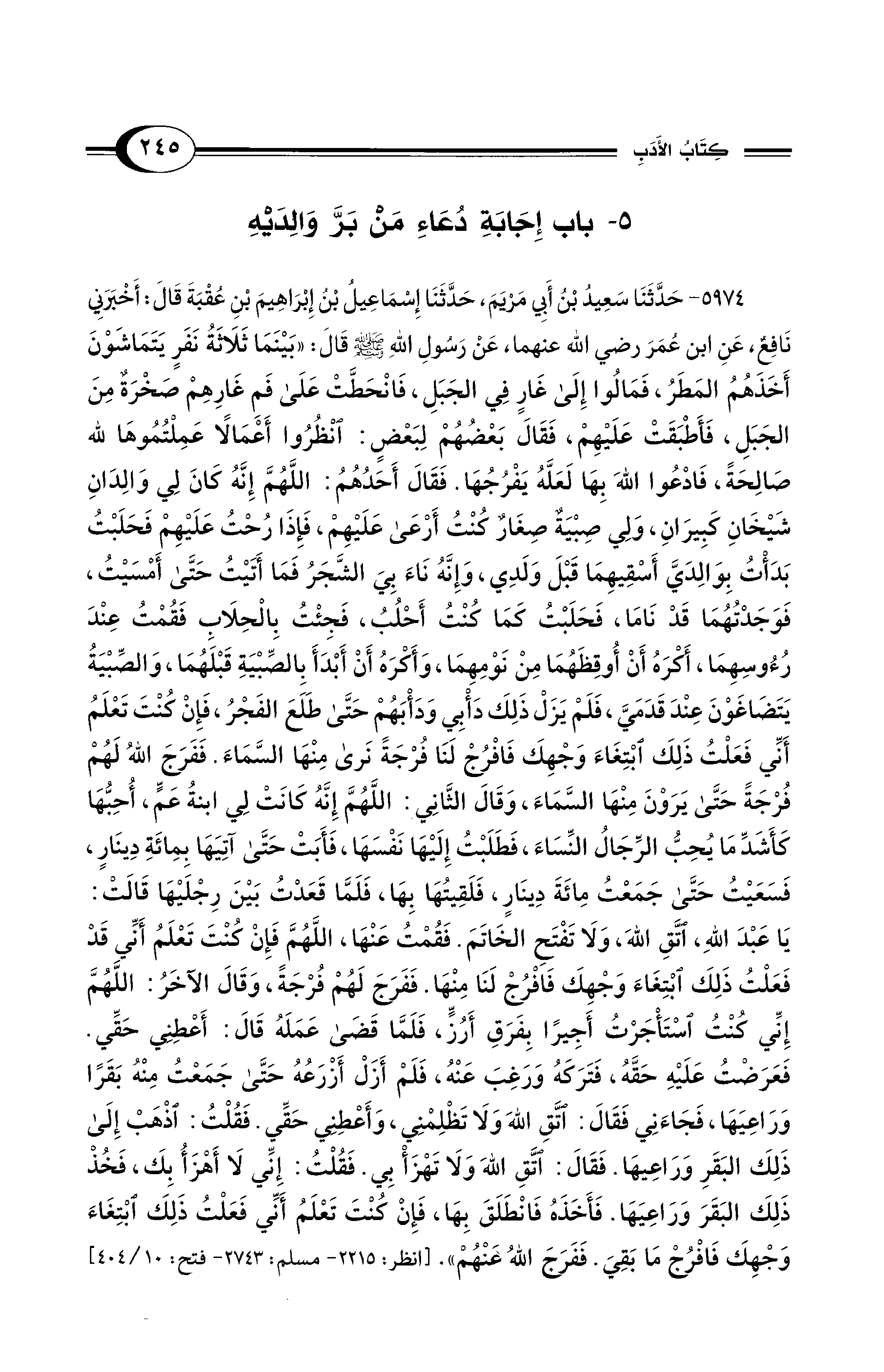5974 - حَدَّثَنَا سَعِيدُ بْنُ أَبِي مَرْيَمَ، حَدَّثَنَا إِسْمَاعِيلُ بْنُ إِبْرَاهِيمَ بْنِ عُقْبَةَ قَالَ: أَخْبَرَنِي نَافِعٌ، عَنِ ابْنِ عُمَرَ - رضي الله عنهما -، عَنْ رَسُولِ اللهِ - صلى الله عليه وسلم - قَالَ: «بَيْنَمَا ثَلاَثَةُ نَفَرٍ يَتَمَاشَوْنَ أَخَذَهُمُ الْمَطَرُ، فَمَالُوا إِلَى غَارٍ فِي الْجَبَلِ، فَانْحَطَّتْ عَلَى فَمِ غَارِهِمْ صَخْرَةٌ مِنَ الْجَبَلِ، فَأَطْبَقَتْ عَلَيْهِمْ، فَقَالَ بَعْضُهُمْ لِبَعْضٍ: انْظُرُوا أَعْمَالاً عَمِلْتُمُوهَا لِلَّهِ صَالِحَةً، فَادْعُوا اللهَ بِهَا لَعَلَّهُ يَفْرُجُهَا. فَقَالَ أَحَدُهُمُ: اللَّهُمَّ إِنَّهُ كَانَ لِي وَالِدَانِ شَيْخَانِ كَبِيرَانِ، وَلِي صِبْيَةٌ صِغَارٌ كُنْتُ أَرْعَى عَلَيْهِمْ، فَإِذَا رُحْتُ عَلَيْهِمْ فَحَلَبْتُ بَدَأْتُ بِوَالِدَيَّ أَسْقِيهِمَا قَبْلَ وَلَدِي، وَإِنَّهُ نَاءَ بِيَ الشَّجَرُ فَمَا أَتَيْتُ حَتَّى أَمْسَيْتُ، فَوَجَدْتُهُمَا قَدْ نَامَا، فَحَلَبْتُ كَمَا كُنْتُ أَحْلُبُ، فَجِئْتُ بِالْحِلاَبِ فَقُمْتُ عِنْدَ رُءُوسِهِمَا، أَكْرَهُ أَنْ أُوقِظَهُمَا مِنْ نَوْمِهِمَا، وَأَكْرَهُ أَنْ أَبْدَأَ بِالصِّبْيَةِ قَبْلَهُمَا، وَالصِّبْيَةُ يَتَضَاغَوْنَ عِنْدَ قَدَمَيَّ، فَلَمْ يَزَلْ ذَلِكَ دَأْبِي وَدَأْبَهُمْ حَتَّى طَلَعَ الْفَجْرُ، فَإِنْ كُنْتَ تَعْلَمُ أَنِّي فَعَلْتُ ذَلِكَ ابْتِغَاءَ وَجْهِكَ فَافْرُجْ لَنَا فُرْجَةً نَرَى مِنْهَا السَّمَاءَ، فَفَرَجَ اللهُ لَهُمْ فُرْجَةً حَتَّى يَرَوْنَ مِنْهَا السَّمَاءَ. وَقَالَ الثَّانِي: اللَّهُمَّ إِنَّهُ كَانَتْ لِي ابْنَةُ عَمٍّ، أُحِبُّهَا كَأَشَدِّ مَا يُحِبُّ الرِّجَالُ النِّسَاءَ، فَطَلَبْتُ إِلَيْهَا نَفْسَهَا، فَأَبَتْ حَتَّى آتِيَهَا بِمِائَةِ دِينَارٍ، فَسَعَيْتُ حَتَّى جَمَعْتُ مِائَةَ دِينَارٍ، فَلَقِيتُهَا بِهَا، فَلَمَّا قَعَدْتُ بَيْنَ رِجْلَيْهَا قَالَتْ: يَا عَبْدَ اللهِ، اتَّقِ اللهَ، وَلاَ تَفْتَحِ الْخَاتَمَ. فَقُمْتُ عَنْهَا، اللَّهُمَّ فَإِنْ كُنْتَ تَعْلَمُ أَنِّي قَدْ فَعَلْتُ ذَلِكَ ابْتِغَاءَ وَجْهِكَ فَافْرُجْ لَنَا مِنْهَا. فَفَرَجَ لَهُمْ فُرْجَةً، وَقَالَ الآخَرُ: اللَّهُمَّ إِنِّي كُنْتُ اسْتَأْجَرْتُ أَجِيرًا بِفَرَقِ أَرُزٍّ، فَلَمَّا قَضَى عَمَلَهُ قَالَ: أَعْطِنِي حَقِّي. فَعَرَضْتُ عَلَيْهِ حَقَّهُ، فَتَرَكَهُ وَرَغِبَ عَنْهُ، فَلَمْ أَزَلْ أَزْرَعُهُ حَتَّى جَمَعْتُ مِنْهُ بَقَرًا وَرَاعِيَهَا، فَجَاءَنِي فَقَالَ: اتَّقِ اللهَ وَلاَ تَظْلِمْنِي، وَأَعْطِنِي حَقِّي. فَقُلْتُ: اذْهَبْ إِلَى ذَلِكَ الْبَقَرِ وَرَاعِيهَا. فَقَالَ: اتَّقِ اللهَ وَلاَ تَهْزَأْ بِي. فَقُلْتُ: إِنِّي لاَ أَهْزَأُ بِكَ، فَخُذْ ذَلِكَ الْبَقَرَ وَرَاعِيَهَا. فَأَخَذَهُ فَانْطَلَقَ بِهَا، فَإِنْ كُنْتَ تَعْلَمُ أَنِّي فَعَلْتُ ذَلِكَ ابْتِغَاءَ وَجْهِكَ، فَافْرُجْ مَا بَقِيَ، فَفَرَجَ اللهُ عَنْهُمْ». [انظر: 2215 - مسلم: 2743 - فتح: 10/ 404]
