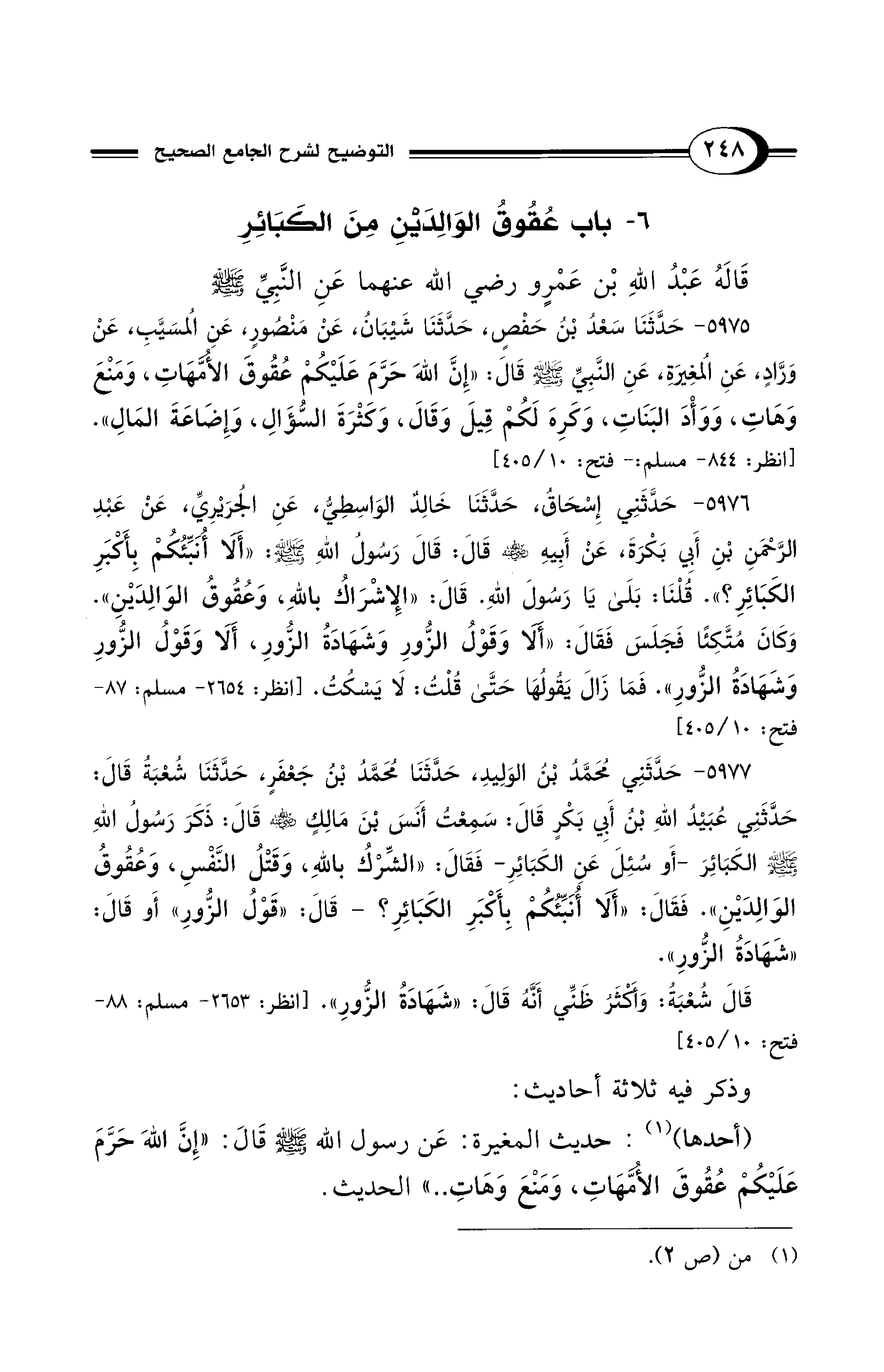 6 - باب عُقُوقُ الوَالِدَيْنِ مِنَ الكَبَائِرِ