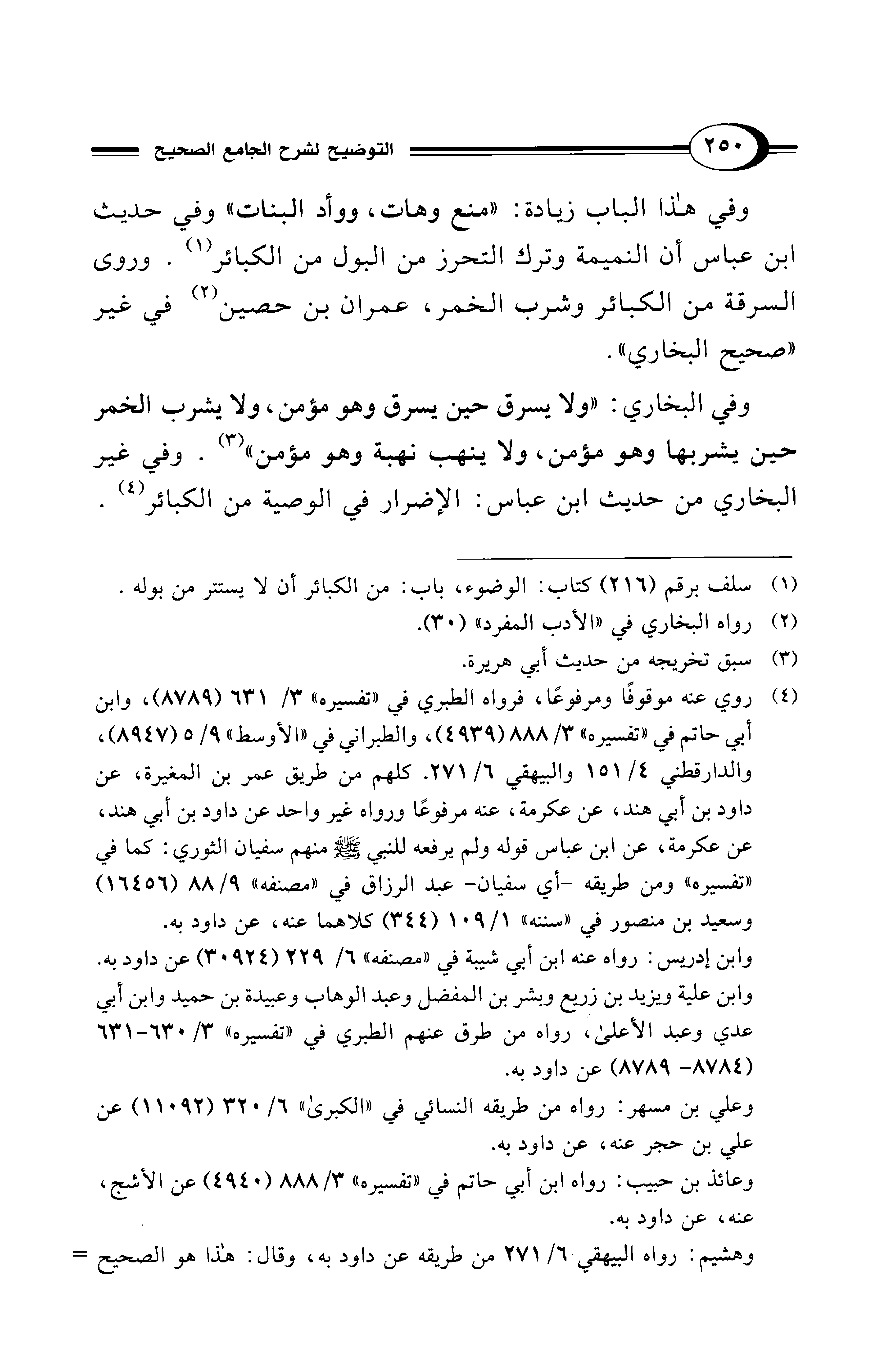وفي البخاري: "ولا يسرق حين يسرق وهو مؤمن، ولا يشرب الخمر حين يشربها وهو مؤمن، ولا ينهب نهبة وهو مؤمن" (¬3). وفي غير البخاري من حديث ابن عباس: الإضرار في الوصية من الكبائر (¬4).