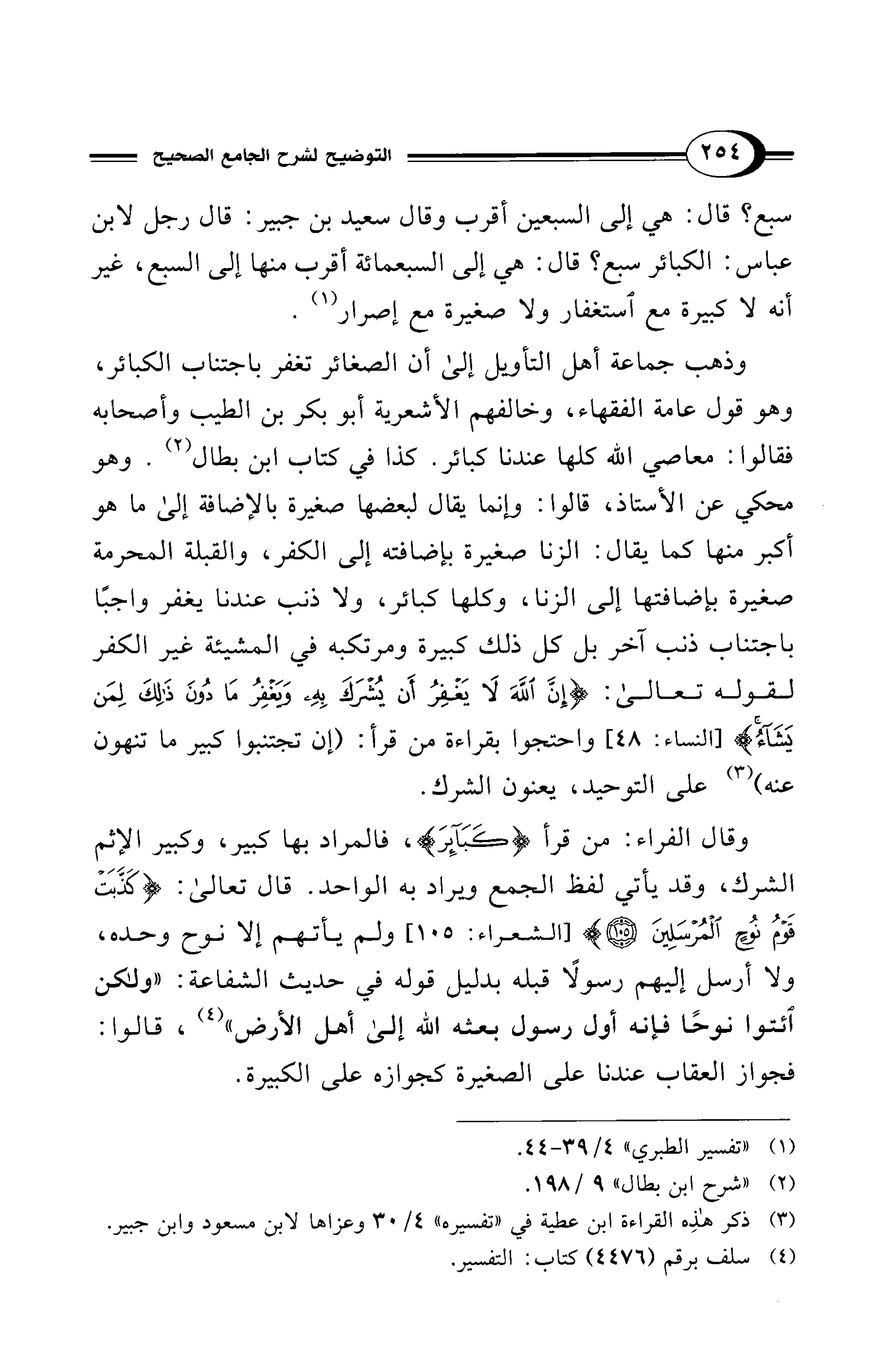 وذهب جماعة أهل التأويل إلى أن الصغائر تغفر باجتناب الكبائر، وهو قول عامة الفقهاء، وخالفهم الأشعرية أبو بكر بن الطيب وأصحابه فقالوا: معاصي الله كلها عندنا كبائر. كذا في كتاب ابن بطال (¬2). وهو محكي عن الأستاذ، قالوا: وإنما يقال لبعضها صغيرة بالإضافة إلى ما هو أكبر منها كما يقال: الزنا صغيرة بإضافته إلى الكفر، والقبلة المحرمة صغيرة بإضافتها إلى الزنا، وكلها كبائر، ولا ذنب عندنا يغفر واجبًا باجتناب ذنب آخر بل كل ذلك كبيرة ومرتكبه في المشيئة غير الكفر لقوله تعالى: {إِنَّ اللهَ لَا يَغْفِرُ أَنْ يُشْرَكَ بِهِ وَيَغْفِرُ مَا دُونَ ذَلِكَ لِمَنْ يَشَاءُ} [النساء: 48] واحتجوا بقراءة من قرأ: (إن تجتنبوا كبير ما تنهون عنه) (¬3) على التوحيد، يعنون الشرك.