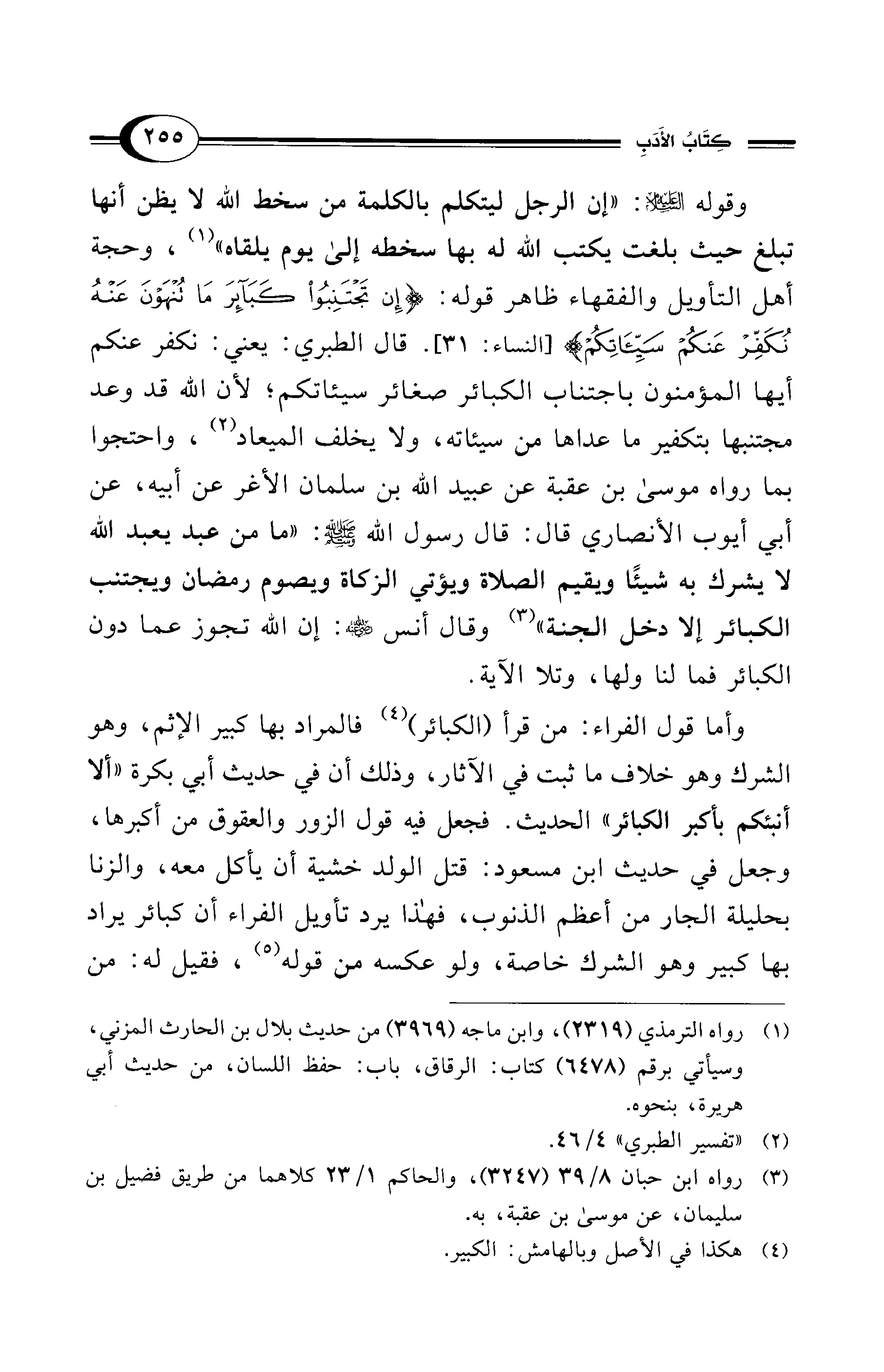 وقوله - عليه السلام -: "إن الرجل ليتكلم بالكلمة من سخط الله لا يظن أنها تبلغ حيث بلغت يكتب الله له بها سخطه إلى يوم يلقاه" (¬1)، وحجة أهل التأويل والفقهاء ظاهر قوله: {إِنْ تَجْتَنِبُوا كَبَائِرَ مَا تُنْهَوْنَ عَنْهُ نُكَفِّرْ عَنْكُمْ سَيِّئَاتِكُمْ} [النساء: 31]. قال الطبري: يعني: نكفر عنكم أيها المؤمنون باجتناب الكبائر صغائر سيئاتكم؛ لأن الله قد وعد مجتنبها بتكفير ما عداها من سيئاته، ولا يخلف الميعاد (¬2)، واحتجوا بما رواه موسى بن عقبة عن عبيد الله بن سلمان الأغر عن أبيه، عن أبي أيوب الأنصاري قال: قال رسول الله - صلى الله عليه وسلم -: "ما من عبد يعبد الله لا يشرك به شيئًا ويقيم الصلاة ويؤتي الزكاة ويصوم رمضان ويجتنب الكبائر إلا دخل الجنة" (¬3) وقال أنس - رضي الله عنه -: إن الله تجوز عما دون الكبائر فما لنا ولها، وتلا الآية.