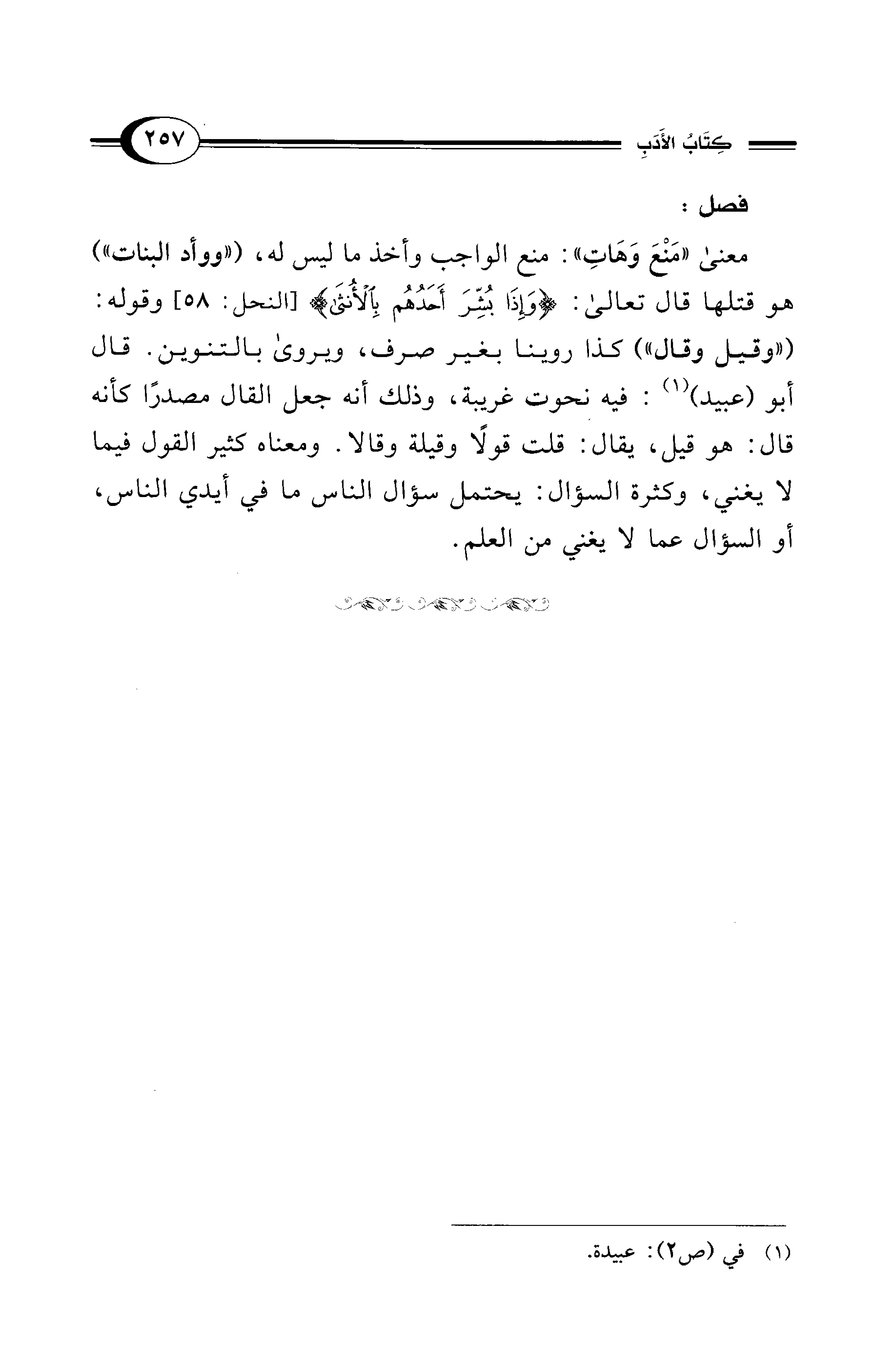 معنى "مَنْعَ وَهَاتِ": منع الواجب وأخذ ما ليس له، ("ووأد البنات") هو قتلها قال تعالى: {وَإِذَا بُشِّرَ أَحَدُهُمْ بِالْأُنْثَى} [النحل: 58] وقوله: ("وقيل وقال") كذا روينا بغير صرف، ويروى بالتنوين. قال أبو (عبيد) (¬1): فيه نحوت غريبة، وذلك أنه جعل القال مصدرًا كأنه قال: هو قيل، يقال: قلت قولًا وقيلة وقالا. ومعناه كثير القول فيما لا يغني، وكثرة السؤال: يحتمل سؤال الناس ما في أيدي الناس، أو السؤال عما لا يغني من العلم.
