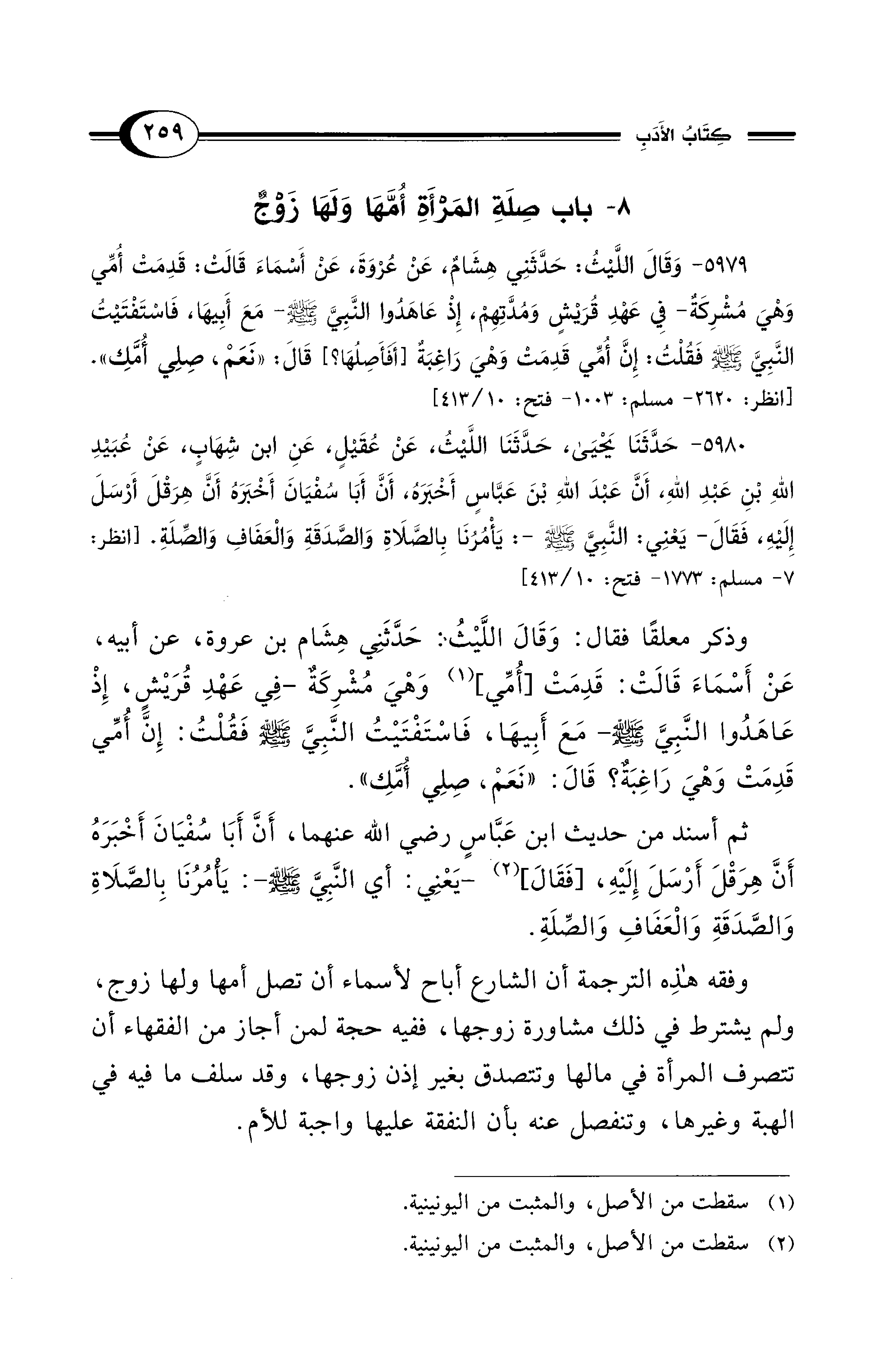 5979 - وَقَالَ اللَّيْثُ: حَدَّثَنِي هِشَامٌ، عَنْ عُرْوَةَ، عَنْ أَسْمَاءَ قَالَتْ: قَدِمَتْ أُمِّي وَهْيَ مُشْرِكَةٌ -فِي عَهْدِ قُرَيْشٍ وَمُدَّتِهِمْ، إِذْ عَاهَدُوا النَّبِيَّ - صلى الله عليه وسلم - مَعَ أَبِيهَا، فَاسْتَفْتَيْتُ النَّبِيَّ - صلى الله عليه وسلم - فَقُلْتُ: إِنَّ أُمِّي قَدِمَتْ وَهْيَ رَاغِبَةٌ [أَفَأَصِلُهَا؟] قَالَ: «نَعَمْ، صِلِى أُمَّكِ». [انظر: 2620 - مسلم: 1003 - فتح: 10/ 413]