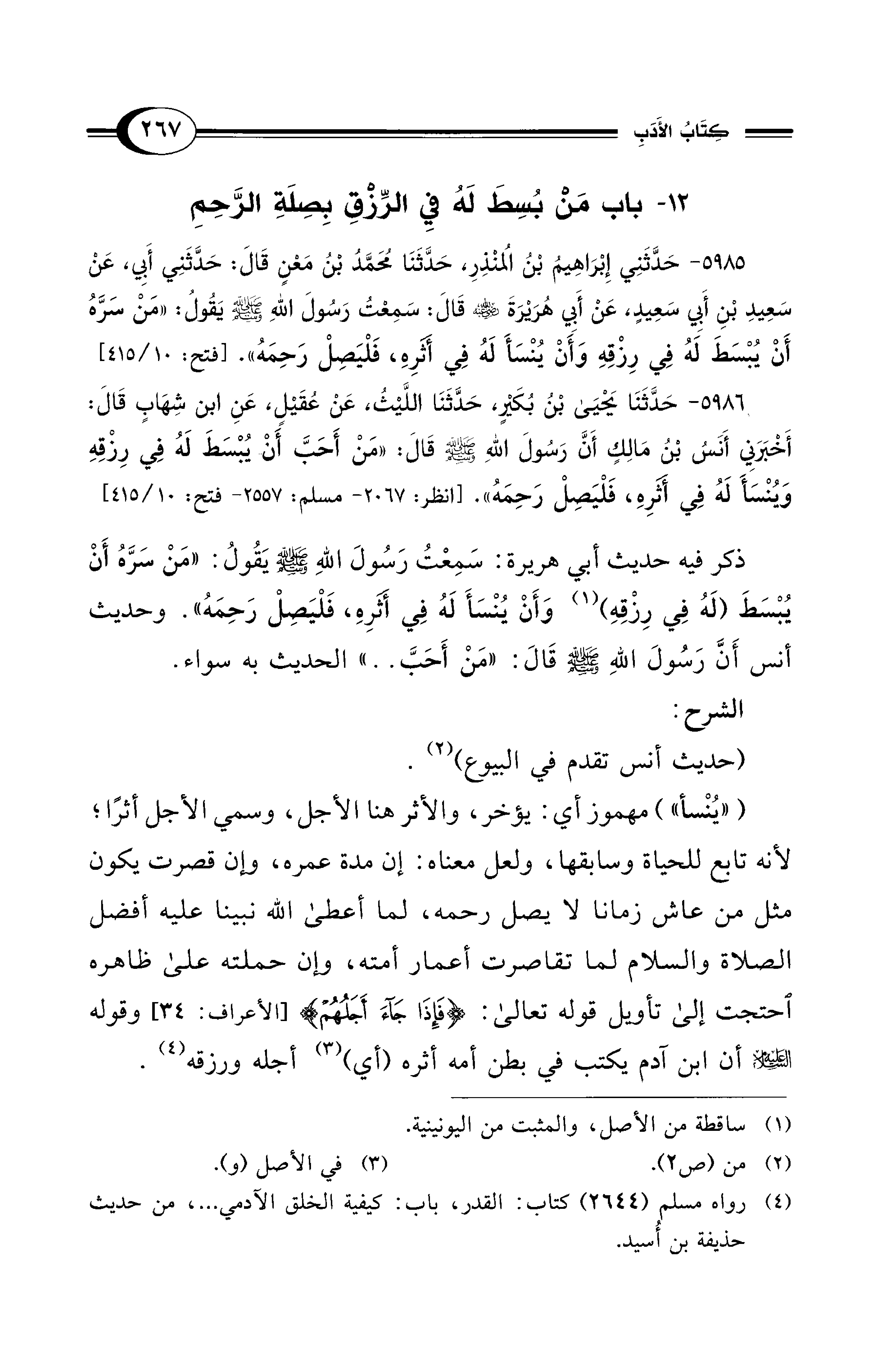 5986 - حَدَّثَنَا يَحْيَى بْنُ بُكَيْرٍ، حَدَّثَنَا اللَّيْثُ، عَنْ عُقَيْلٍ، عَنِ ابْنِ شِهَابٍ قَالَ: أَخْبَرَنِي أَنَسُ بْنُ مَالِكٍ أَنَّ رَسُولَ اللهِ - صلى الله عليه وسلم - قَالَ: «مَنْ أَحَبَّ أَنْ يُبْسَطَ لَهُ فِي رِزْقِهِ، وَيُنْسَأَ لَهُ فِي أَثَرِهِ، فَلْيَصِلْ رَحِمَهُ». [انظر: 2067 - مسلم: 2557 - فتح: 10/ 415]