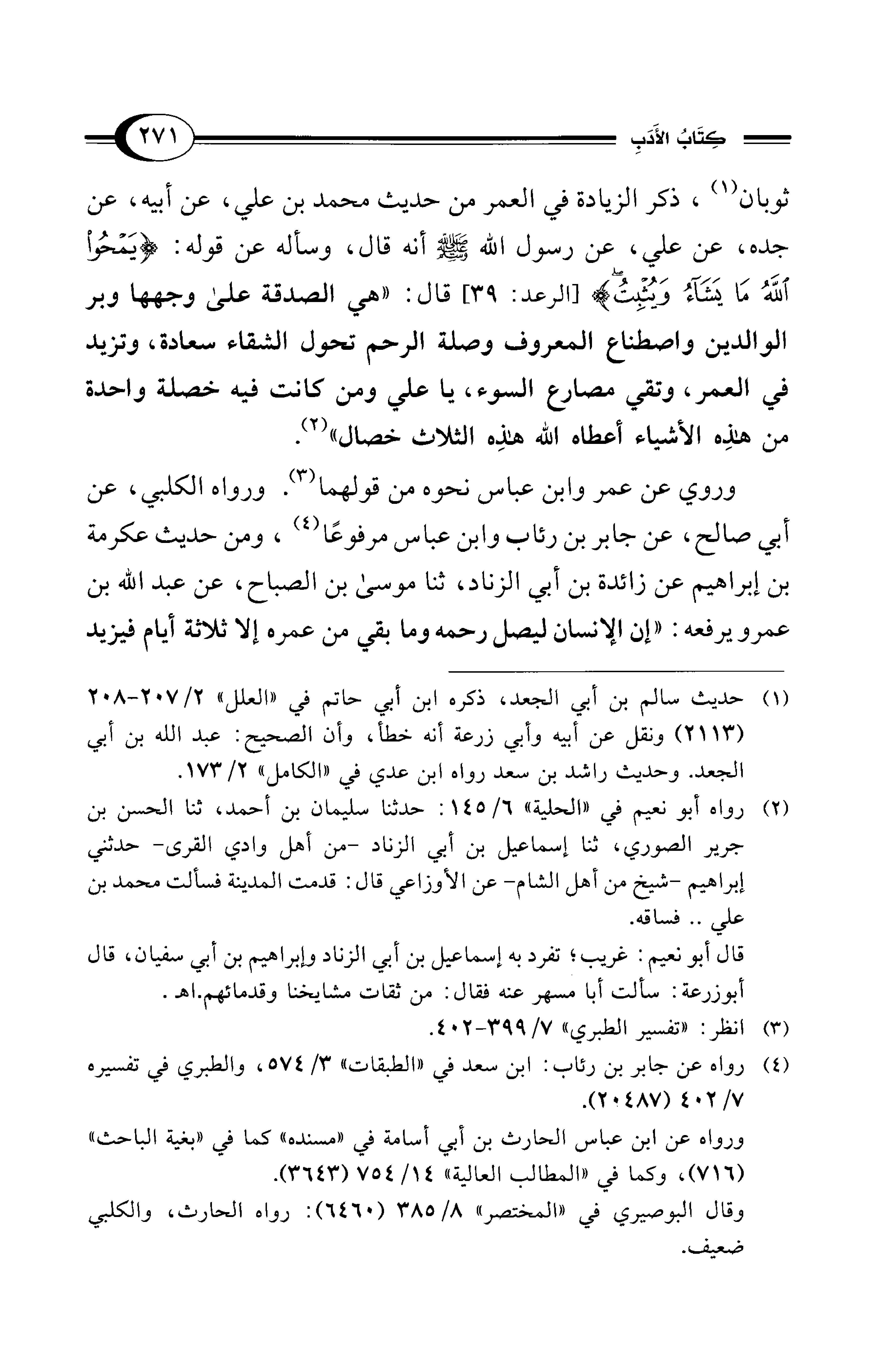 ثوبان (¬1)، ذكر الزيادة في العمر من حديث محمد بن علي، عن أبيه، عن جده، عن علي، عن رسول الله - صلى الله عليه وسلم - أنه قال، وسأله عن قوله: {يَمْحُو اللهُ مَا يَشَاءُ وَيُثْبِتُ} [الرعد: 39] قال: "هي الصدقة على وجهها وبر الوالدين واصطناع المعروف وصلة الرحم تحول الشقاء سعادة، وتزيد في العمر، وتقي مصارع السوء، يا علي ومن كانت فيه خصلة واحدة من هذِه الأشياء أعطاه الله هذِه الثلاث خصال" (¬2).