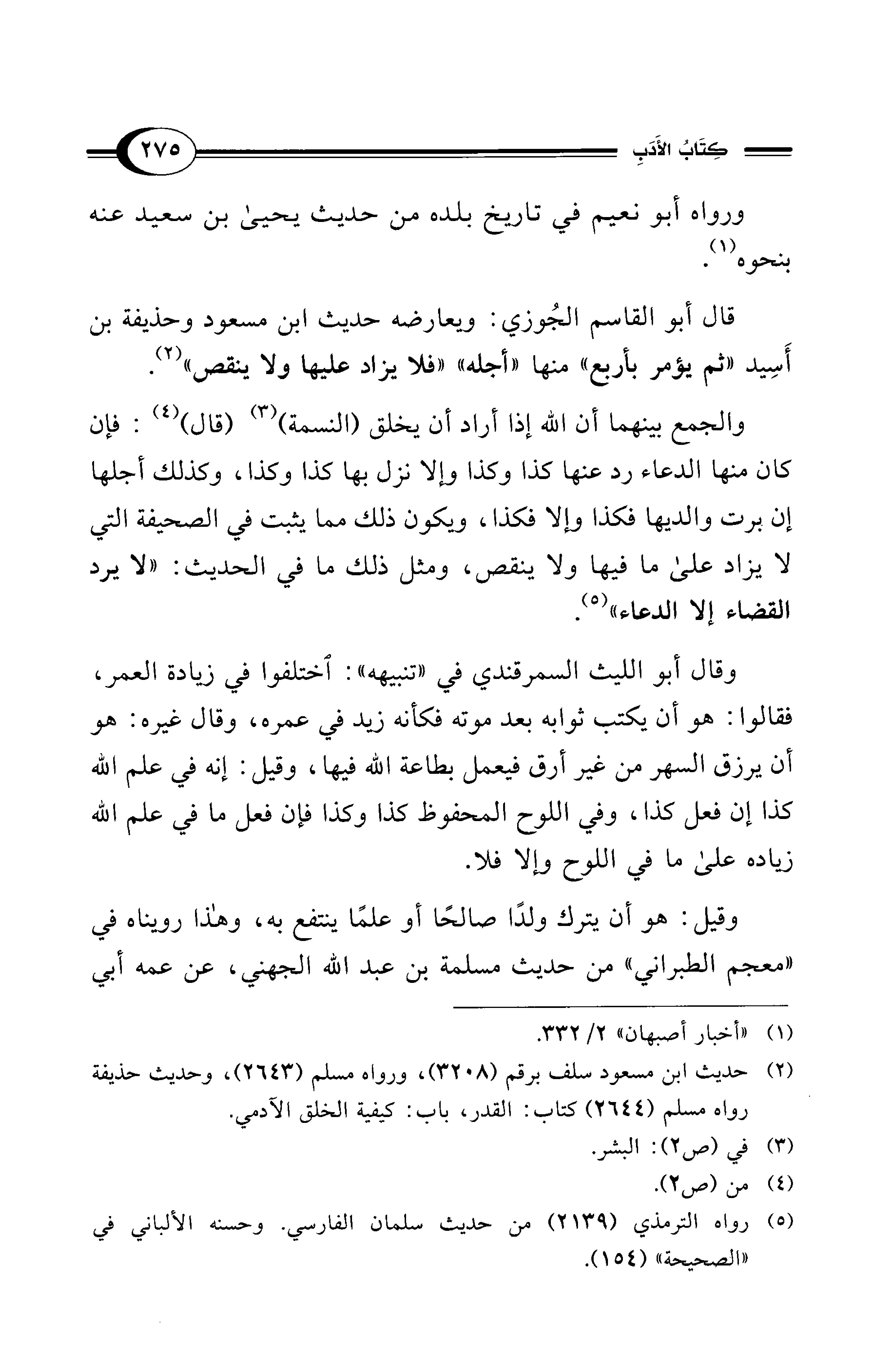 والجمع بينهما أن الله إذا أراد أن يخلق (النسمة) (¬3) (قال) (¬4): فإن كان منها الدعاء رد عنها كذا وكذا وإلا نزل بها كذا وكذا، وكذلك أجلها إن برت والديها فكذا وإلا فكذا، ويكون ذلك مما يثبت في الصحيفة التي لا يزاد على ما فيها ولا ينقص، ومثل ذلك ما في الحديث: "لا يرد القضاء إلا الدعاء" (¬5).