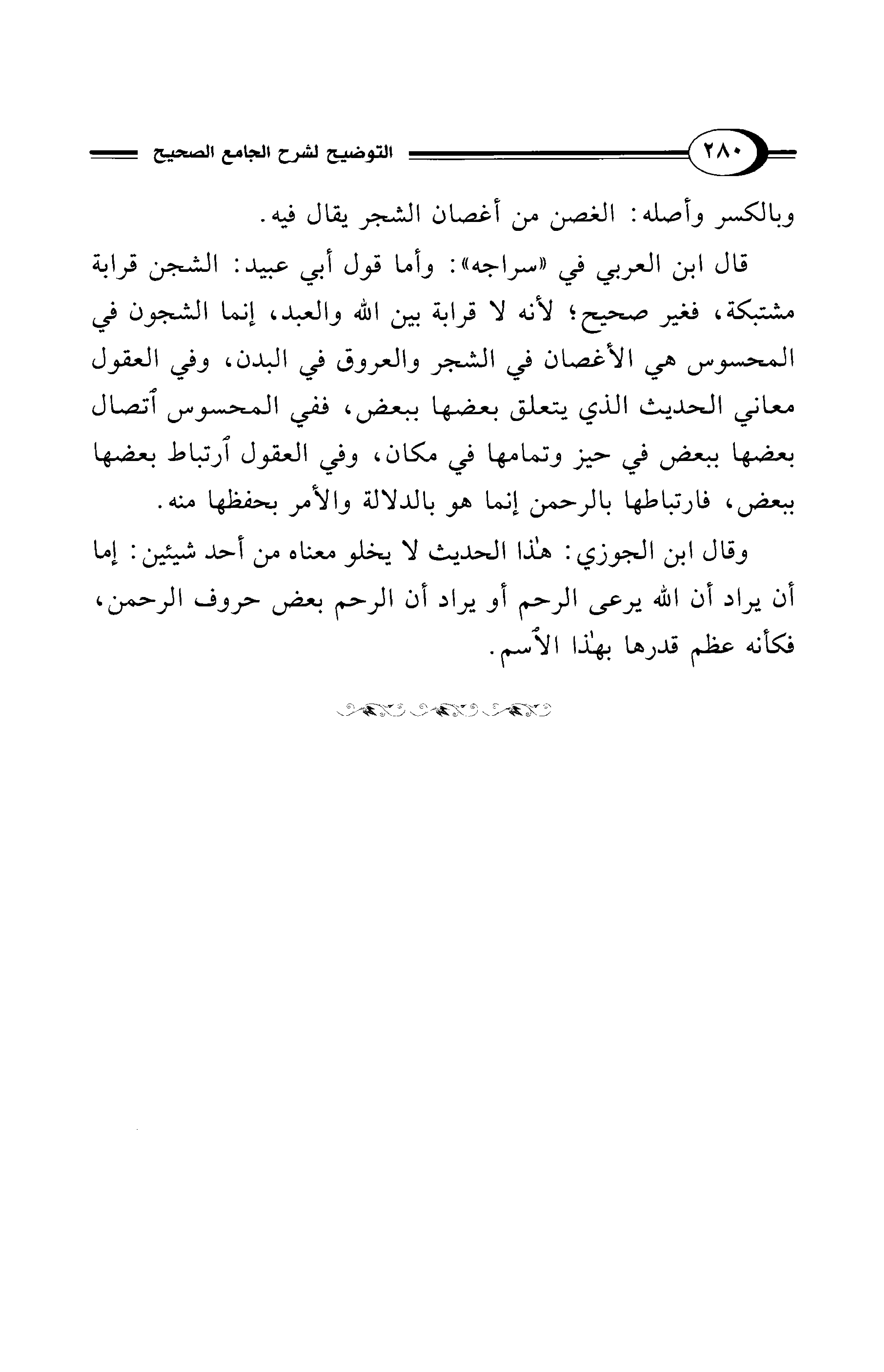 قال ابن العربي في "سراجه": وأما قول أبي عبيد: الشجن قرابة مشتبكة، فغير صحيح؛ لأنه لا قرابة بين الله والعبد، إنما الشجون في المحسوس هي الأغصان في الشجر والعروق في البدن، وفي العقول معاني الحديث الذي يتعلق بعضها ببعض، ففي المحسوس اتصال بعضها ببعض في حيز وتمامها في مكان، وفي العقول ارتباط بعضها ببعض، فارتباطها بالرحمن إنما هو بالدلالة والأمر بحفظها منه.