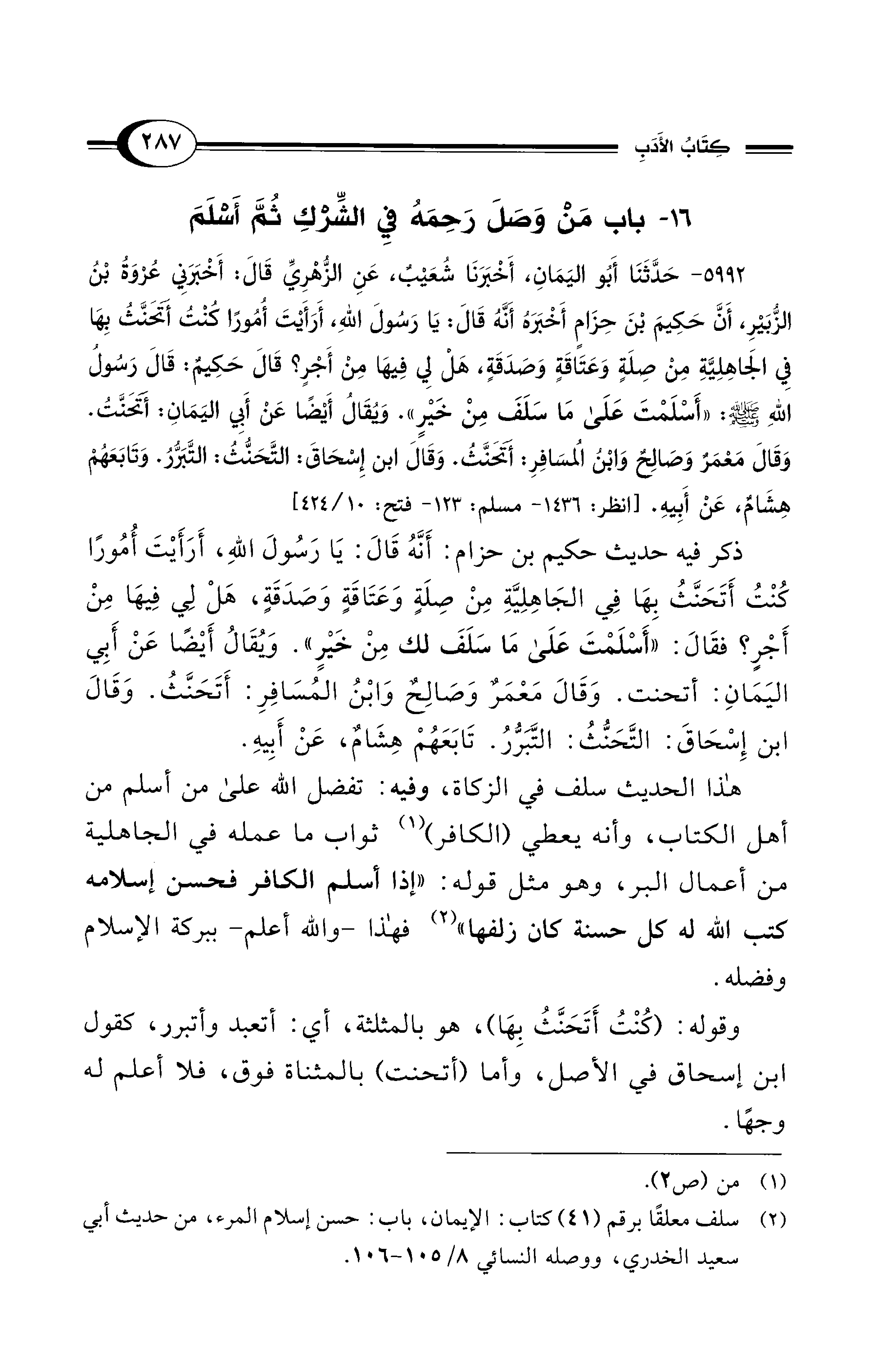5992 - حَدَّثَنَا أَبُو الْيَمَانِ، أَخْبَرَنَا شُعَيْبٌ، عَنِ الزُّهْرِيِّ قَالَ: أَخْبَرَنِي عُرْوَةُ بْنُ الزُّبَيْرِ، أَنَّ حَكِيمَ بْنَ حِزَامٍ أَخْبَرَهُ أَنَّهُ قَالَ: يَا رَسُولَ اللهِ، أَرَأَيْتَ أُمُورًا كُنْتُ أَتَحَنَّثُ بِهَا فِي الْجَاهِلِيَّةِ مِنْ صِلَةٍ وَعَتَاقَةٍ وَصَدَقَةٍ، هَلْ لِي فِيهَا مِنْ أَجْرٍ؟ قَالَ حَكِيمٌ: قَالَ رَسُولُ اللهِ - صلى الله عليه وسلم -: «أَسْلَمْتَ عَلَى مَا سَلَفَ مِنْ خَيْرٍ». وَيُقَالُ أَيْضًا عَنْ أَبِي الْيَمَانِ: أَتَحَنَّتُ. وَقَالَ مَعْمَرٌ وَصَالِحٌ وَابْنُ الْمُسَافِرِ: أَتَحَنَّثُ. وَقَالَ ابْنُ إِسْحَاقَ: التَّحَنُّثُ: التَّبَرُّرُ، وَتَابَعَهُمْ هِشَامٌ، عَنْ أَبِيهِ. [انظر: 1436 - مسلم: 123 - فتح: 10/ 424]