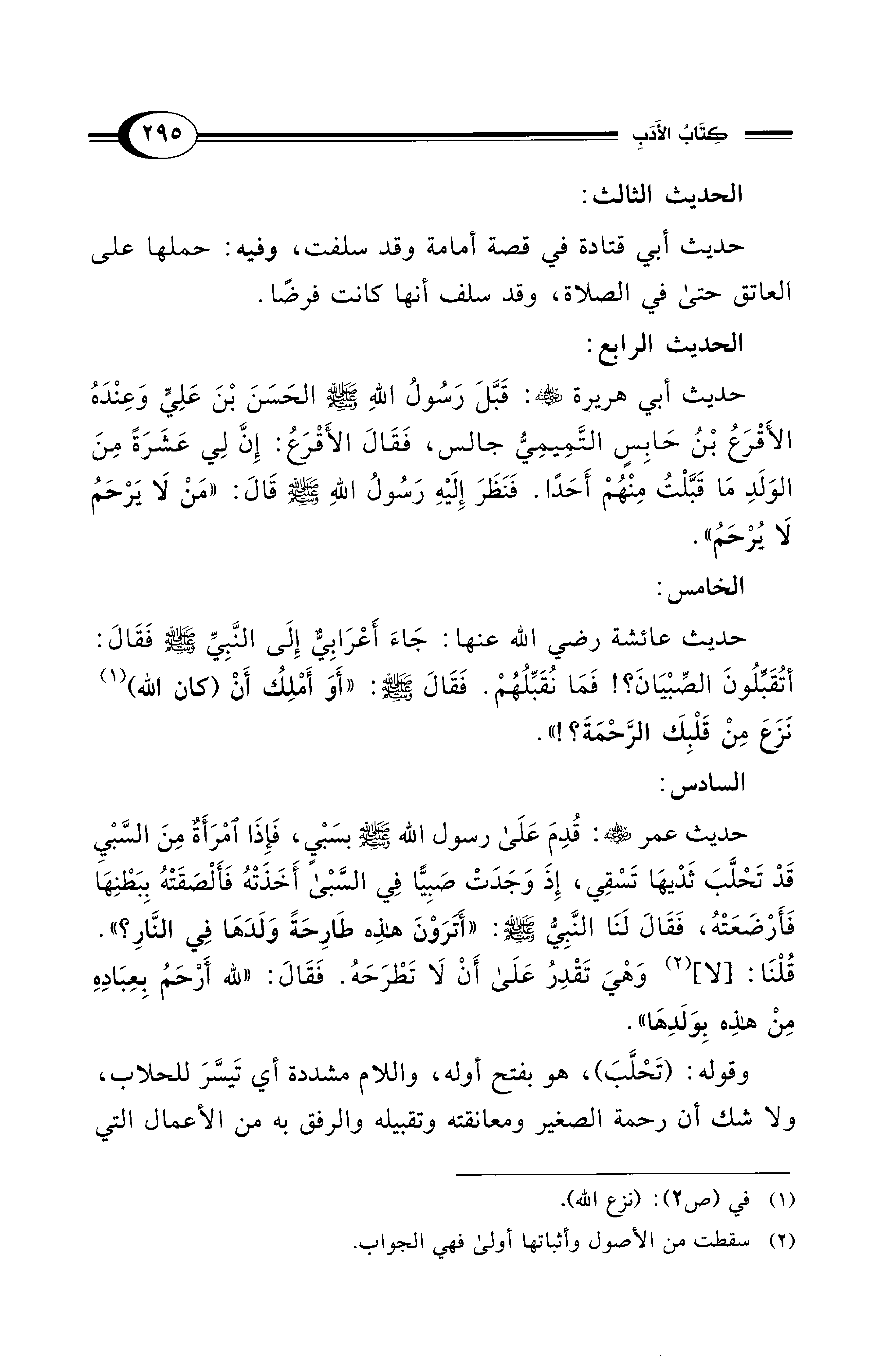 حديث عائشة - رضي الله عنها -: جَاءَ أَعْرَابِيٌّ إِلَى النَّبِيِّ - صلى الله عليه وسلم - فَقَالَ: أتُقَبِّلُونَ الصِّبْيَانَ؟! فَمَا نُقَبِّلُهُمْ. فَقَالَ - صلى الله عليه وسلم -: "أَوَ أَمْلِكُ أَنْ (كان الله) (¬1) نَزَعَ مِنْ قَلْبِكَ الرَّحْمَةَ؟! ".
