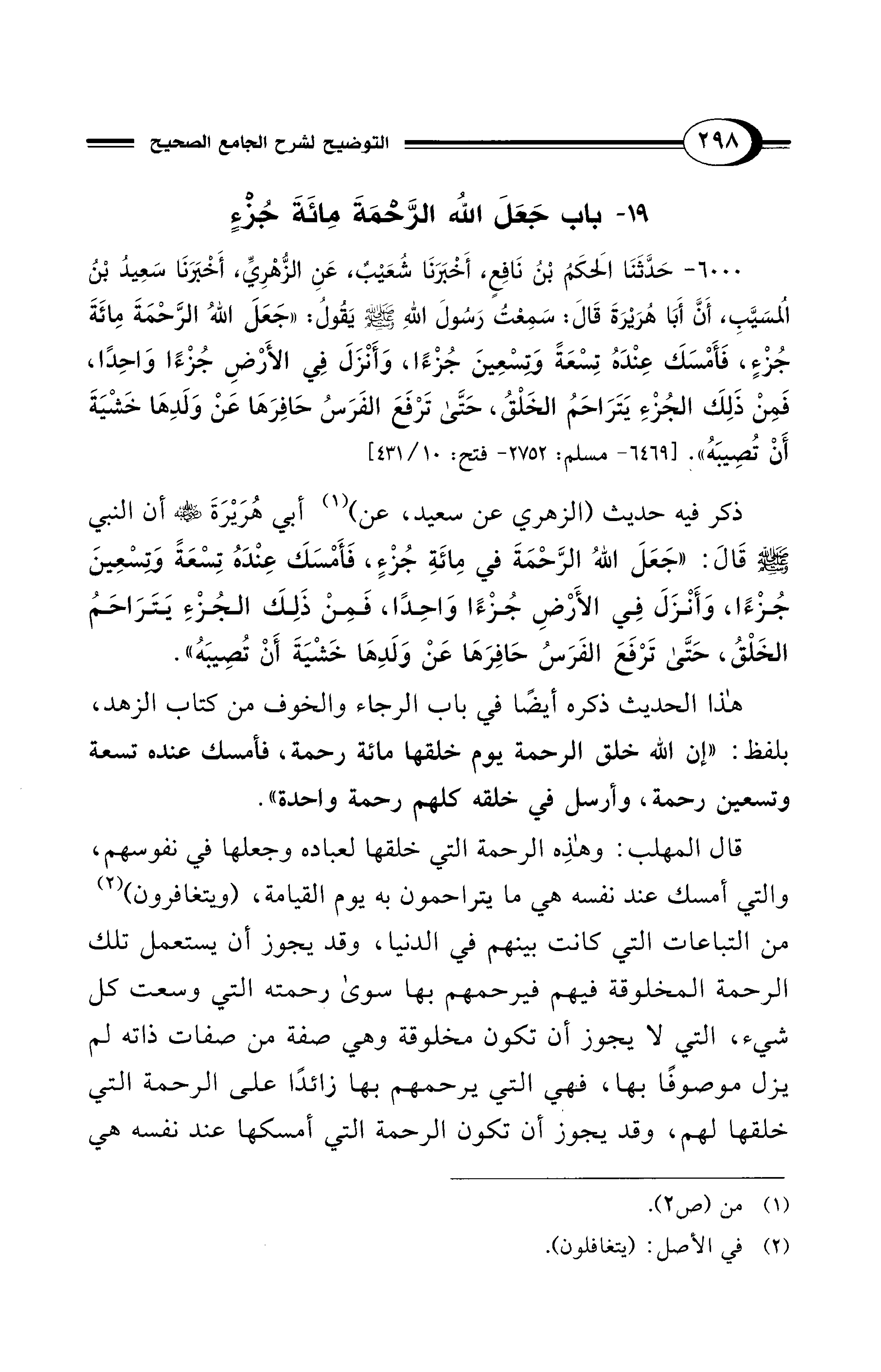 ذكر فيه حديث (الزهري عن سعيد، عن) (¬1) أبي هُرَيْرَةَ - رضي الله عنه - أن النبي - صلى الله عليه وسلم - قَالَ: "جَعَلَ اللهُ الرَّحْمَةَ في مِائَةِ جُزْءٍ، فَأَمْسَكَ عِنْدَهُ تِسْعَةً وَتِسْعِينَ جُزْءًا، وَأَنْزَلَ فِي الأَرْضِ جُزْءًا وَاحِدًا، فَمِنْ ذَلِكَ الجُزْءِ يَتَرَاحَمُ الخَلْقُ، حَتَّى تَرْفَعَ الفَرَسُ حَافِرَهَا عَنْ وَلَدِهَا خَشْيَةَ أَنْ تُصِيبَهُ".