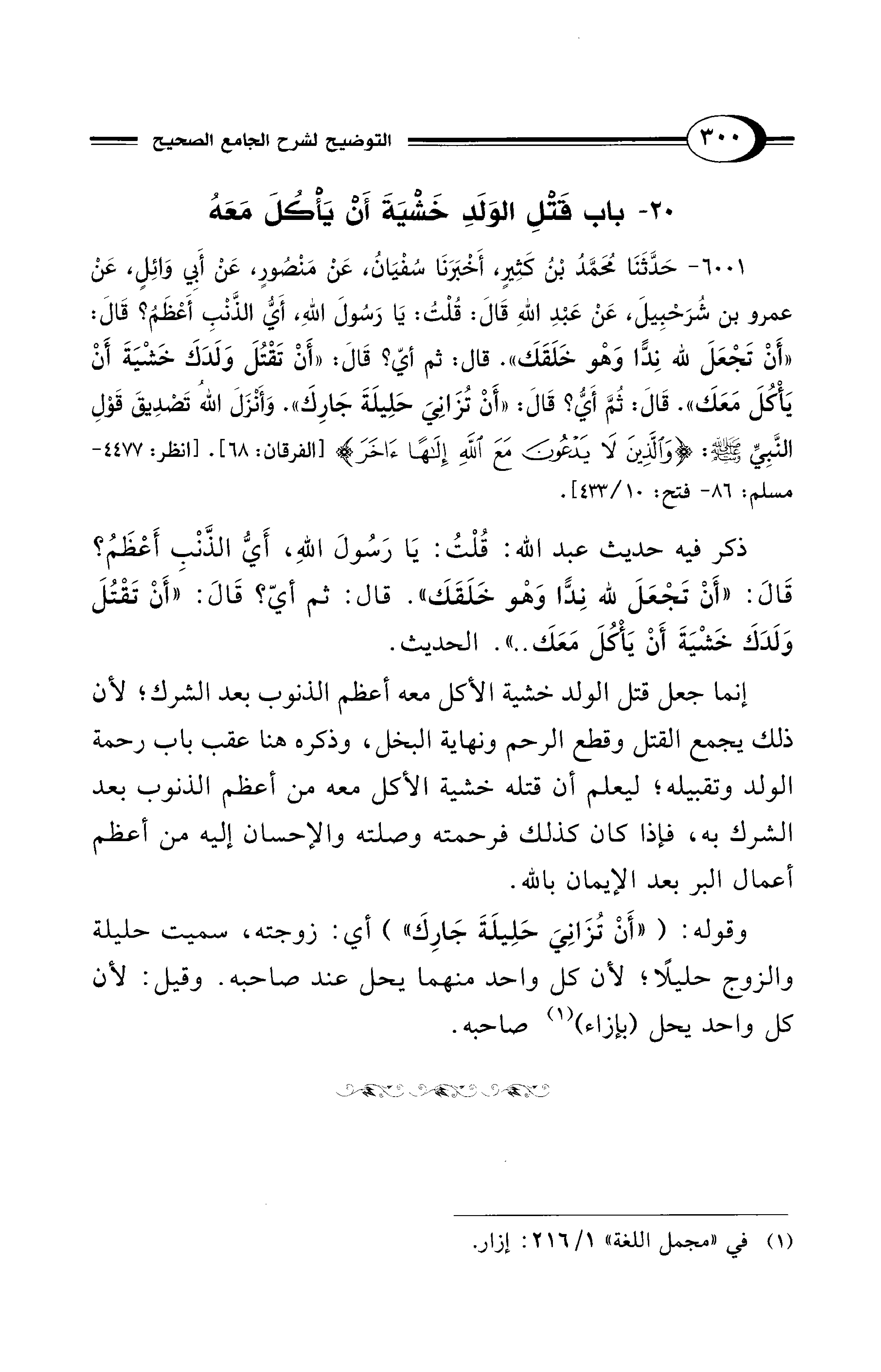 ذكر فيه حديث عبد الله: قُلْتُ: يَا رَسُولَ اللهِ، أَيُّ الذَّنْبِ أَعْظَمُ؟ قَالَ: "أَنْ تَجْعَلَ لله نِدًّا وَهْو خَلَقَكَ". قال: ثم أيّ؟ قَالَ: "أَنْ تَقْتُلَ وَلَدَكَ خَشْيَةَ أَنْ يَأْكُلَ مَعَكَ .. ". الحديث.