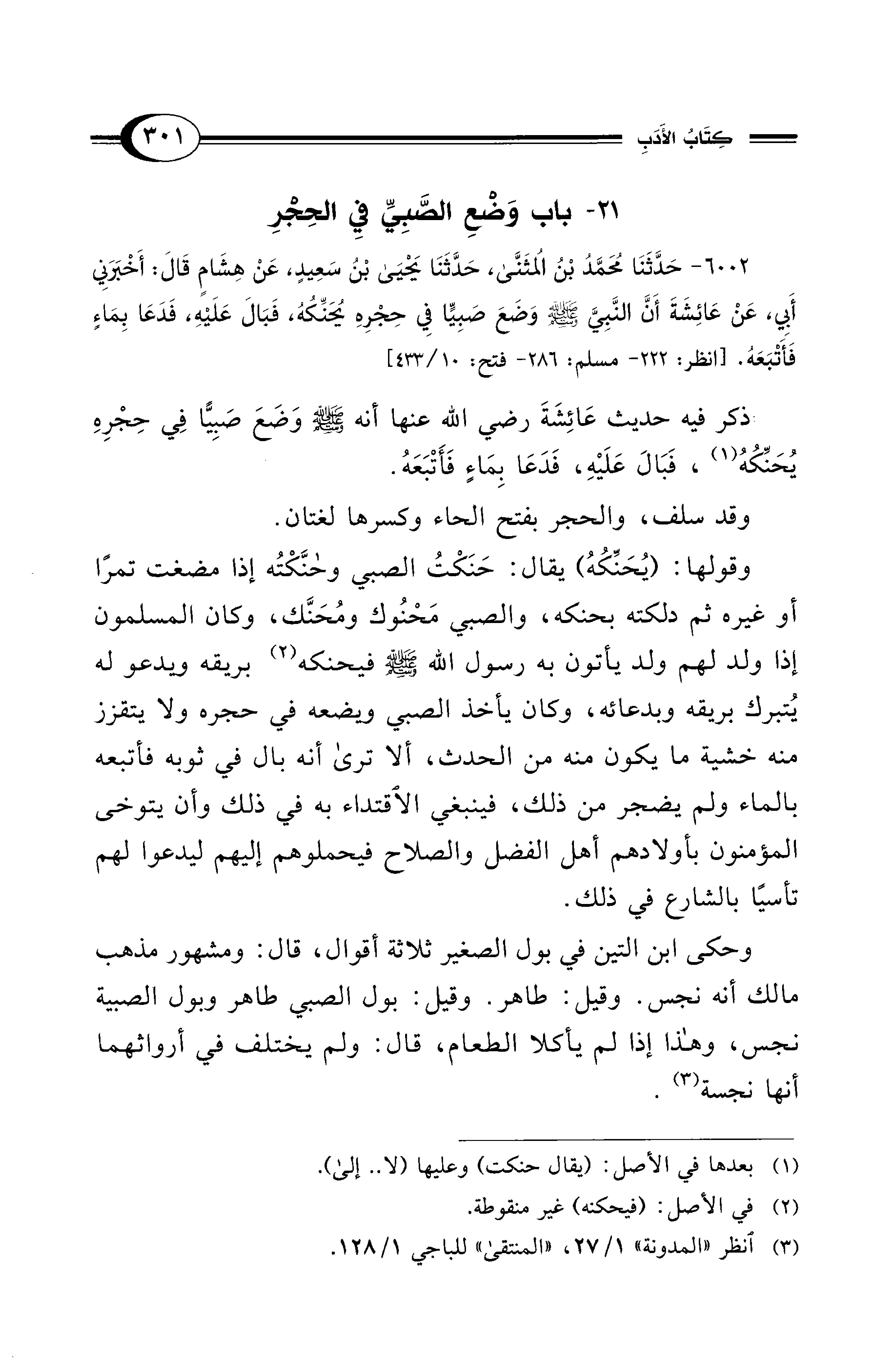 6002 - حَدَّثَنَا مُحَمَّدُ بْنُ الْمُثَنَّى، حَدَّثَنَا يَحْيَى بْنُ سَعِيدٍ، عَنْ هِشَامٍ قَالَ: أَخْبَرَنِي أَبِي، عَنْ عَائِشَةَ أَنَّ النَّبِيَّ - صلى الله عليه وسلم - وَضَعَ صَبِيًّا فِي حِجْرِهِ يُحَنِّكُهُ، فَبَالَ عَلَيْهِ، فَدَعَا بِمَاءٍ فَأَتْبَعَهُ. [انظر: 222 - مسلم: 286 - فتح: 10/ 433]