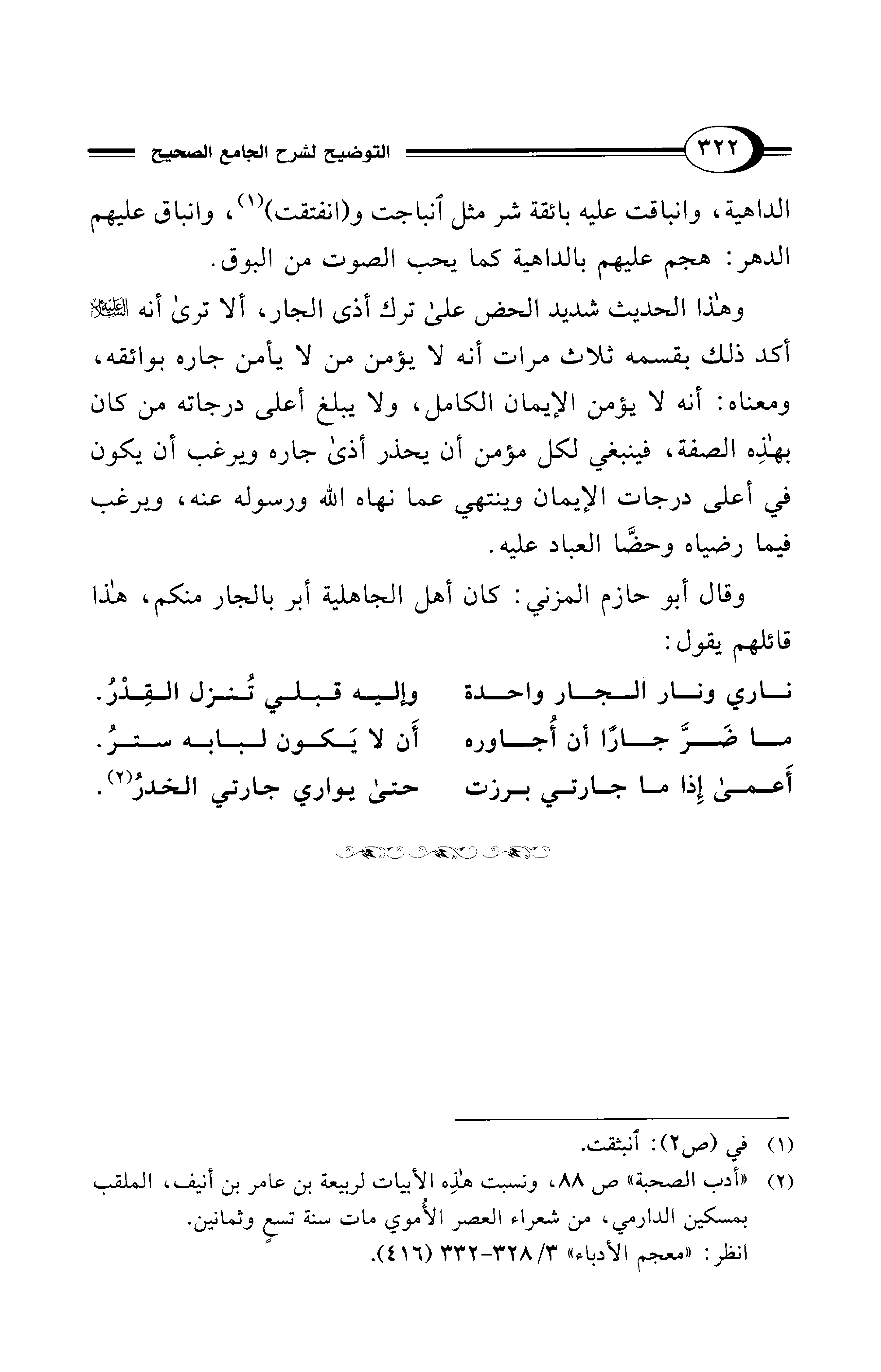(¬2) "أدب الصحبة" ص 88، ونسبت هذِه الأبيات لربيعة بن عامر بن أنيف، الملقب بمسكين الدارمي، من شعراء العصر الأُموي مات سنة تسعٍ وثمانين.
