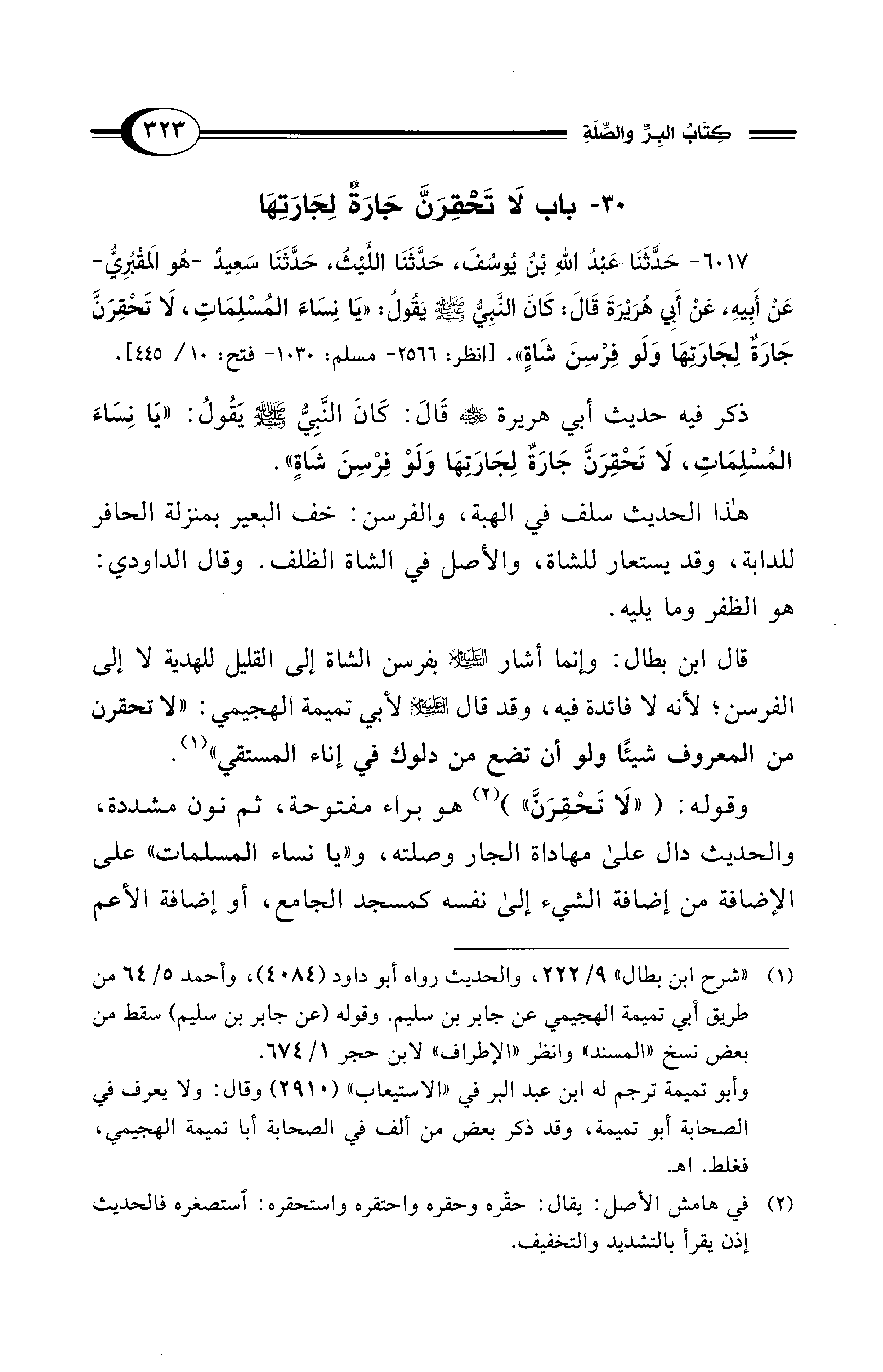6017 - حَدَّثَنَا عَبْدُ اللهِ بْنُ يُوسُفَ، حَدَّثَنَا اللَّيْثُ، حَدَّثَنَا سَعِيدٌ -هُوَ الْمَقْبُرِيُّ- عَنْ أَبِيهِ، عَنْ أَبِي هُرَيْرَةَ قَالَ: كَانَ النَّبِيُّ - صلى الله عليه وسلم - يَقُولُ: «يَا نِسَاءَ الْمُسْلِمَاتِ، لاَ تَحْقِرَنَّ جَارَةٌ لِجَارَتِهَا وَلَوْ فِرْسِنَ شَاةٍ». [انظر: 2566 - مسلم: 1030 - فتح: 10/ 445].
