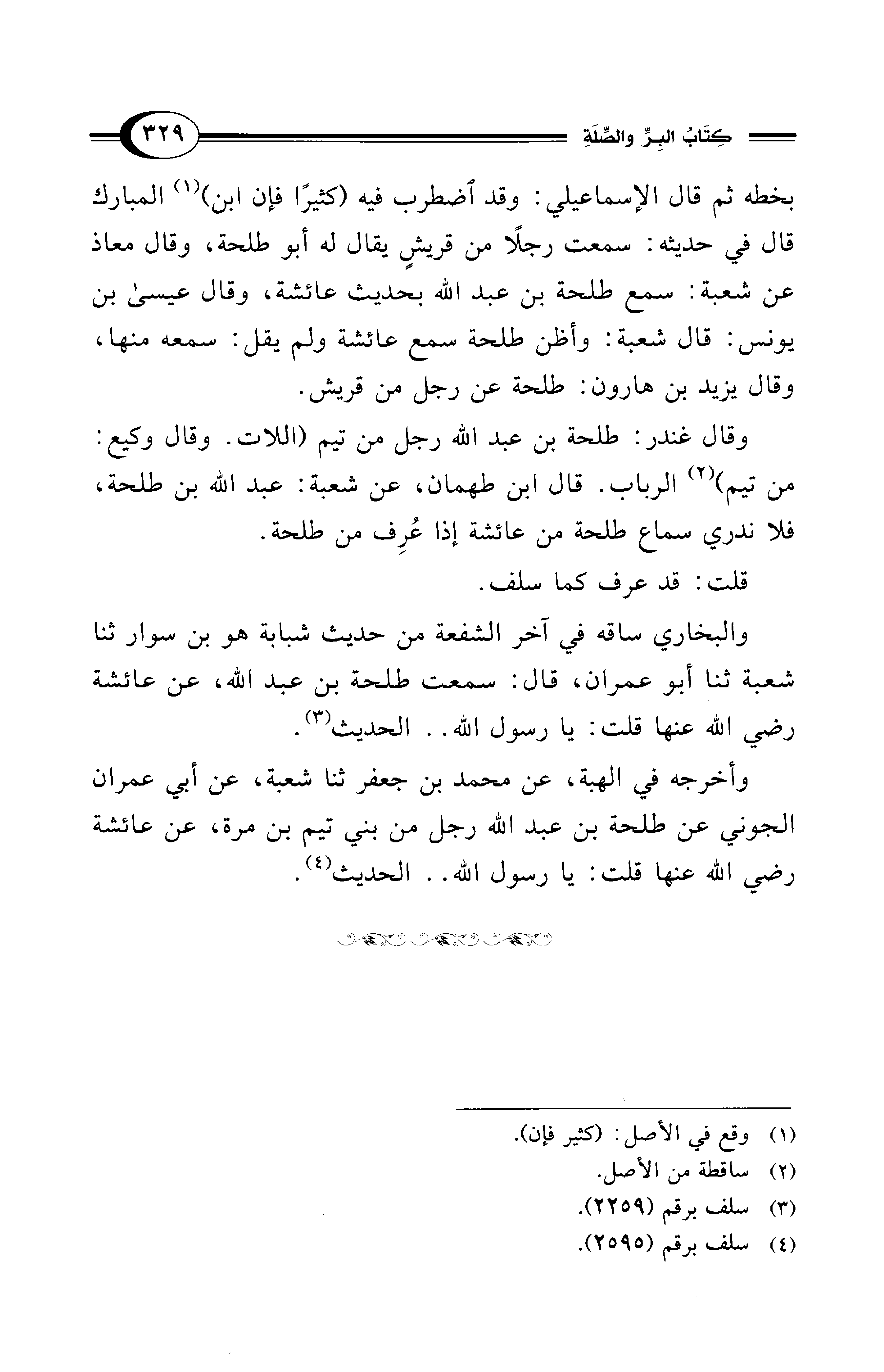 بخطه ثم قال الإسماعيلي: وقد اضطرب فيه (كثيراً فإن ابن) (¬1) المبارك قال في حديثه: سمعت رجلاً من قريشٍ يقال له أبو طلحة، وقال معاذ عن شعبة: سمع طلحة بن عبد الله بحديث عائشة، وقال عيسى بن يونس: قال شعبة: وأظن طلحة سمع عائشة ولم يقل: سمعه منها، وقال يزيد بن هارون: طلحة عن رجل من قريش.