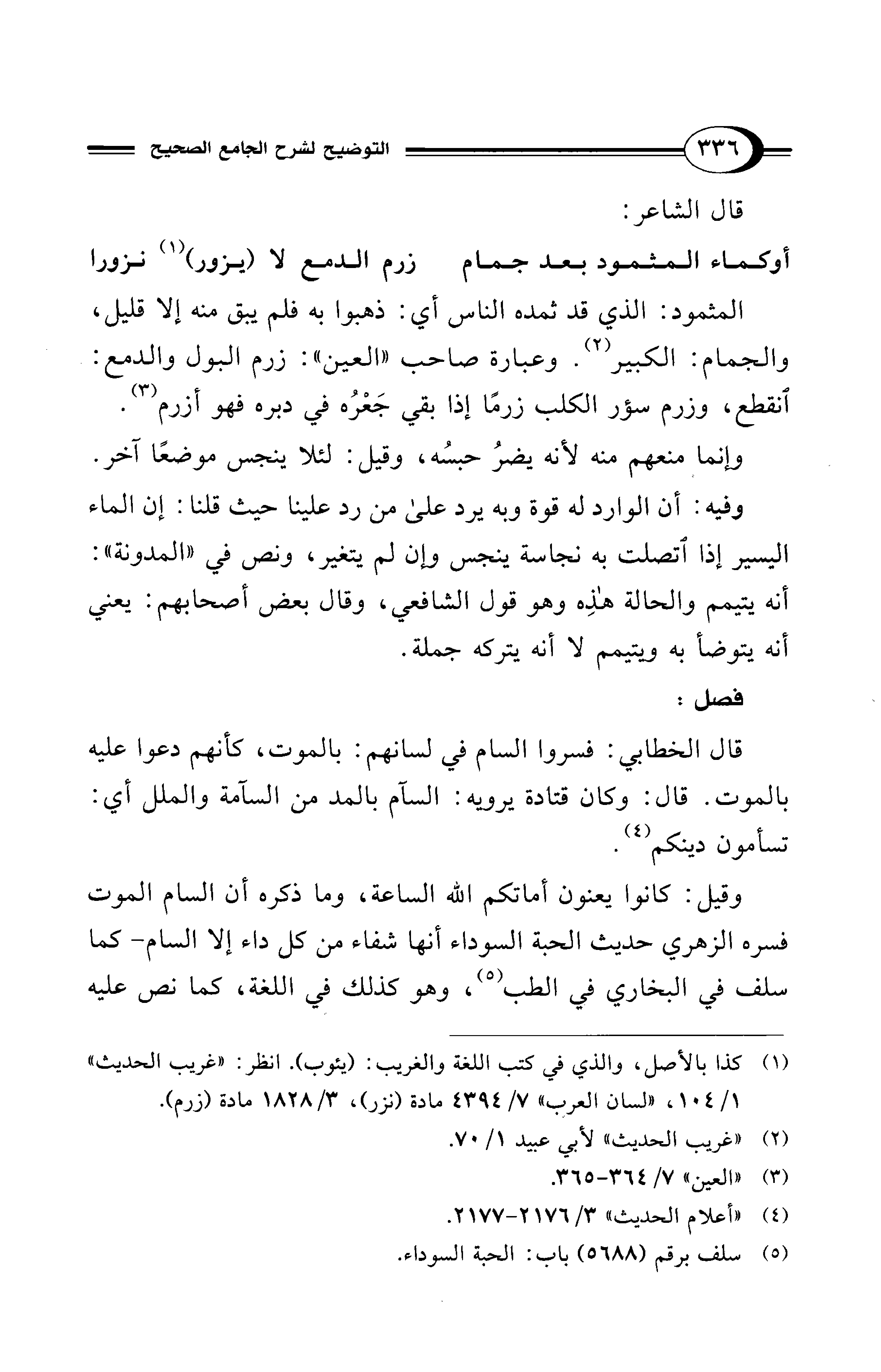 قال الخطابي: فسروا السام في لسانهم: بالموت، كأنهم دعوا عليه بالموت. قال: وكان قتادة يرويه: السآم بالمد من السآمة والملل أي: تسأمون دينكم (¬4).