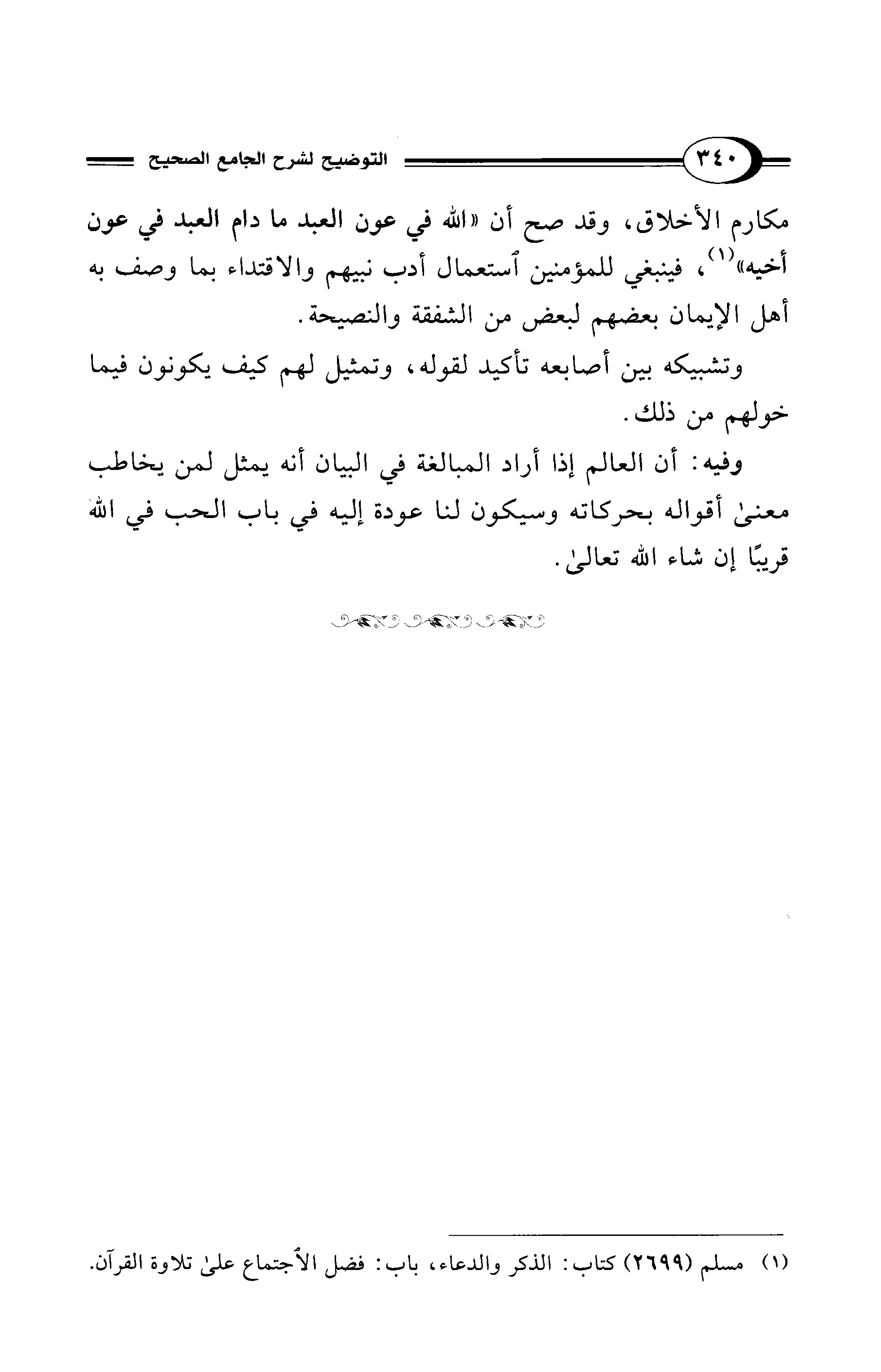 مكارم الأخلاق، وقد صح أن "الله في عون العبد ما دام العبد في عون أخيه" (¬1)، فينبغي للمؤمنين استعمال أدب نبيهم والاقتداء بما وصف به أهل الإيمان بعضهم لبعض من الشفقة والنصيحة.