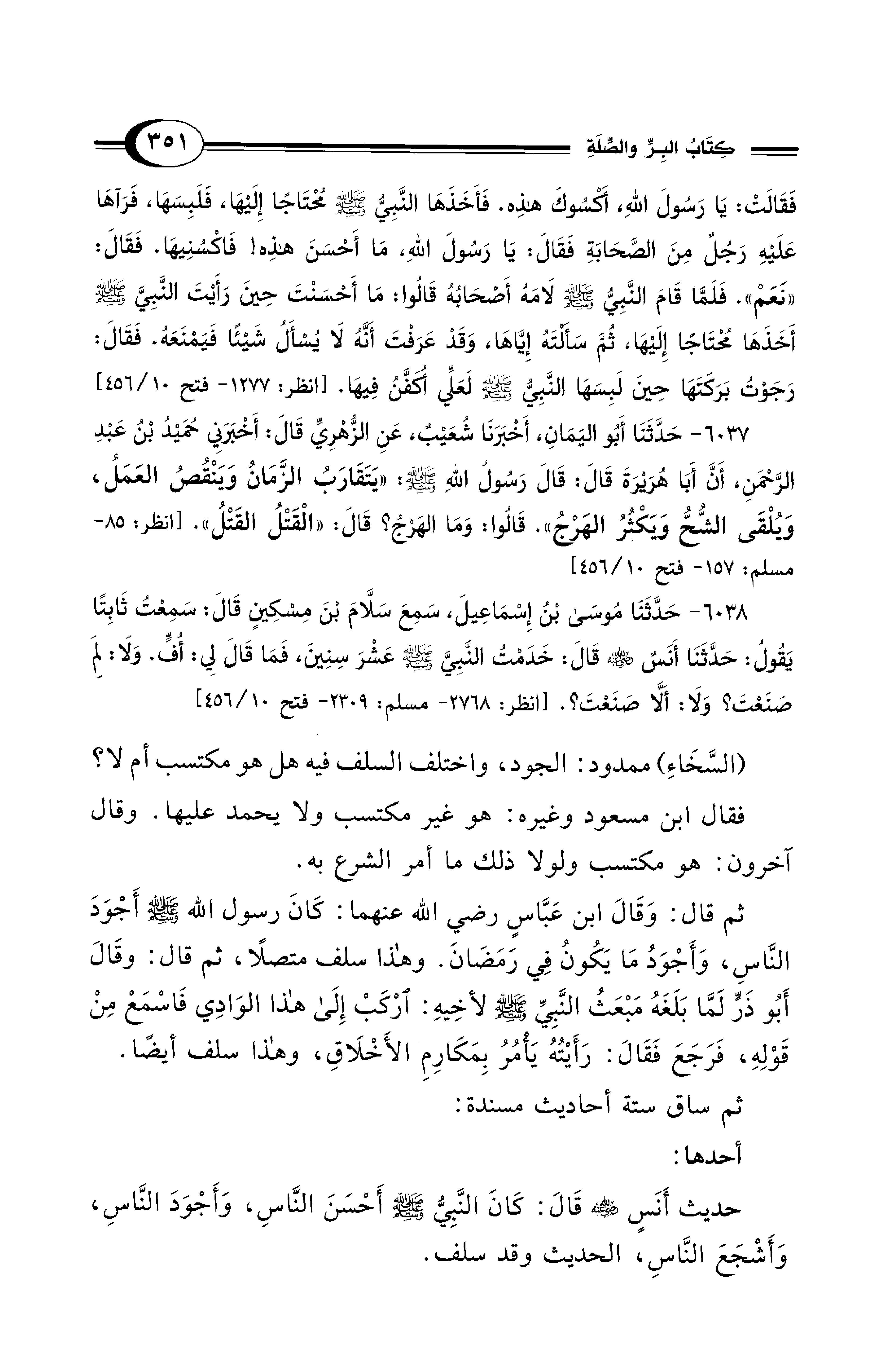 6038 - حَدَّثَنَا مُوسَى بْنُ إِسْمَاعِيلَ، سَمِعَ سَلاَّمَ بْنَ مِسْكِينٍ قَالَ: سَمِعْتُ ثَابِتًا يَقُولُ: حَدَّثَنَا أَنَسٌ - رضي الله عنه - قَالَ: خَدَمْتُ النَّبِيَّ - صلى الله عليه وسلم - عَشْرَ سِنِينَ، فَمَا قَالَ لِي: أُفٍّ. وَلاَ: لِمَ صَنَعْتَ؟ وَلاَ: أَلاَّ صَنَعْتَ؟. [انظر: 2768 - مسلم: 2309 - فتح 10/ 456]