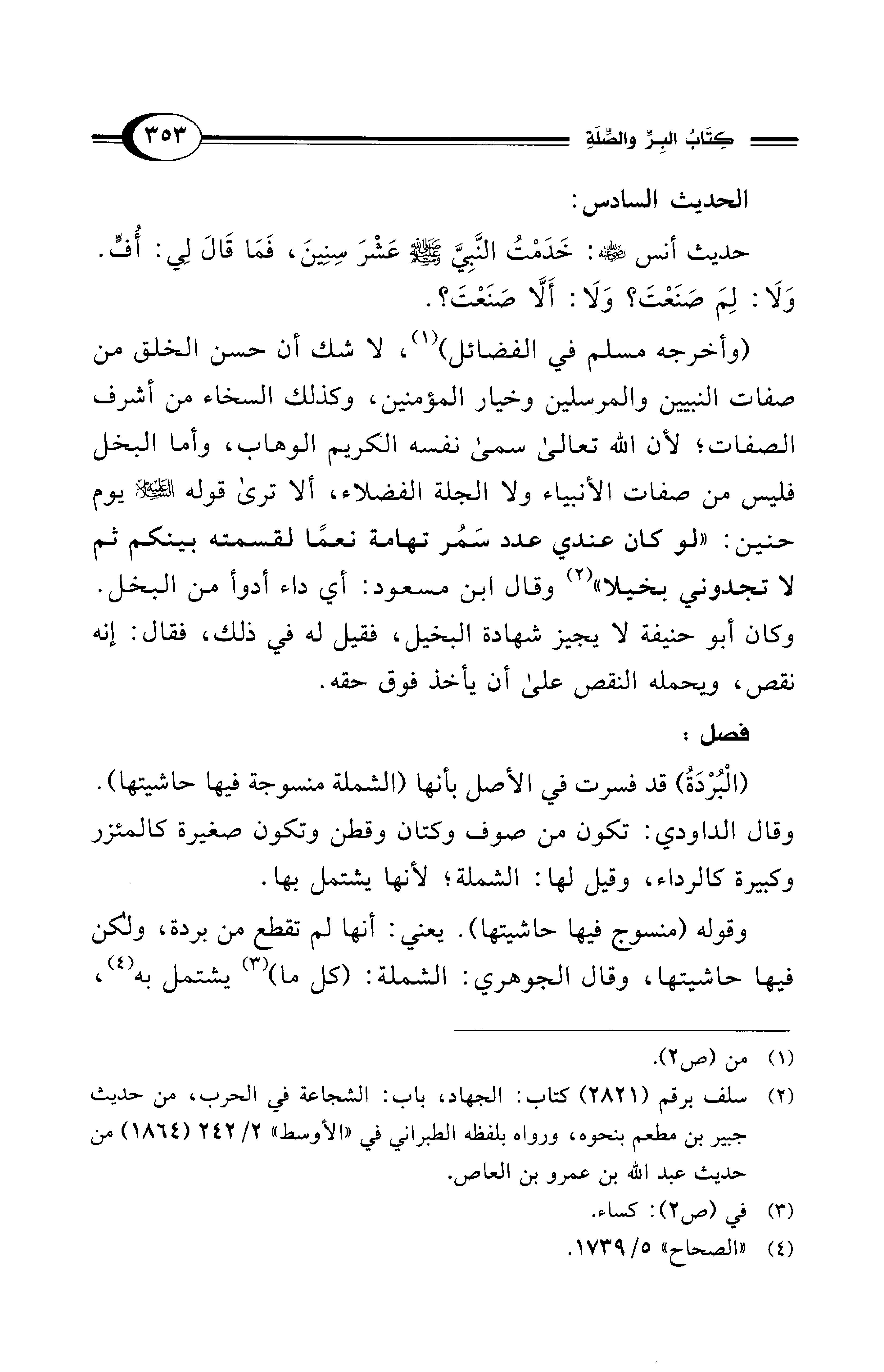 حديث أنس - رضي الله عنه -: خَدَمْتُ النَّبِيَّ - صلى الله عليه وسلم - عَشْرَ سِنِينَ، فَمَا قَالَ لِي: أُفٍّ. وَلَا: لِمَ صَنَعْتَ؟ وَلَا: أَلَّا صَنَعْتَ؟.