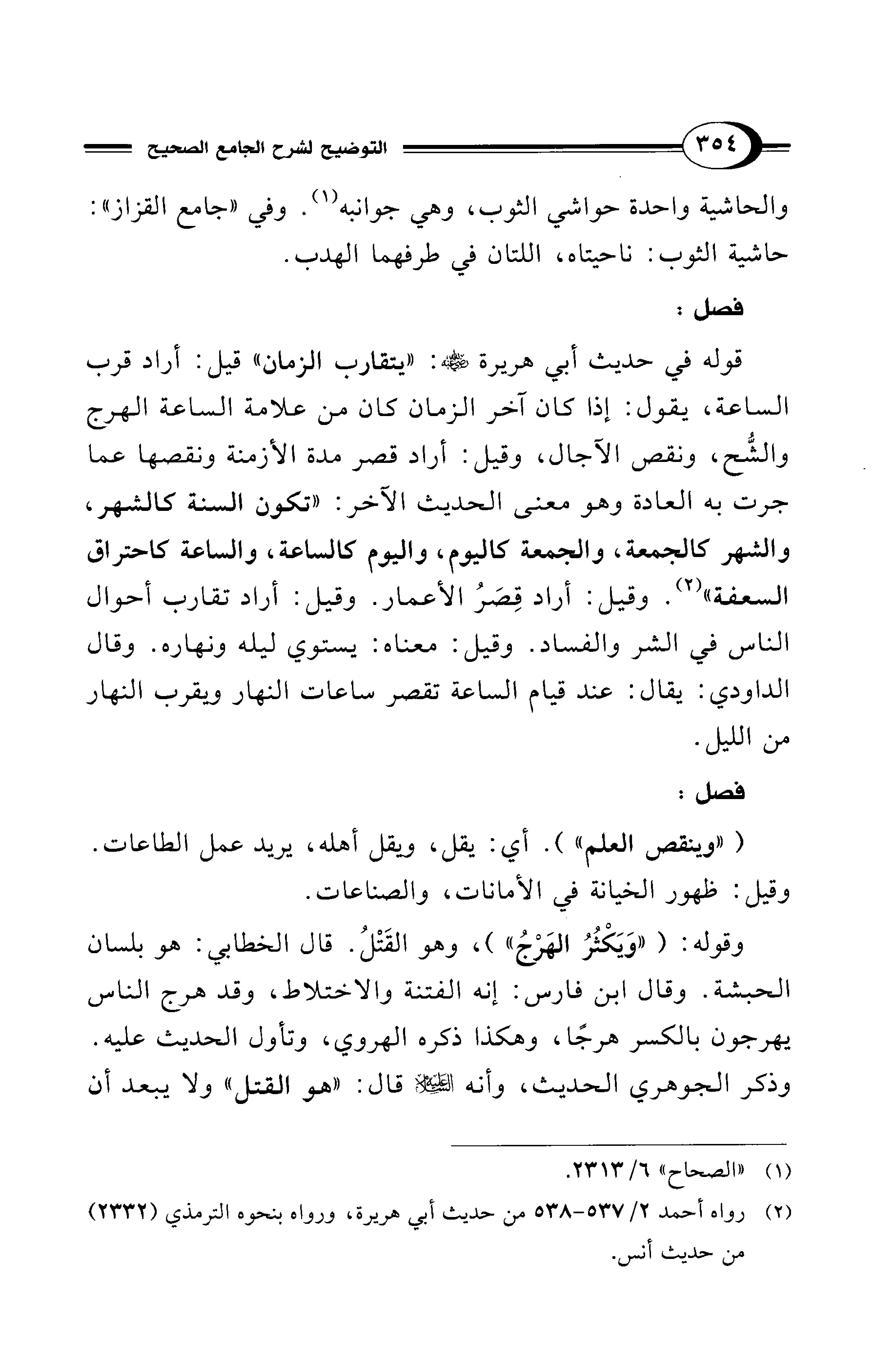 قوله في حديث أبي هريرة - رضي الله عنه -: "يتقارب الزمان" قيل: أراد قرب الساعة، يقول: إذا كان آخر الزمان كان من علامة الساعة الهرج والشُّح، ونقص الآجال، وقيل: أراد قصر مدة الأزمنة ونقصها عما جرت به العادة وهو معنى الحديث الآخر: "تكون السنة كالشهر، والشهر كالجمعة، والجمعة كاليوم، واليوم كالساعة، والساعة كاحتراق السعفة" (¬2). وقيل: أراد قِصرُ الأعمار. وقيل: أراد تقارب أحوال الناس في الشر والفساد. وقيل: معناه: يستوي ليله ونهاره. وقال الداودي: يقال: عند قيام الساعة تقصر ساعات النهار ويقرب النهار من الليل.