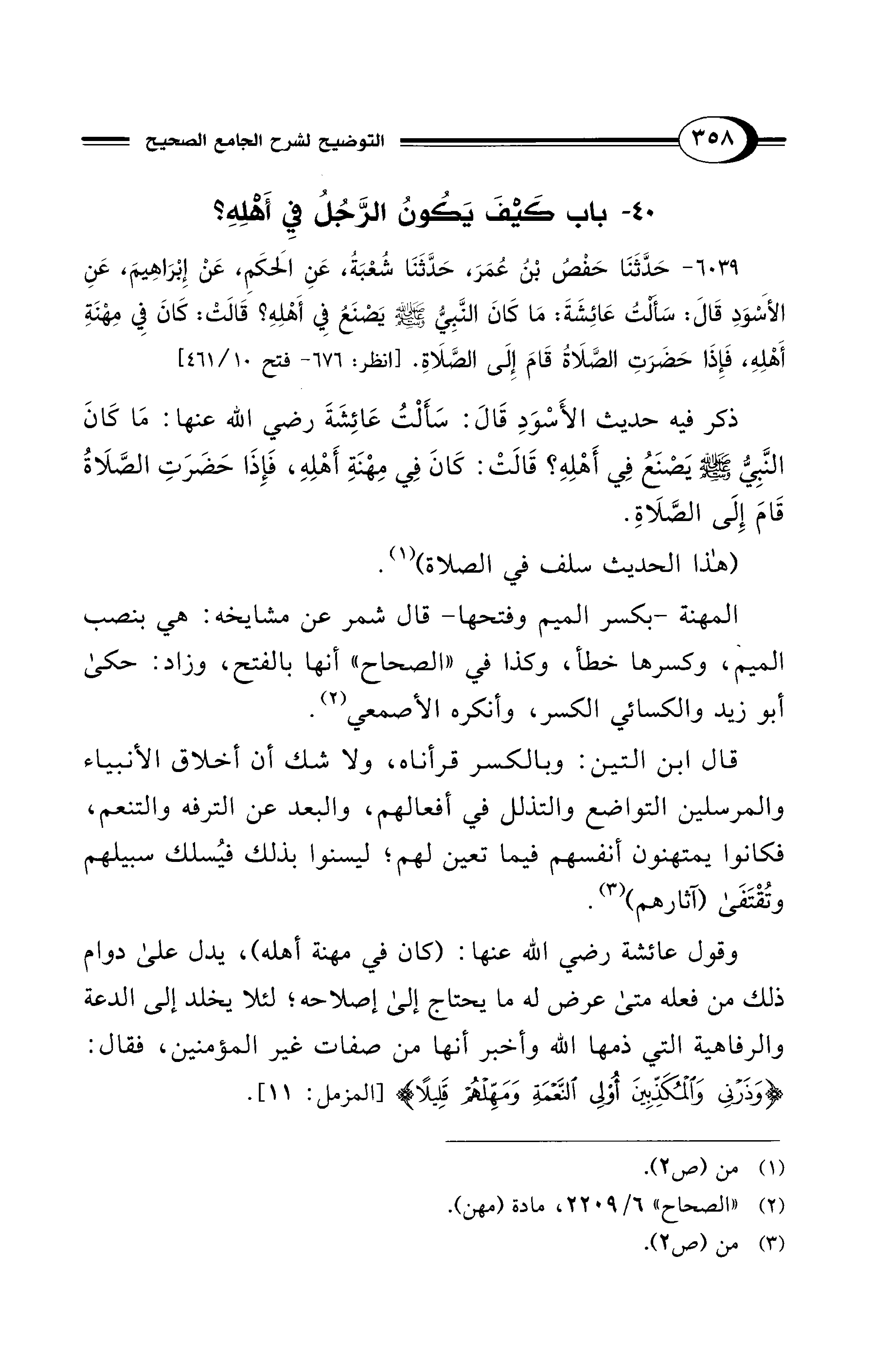 6039 - حَدَّثَنَا حَفْصُ بْنُ عُمَرَ، حَدَّثَنَا شُعْبَةُ، عَنِ الحَكَمِ، عَنْ إِبْرَاهِيمَ، عَنِ الأَسْوَدِ قَالَ: سَأَلْتُ عَائِشَةَ: مَا كَانَ النَّبِيُّ - صلى الله عليه وسلم - يَصْنَعُ فِي أَهْلِهِ؟ قَالَتْ: كَانَ فِي مِهْنَةِ أَهْلِهِ، فَإِذَا حَضَرَتِ الصَّلاَةُ قَامَ إِلَى الصَّلاَةِ. [انظر: 676 - فتح 10/ 461]