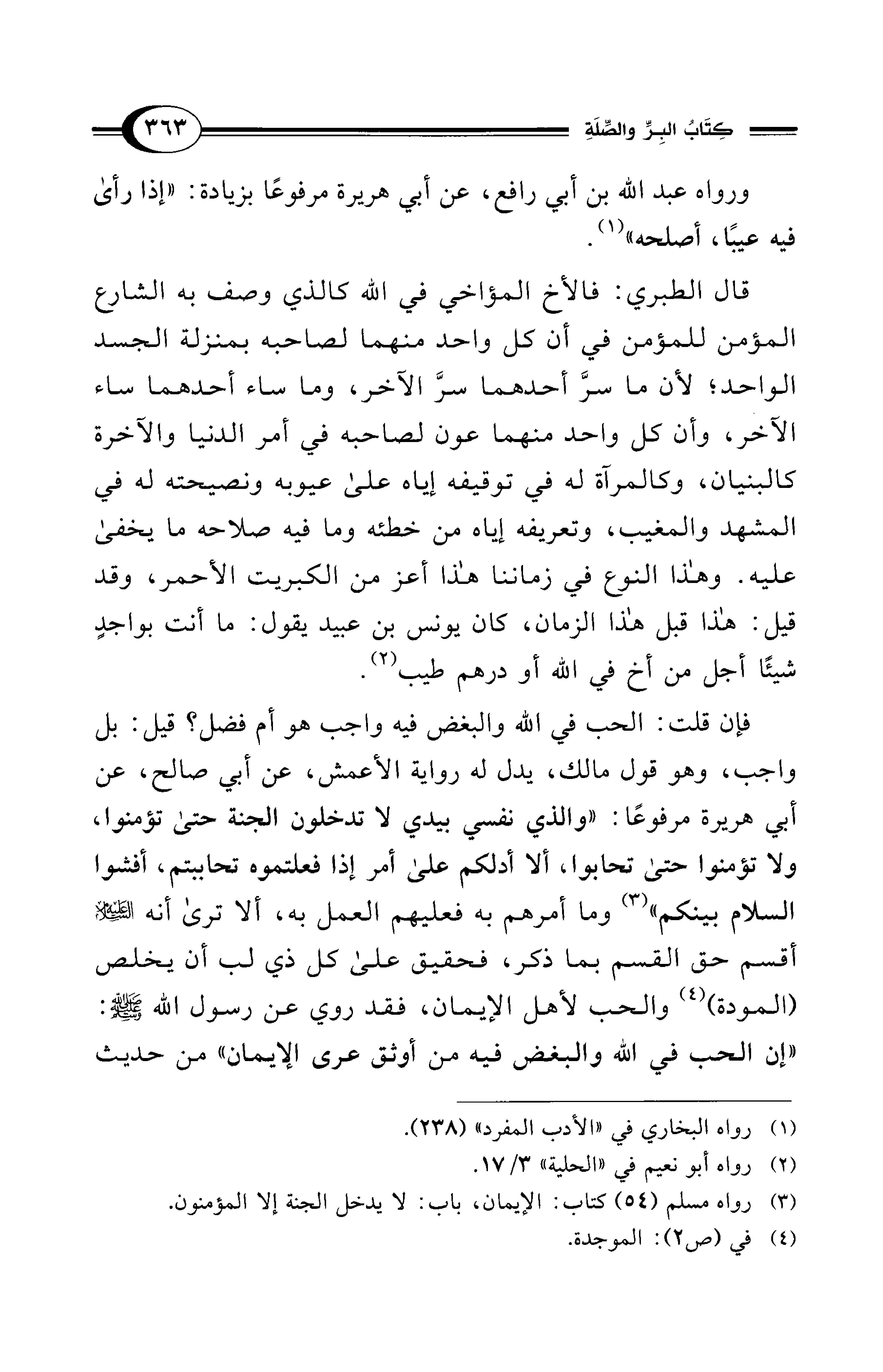 قال الطبري: فالأخ المؤاخي في الله كالذي وصف به الشارع المؤمن للمؤمن في أن كل واحد منهما لصاحبه بمنزلة الجسد الواحد؛ لأن ما سرَّ أحدهما سرَّ الآخر، وما ساء أحدهما ساء الآخر، وأن كل واحد منهما عون لصاحبه في أمر الدنيا والآخرة كالبنيان، وكالمرآة له في توقيفه إياه على عيوبه ونصيحته له في المشهد والمغيب، وتعريفه إياه من خطئه وما فيه صلاحه ما يخفى عليه. وهذا النوع في زماننا هذا أعز من الكبريت الأحمر، وقد قيل: هذا قبل هذا الزمان، كان يونس بن عبيد يقول: ما أنت بواجدٍ شيئًا أجل من أخ في الله أو درهم طيب (¬2).