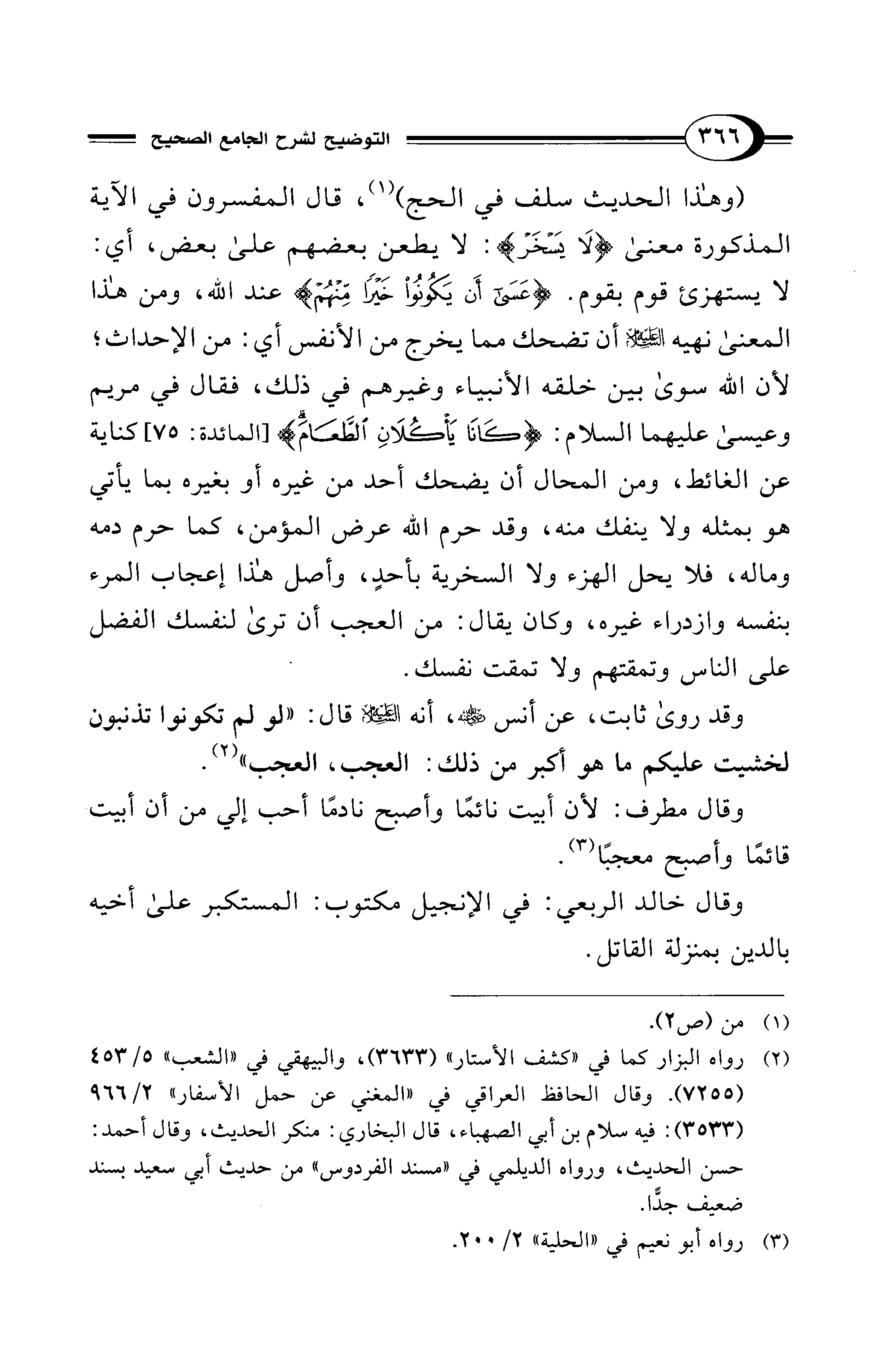 (وهذا الحديث سلف في الحج) (¬1)، قال المفسرون في الآية المذكورة معنى {لَا يَسْخَرْ}: لا يطعن بعضهم على بعض، أي: لا يستهزئ قوم بقوم. {عَسَى أَنْ يَكُونُوا خَيْرًا مِنْهُمْ} عند الله، ومن هذا المعنى نهيه - عليه السلام - أن تضحك مما يخرج من الأنفس أي: من الإحداث؛ لأن الله سوى بين خلقه الأنبياء وغيرهم في ذلك، فقال في مريم وعيسى عليهما السلام: {كَانَا يَأْكُلَانِ الطَّعَامَ} [المائدة: 75] كناية عن الغائط، ومن المحال أن يضحك أحد من غيره أو بغيره بما يأتي هو بمثله ولا ينفك منه، وقد حرم الله عرض المؤمن، كما حرم دمه وماله، فلا يحل الهزء ولا السخرية بأحدٍ، وأصل هذا إعجاب المرء بنفسه وازدراء غيره، وكان يقال: من العجب أن ترى لنفسك الفضل على الناس وتمقتهم ولا تمقت نفسك.