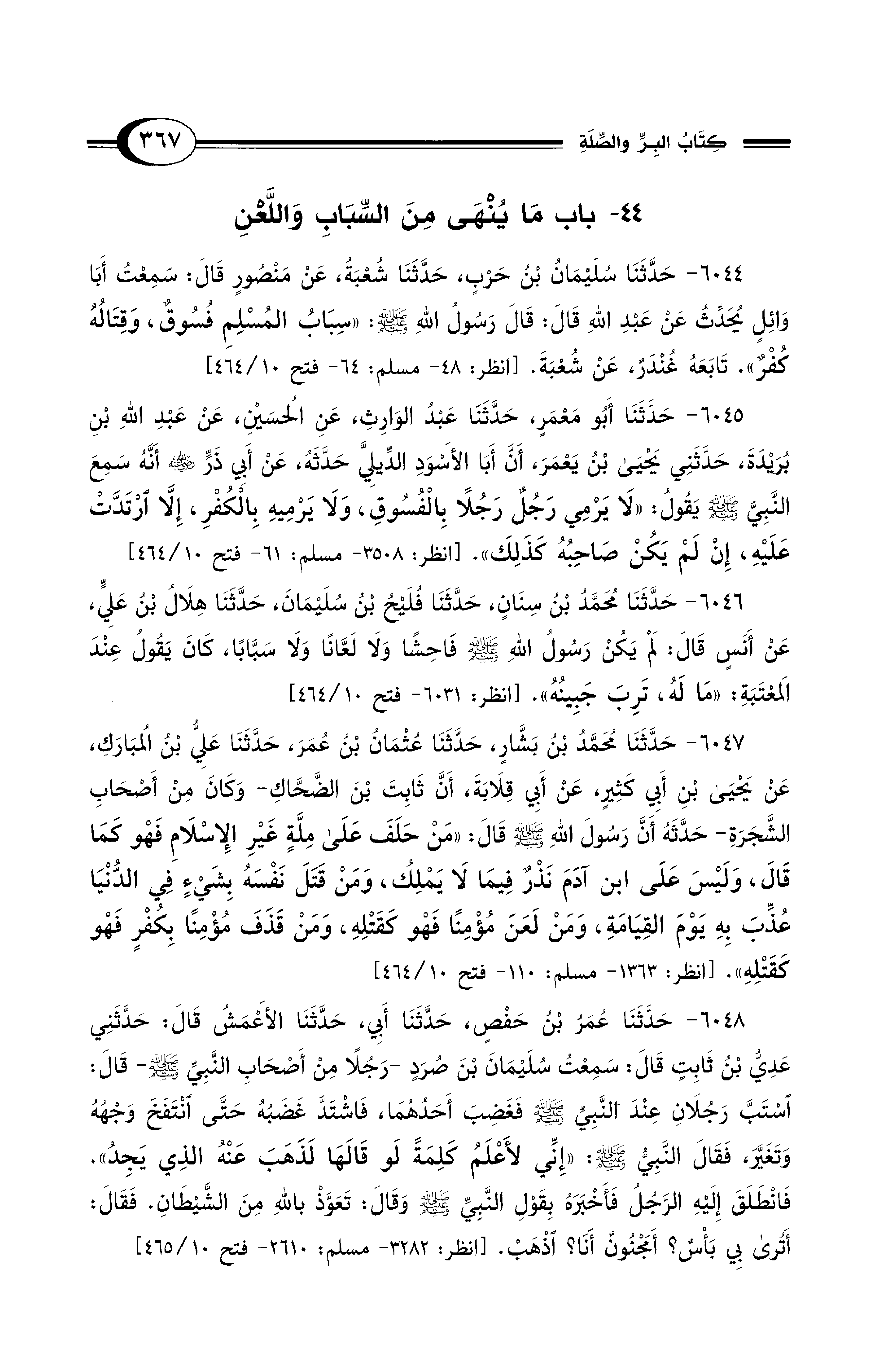 6044 - حَدَّثَنَا سُلَيْمَانُ بْنُ حَرْبٍ، حَدَّثَنَا شُعْبَةُ، عَنْ مَنْصُورٍ قَالَ: سَمِعْتُ أَبَا وَائِلٍ يُحَدِّثُ عَنْ عَبْدِ اللهِ قَالَ: قَالَ رَسُولُ اللهِ - صلى الله عليه وسلم -: «سِبَابُ الْمُسْلِمِ فُسُوقٌ، وَقِتَالُهُ كُفْرٌ». تَابَعَهُ غُنْدَرٌ، عَنْ شُعْبَةَ. [انظر: 48 - مسلم: 64 - فتح 10/ 464]