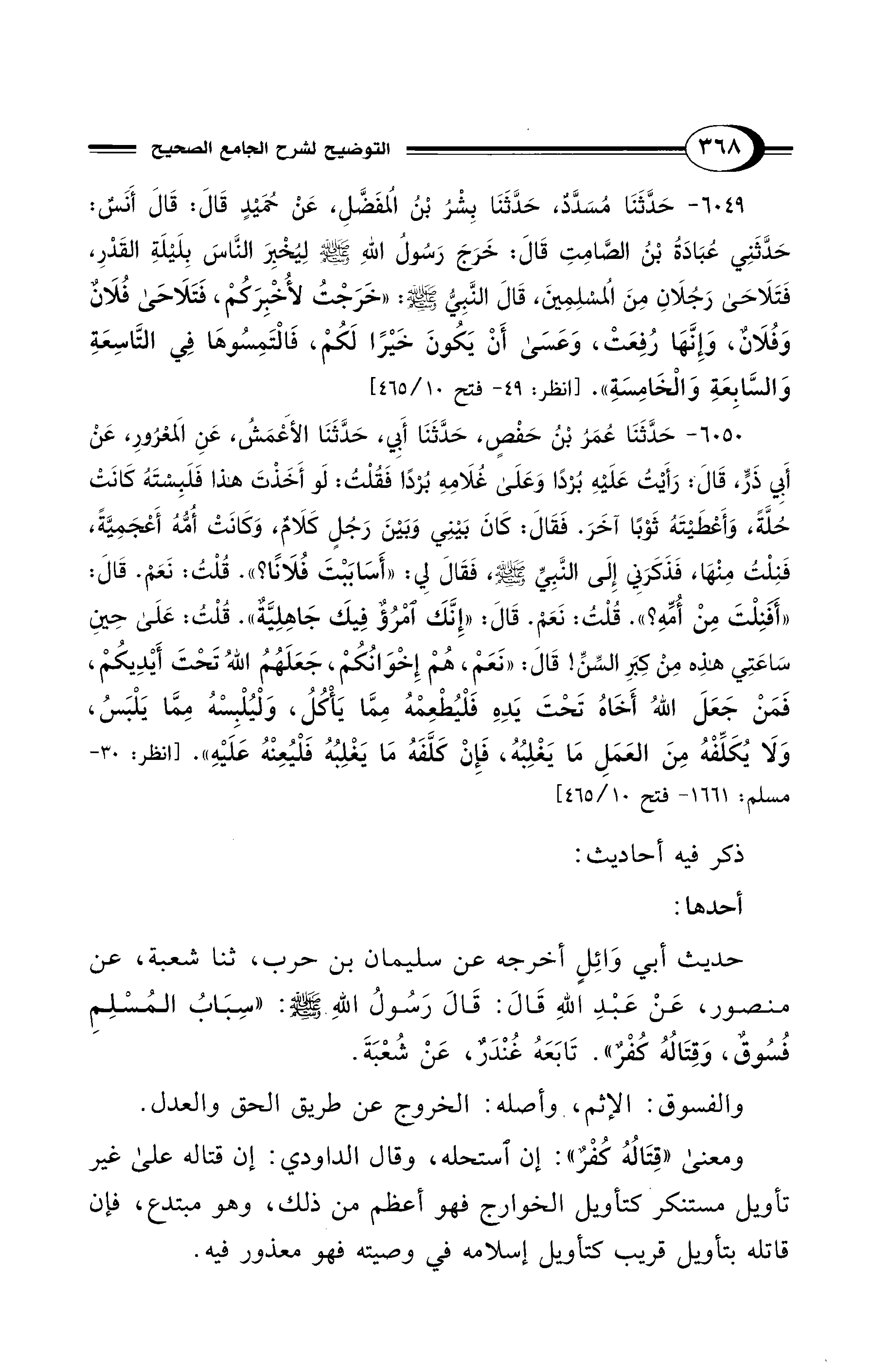 حديث أبي وَائِلٍ أخرجه عن سليمان بن حرب، ثنا شعبة، عن منصور، عَنْ عَبْدِ اللهِ قَالَ: قَالَ رَسُولُ اللهِ - صلى الله عليه وسلم -: "سِبَابُ المُسْلِمِ فُسُوقٌ، وَقِتَالُهُ كُفْرٌ". تَابَعَهُ غُنْدَرٌ، عَنْ شُعْبَةَ.