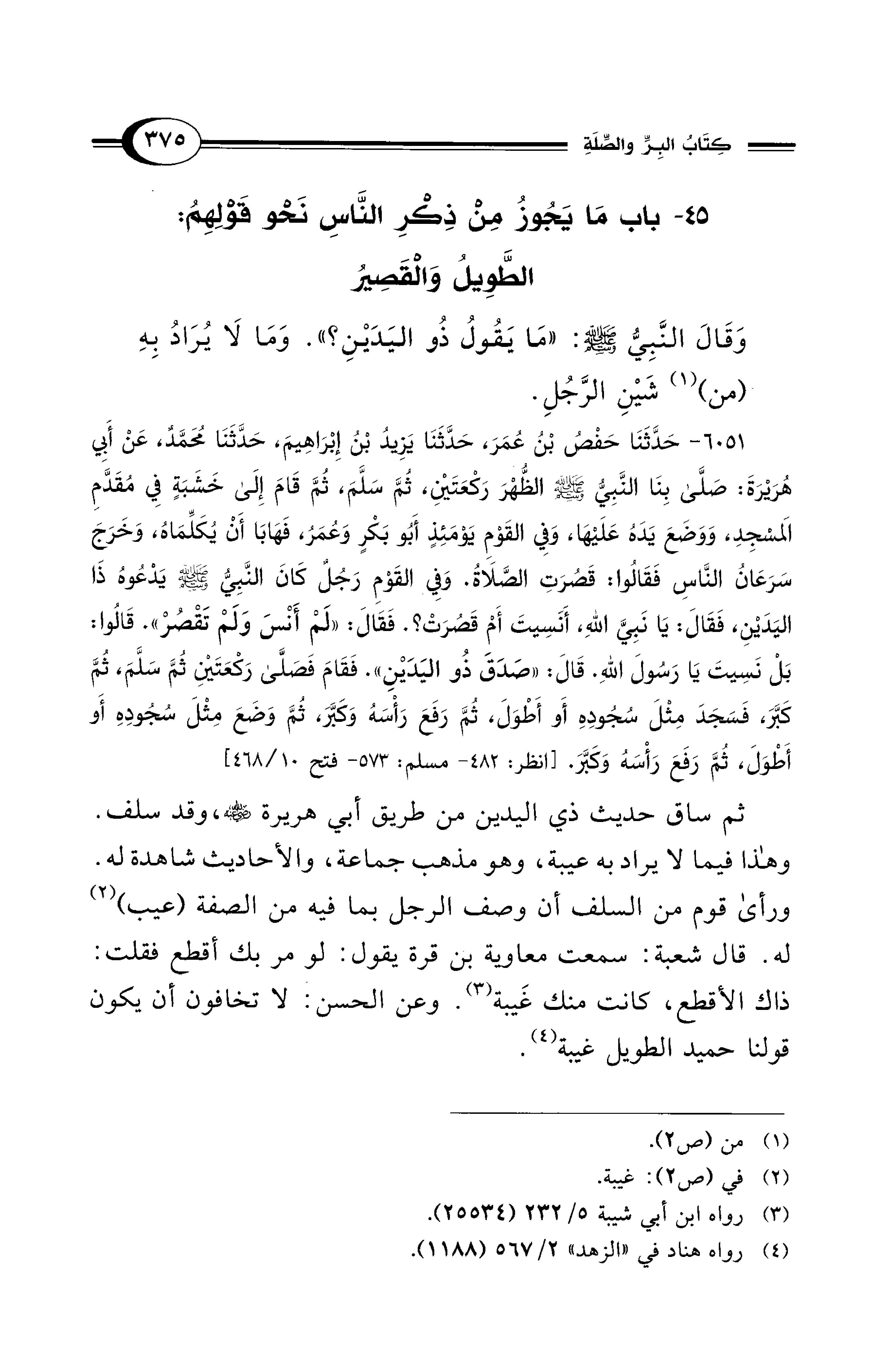 ثم ساق حديث ذي اليدين من طريق أبي هريرة - رضي الله عنه -، وقد سلف. وهذا فيما لا يراد به عيبة، وهو مذهب جماعة، والأحاديث شاهدة له. ورأى قوم من السلف أن وصف الرجل بما فيه من الصفة (عيب) (¬2) له. قال شعبة: سمعت معاوية بن قرة يقول: لو مر بك أقطع فقلت: ذاك الأقطع، كانت منك غَيبة (¬3). وعن الحسن: لا تخافون أن يكون قولنا حميد الطويل غيبة (¬4).