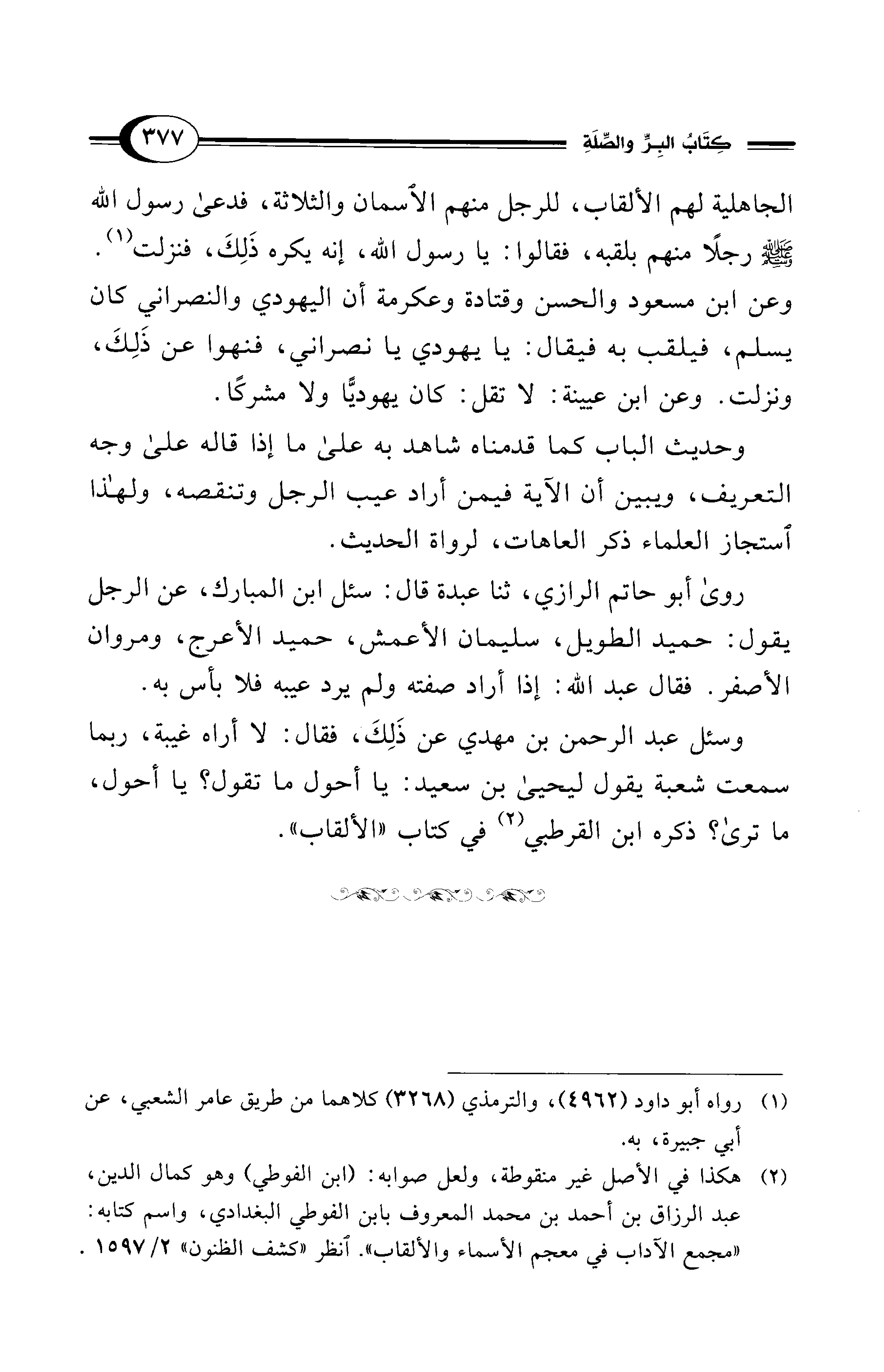 روى أبو حاتم الرازي، ثنا عبدة قال: سئل ابن المبارك، عن الرجل يقول: حميد الطويل، سليمان الأعمش، حميد الأعرج، ومروان الأصفر. فقال عبد الله: إذا أراد صفته ولم يرد عيبه فلا بأس به.