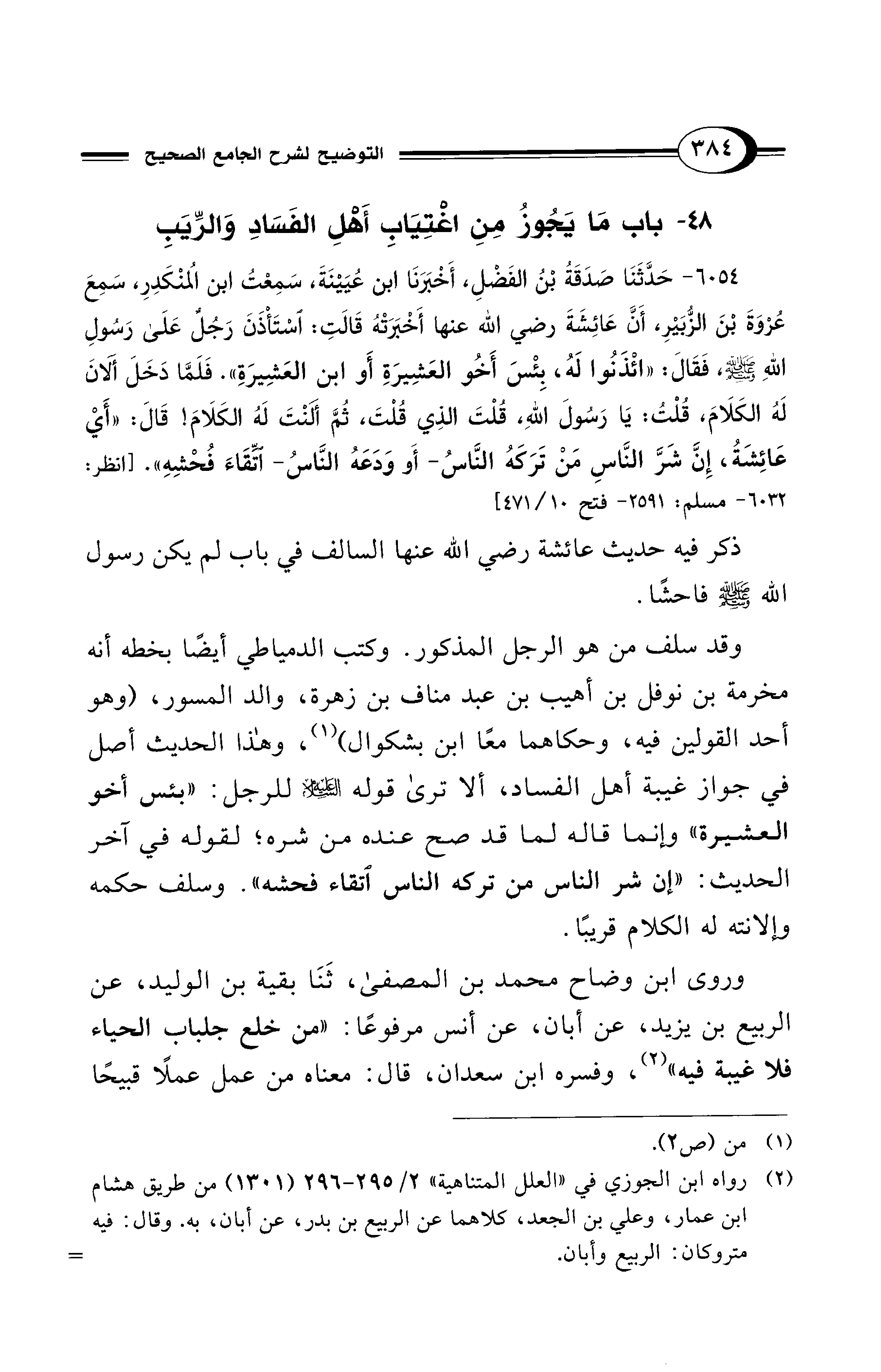6054 - حَدَّثَنَا صَدَقَةُ بْنُ الْفَضْلِ، أَخْبَرَنَا ابْنُ عُيَيْنَةَ، سَمِعْتُ ابْنَ الْمُنْكَدِرِ، سَمِعَ عُرْوَةَ بْنَ الزُّبَيْرِ، أَنَّ عَائِشَةَ - رضي الله عنها - أَخْبَرَتْهُ قَالَتِ: اسْتَأْذَنَ رَجُلٌ عَلَى رَسُولِ اللهِ - صلى الله عليه وسلم -، فَقَالَ: «ائْذَنُوا لَهُ، بِئْسَ أَخُو العَشِيرَةِ أَوِ ابْنُ العَشِيرَةِ». فَلَمَّا دَخَلَ أَلاَنَ لَهُ الْكَلاَمَ، قُلْتُ: يَا رَسُولَ اللهِ، قُلْتَ الَّذِي قُلْتَ، ثُمَّ أَلَنْتَ لَهُ الكَلاَمَ! قَالَ: «أَيْ عَائِشَةُ، إِنَّ شَرَّ النَّاسِ مَنْ تَرَكَهُ النَّاسُ -أَوْ وَدَعَهُ النَّاسُ- اتِّقَاءَ فُحْشِهِ». [انظر: 6032 - مسلم: 2591 - فتح 10/ 471]