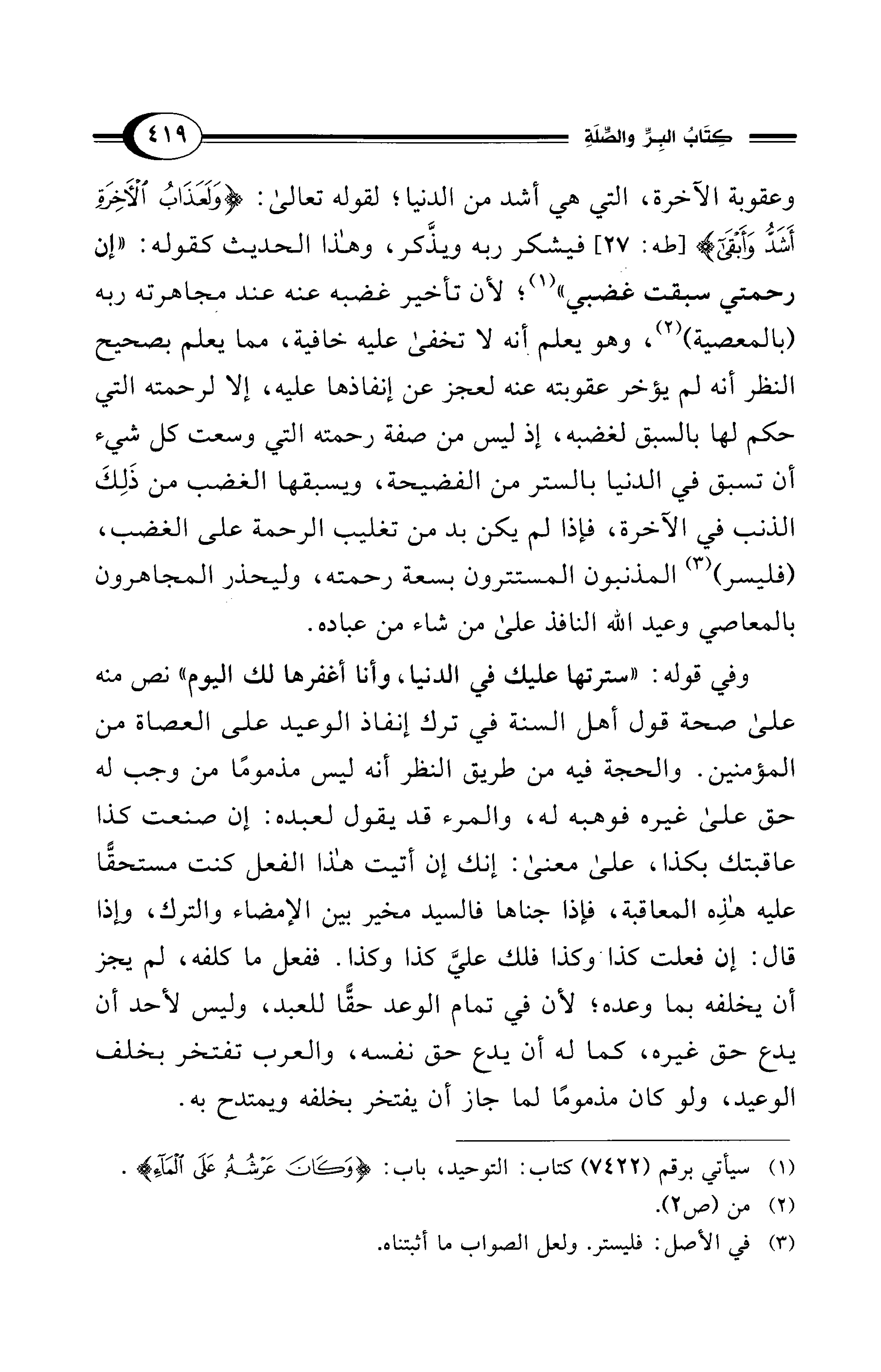 وفي قوله: "سترتها عليك في الدنيا، وأنا أغفرها لك اليوم" نص منه على صحة قول أهل السنة في ترك إنفاذ الوعيد على العصاة من المؤمنين. والحجة فيه من طريق النظر أنه ليس مذمومًا من وجب له حق على غيره فوهبه له، والمرء قد يقول لعبده: إن صنعت كذا عاقبتك بكذا، على معنى: إنك إن أتيت هذا الفعل كنت مستحقًّا عليه هذِه المعاقبة، فإذا جناها فالسيد غير بين الإمضاء والترك، وإذا قال: إن فعلت كذا وكذا فلك عليَّ كذا وكذا. ففعل ما كلفه، لم يجز أن يخلفه بما وعده؛ لأن في تمام الوعد حقًّا للعبد، وليس لأحد أن يدع حق غيره، كما له أن يدع حق نفسه، والعرب تفتخر بخلف الوعيد، ولو كان مذمومًا لما جاز أن يفتخر بخلفه ويمتدح به.