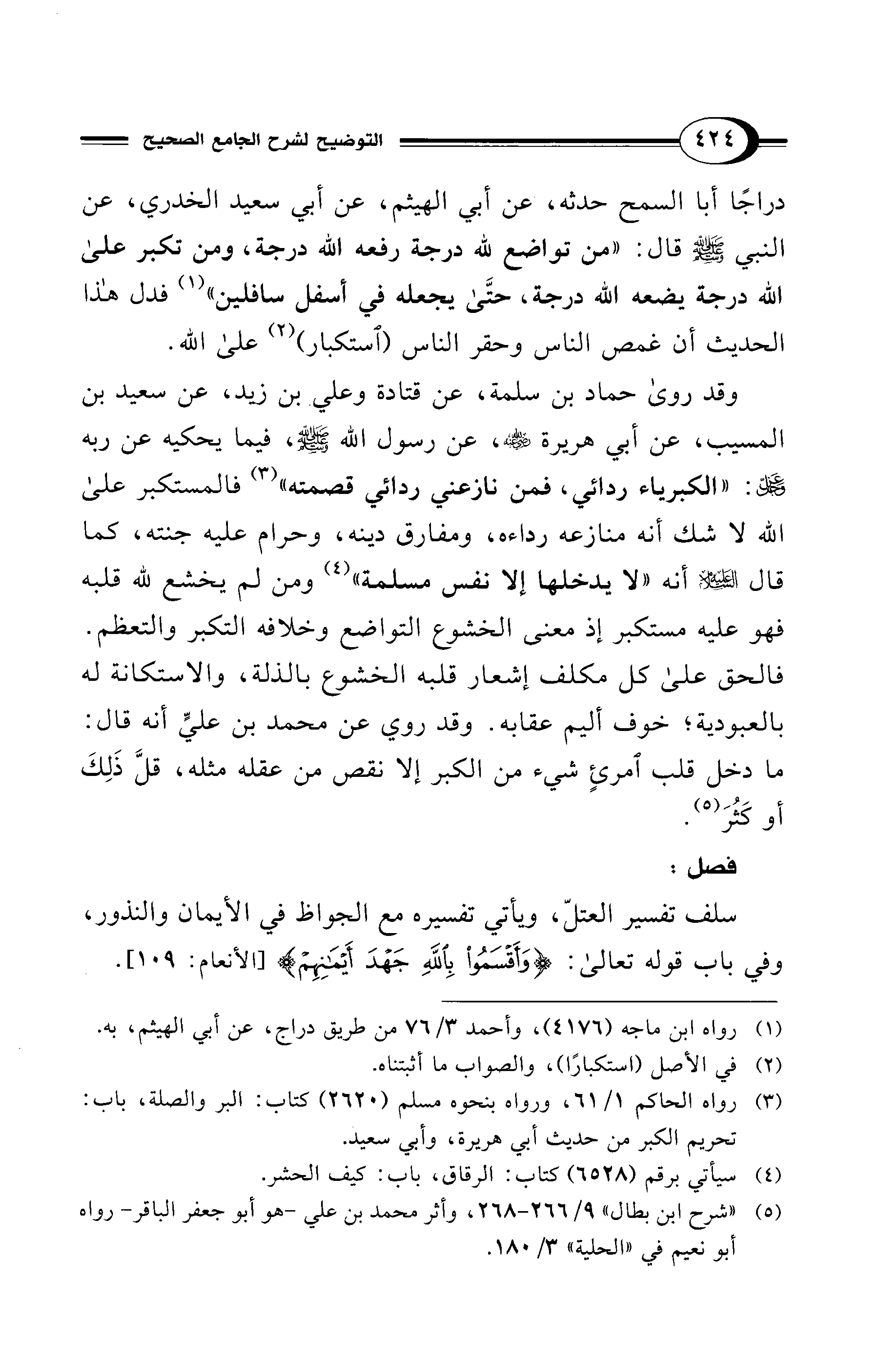دراجًا أبا السمح حدثه، عن أبي الهيثم، عن أبي سعيد الخدري، عن النبي - صلى الله عليه وسلم - قال: "من تواضع لله درجة رفعه الله درجة، ومن تكبر على الله درجة يضعه الله درجة، حتَّى يجعله في أسفل سافلين" (¬1) فدل هذا الحديث أن غمص الناس وحقر الناس (استكبار) (¬2) على الله.