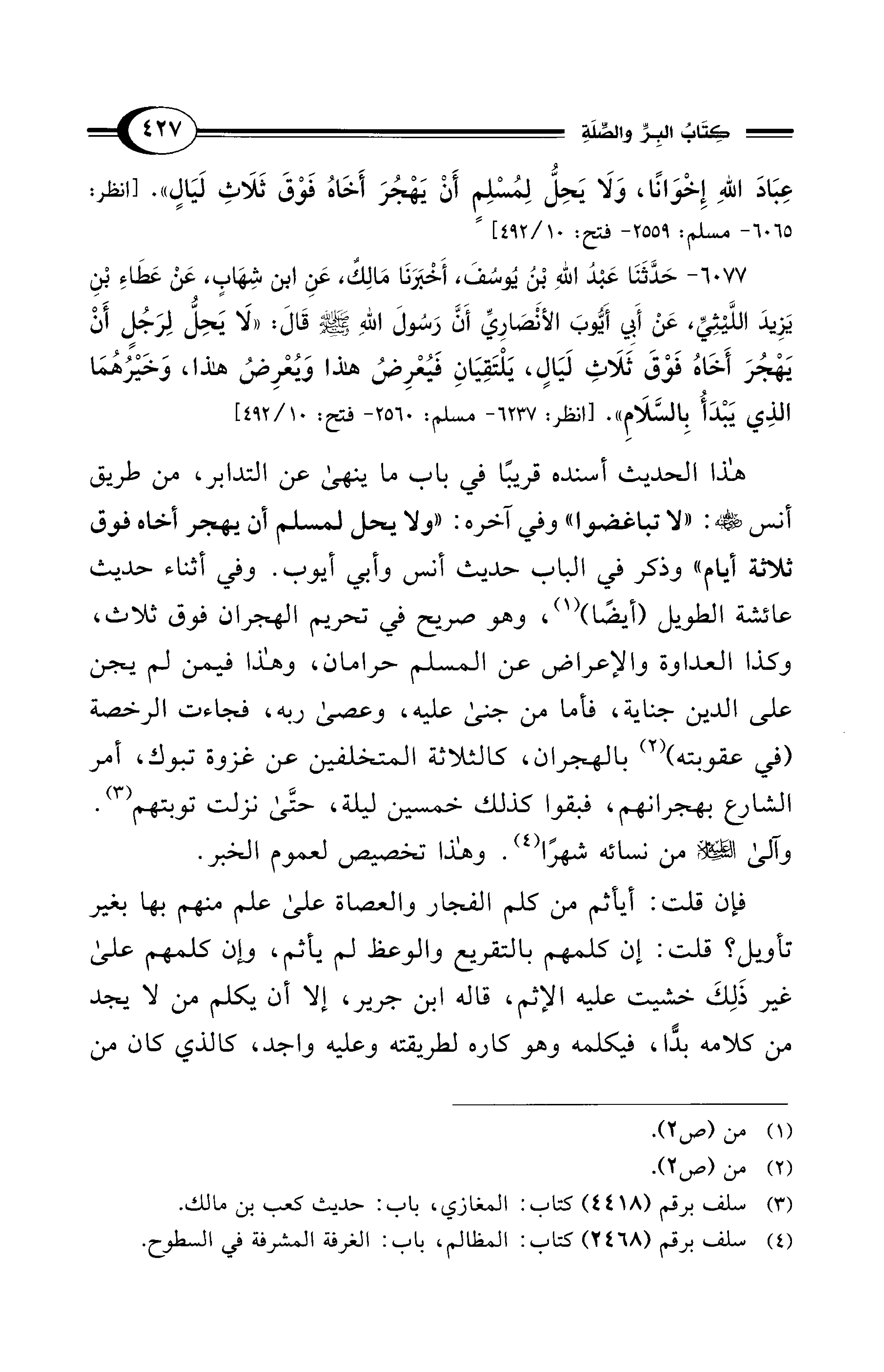 عِبَادَ اللهِ إِخْوَانًا، وَلاَ يَحِلُّ لِمُسْلِمٍ أَنْ يَهْجُرَ أَخَاهُ فَوْقَ ثَلاَثِ لَيَالٍ». [انظر: 6065 - مسلم: 2559 - فتح: 10/ 492]
